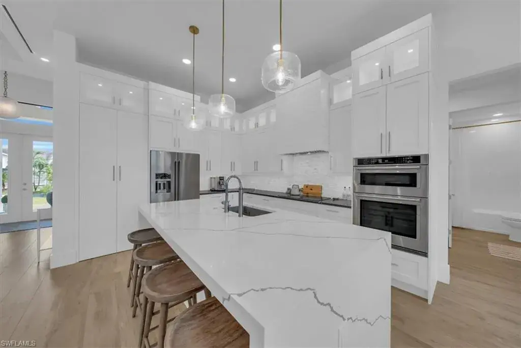 At the heart of the home, the chef’s kitchen impresses with white shaker cabinetry, sleek quartz counters, a stylish tile backsplash, a 36-inch induction oven, and a walk-in pantry all centered around an oversized island made for entertaining. The open-concept living and dining areas flow seamlessly through hurricane-impact glass sliders to the sun-drenched lanai, where your heated pool with Wi-Fi-enabled AquaLink controls overlooks tranquil lake and golf course views in your own private Naples oasis.