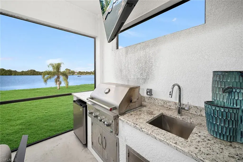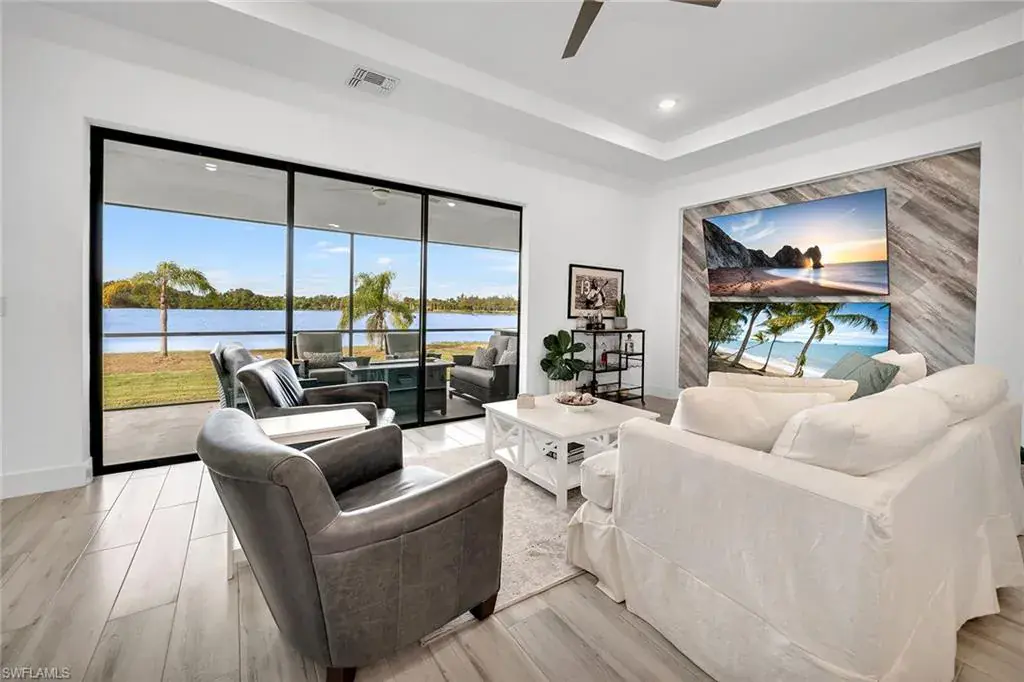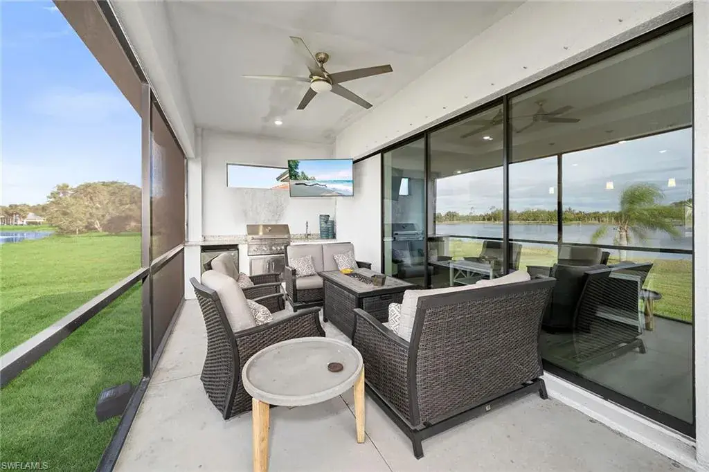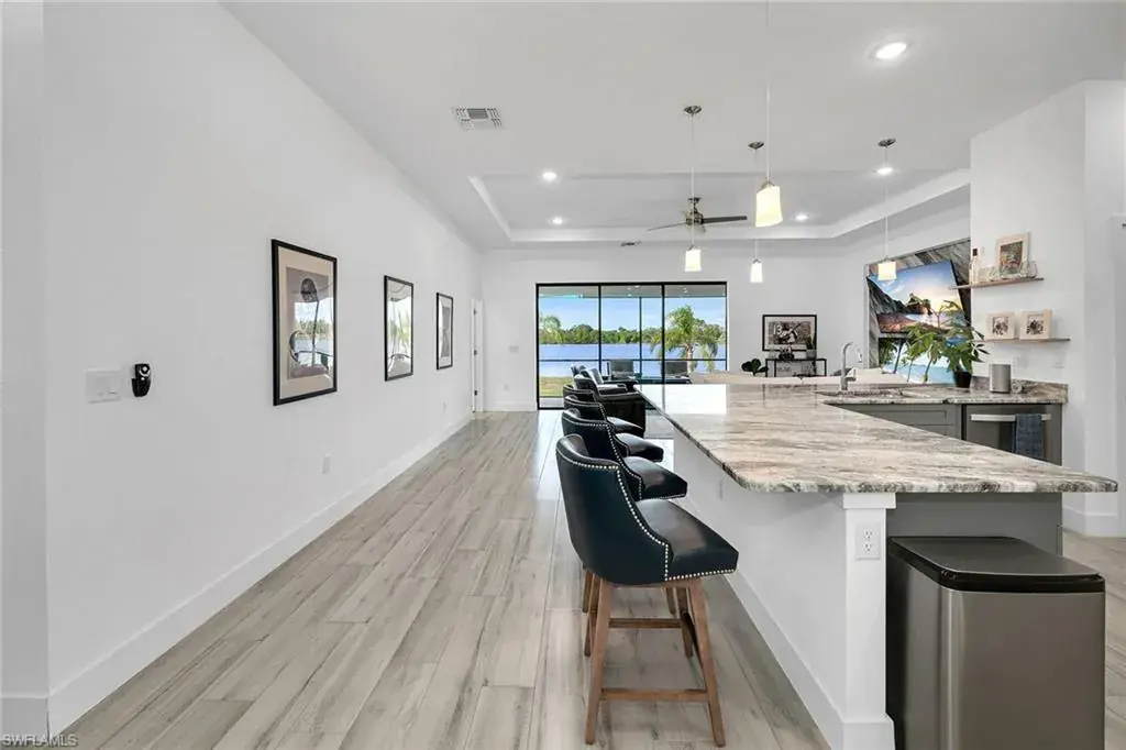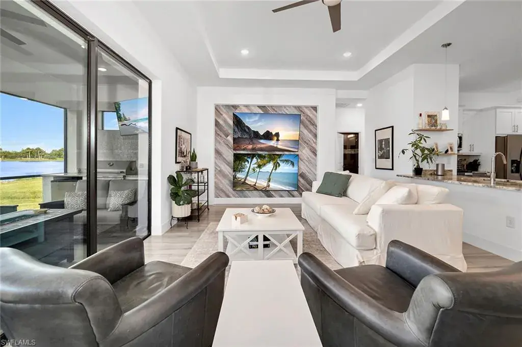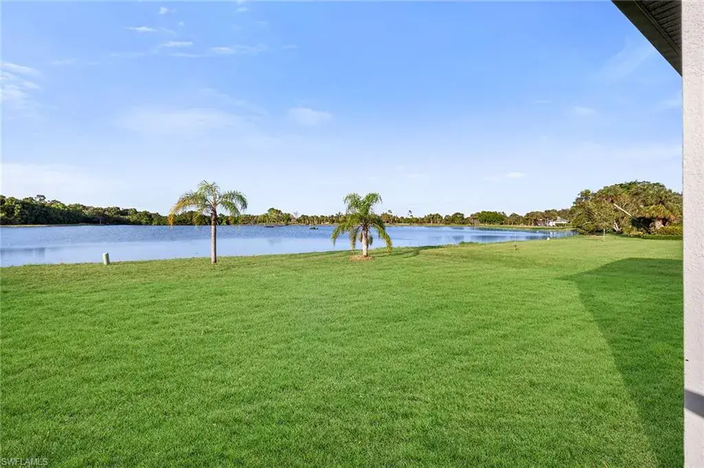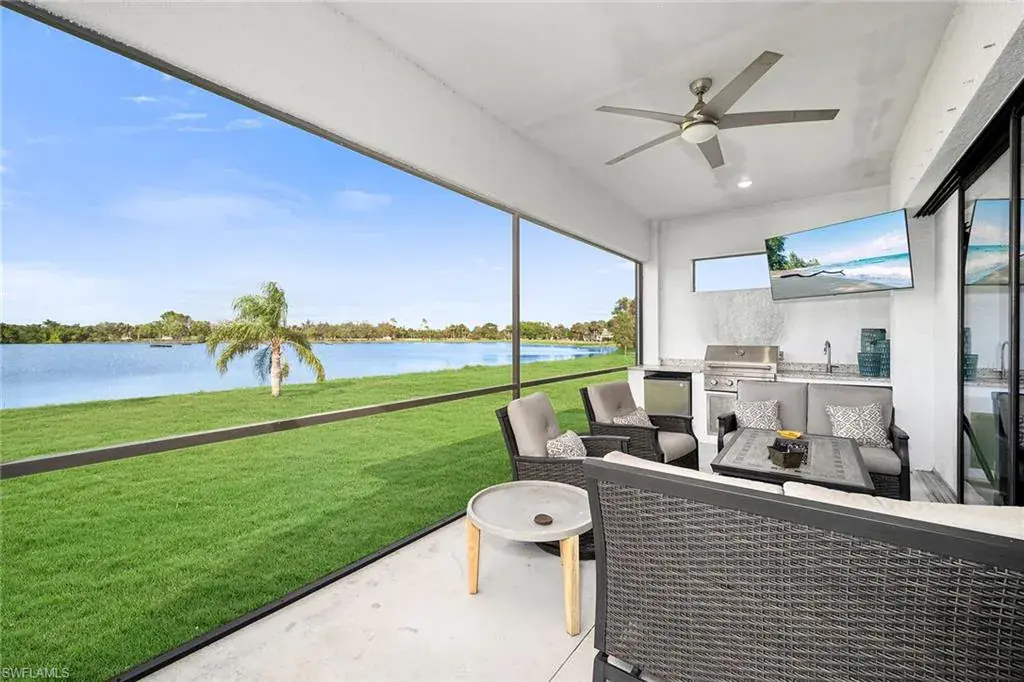 A stunning turnkey furnished home offering picturesque long lake views and exquisite upgrades throughout in Royal Palm Golf Estates. This meticulously maintained residence boasts 1,800 square feet of stylish living space, including three bedrooms, a den, two baths and a two-car garage. The exterior captivates with its flat tile roof, soffit down lighting and a long driveway, all setting the tone for the elegance that awaits inside. Enter through double doors into a beautifully designed kitchen featuring stainless appliances, two-toned shaker-style cabinets, granite countertops, a four-seater breakfast counter, and a convenient pantry, all framed by serene lake views. Adjacent to the kitchen, a cozy dining area provides a spot for meals with a window view. The spacious living room is a showstopper with a tray ceiling, a wood-feature wall housing two TVs and natural light pouring in through a glass slider, which opens to the expansive covered and screened-in lanai. This outdoor space is an entertainer’s dream, offering ample room for lounging and dining, an outdoor kitchen equipped with a KitchenAid gas grill and under-counter refrigerator, and breathtaking long lake views that make every moment memorable. The owner’s suite is a private retreat, featuring a tray ceiling, walk-in closet, and a luxurious en-suite bath featuring a dual-sink vanity topped with marble, a frameless glass walk-in shower with floor-to-ceiling tile walls, a deep soaker tub, and a linen closet. Two comfortable guest bedrooms share a well-appointed bath with a walk-in shower, while a spacious den with a charming barn door offers versatility for a home office and extra living space, the cabinet behind the desk is also a Murphy bed for extra space for guests. Additional highlights include a fully equipped laundry room, and a garage filled with natural light. Residents of Royal Palm Golf Estates have access to an array of amenities, including a Gordon Lewis-designed championship golf course, clubhouse with a restaurant and lounge, playground for kids, gated security, and paths for biking, recreation and jogging. This exceptional property combines modern elegance with a vibrant community lifestyle, making it the ideal place to call home in Naples. Don’t miss the opportunity to own this impeccable lakeside retreat!