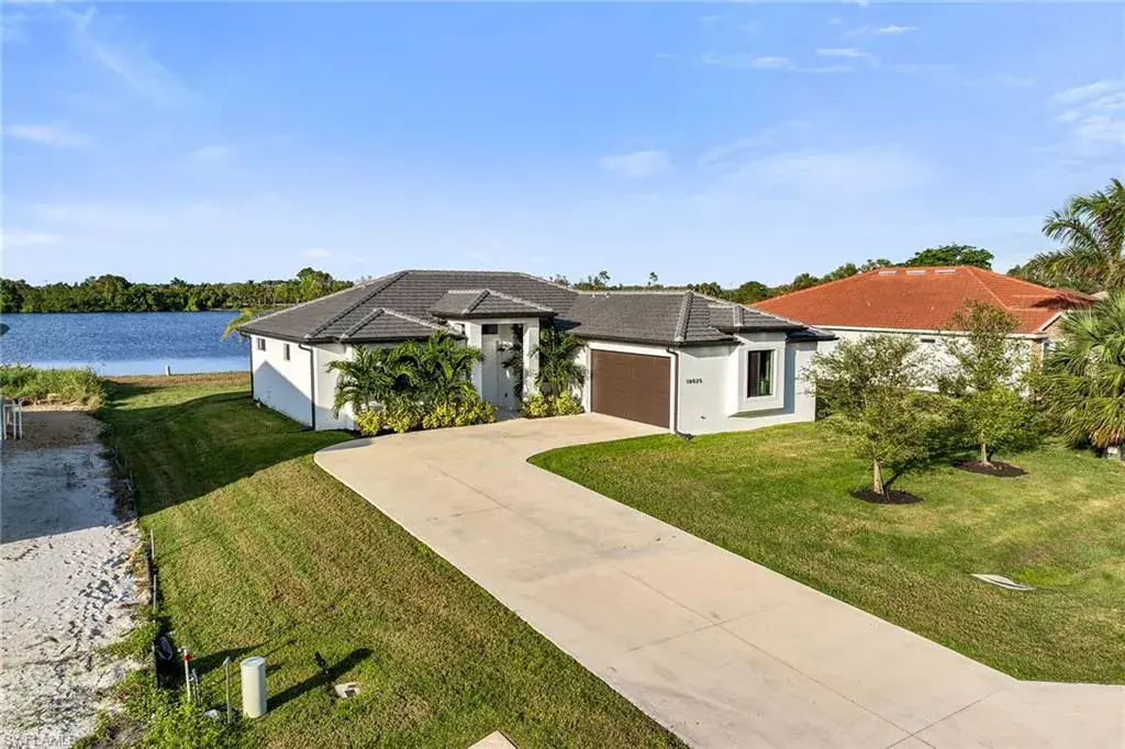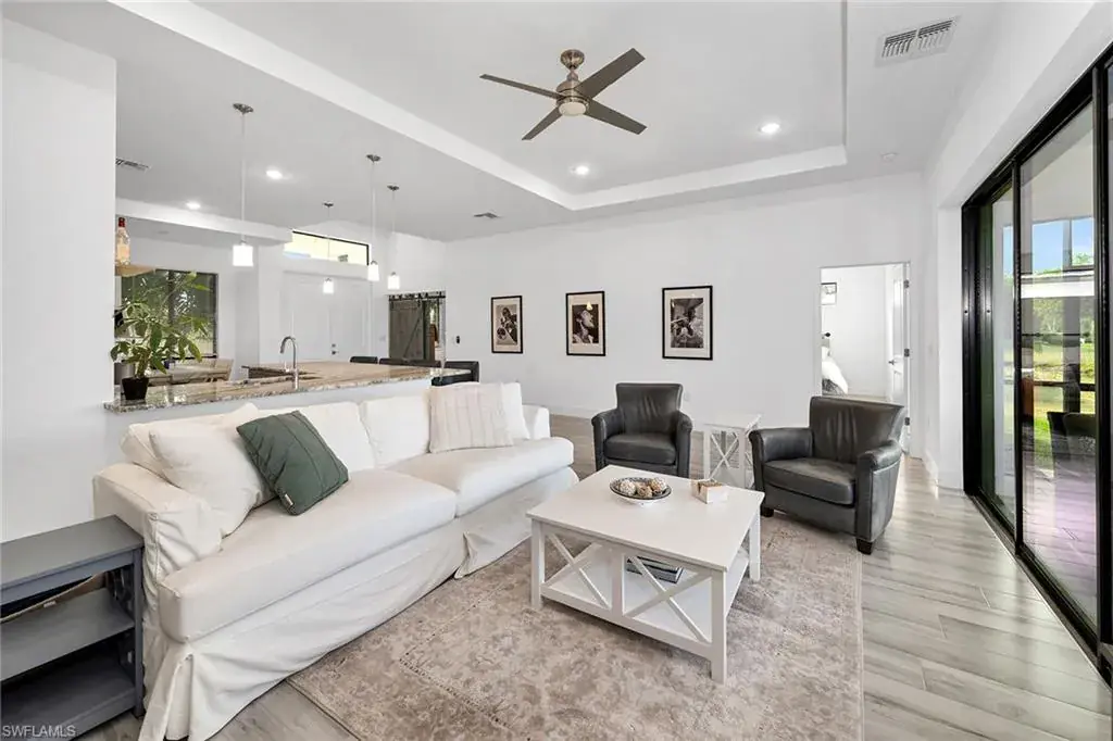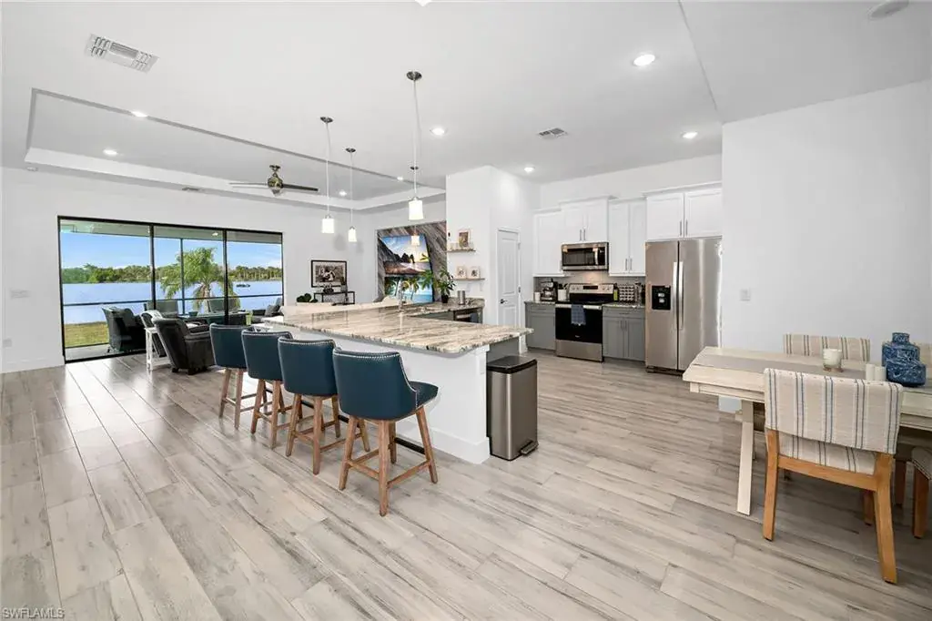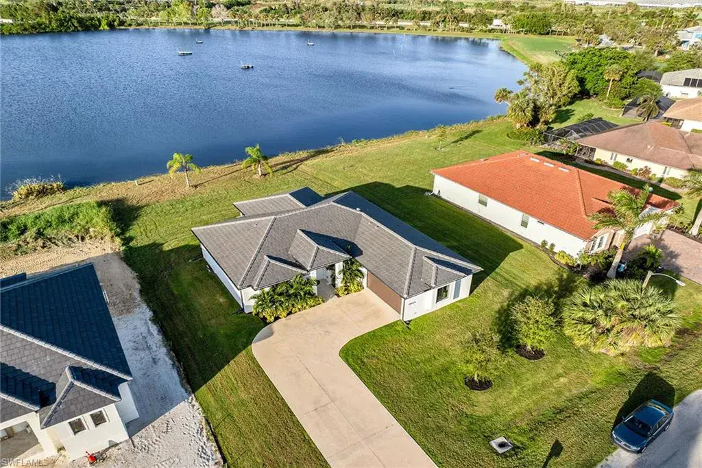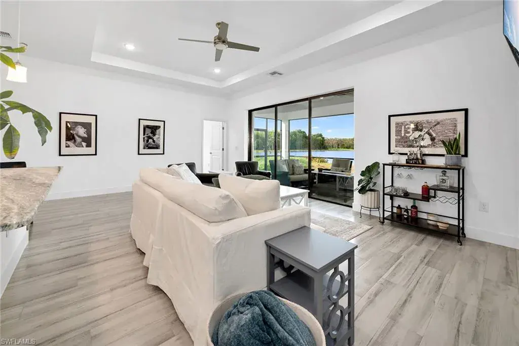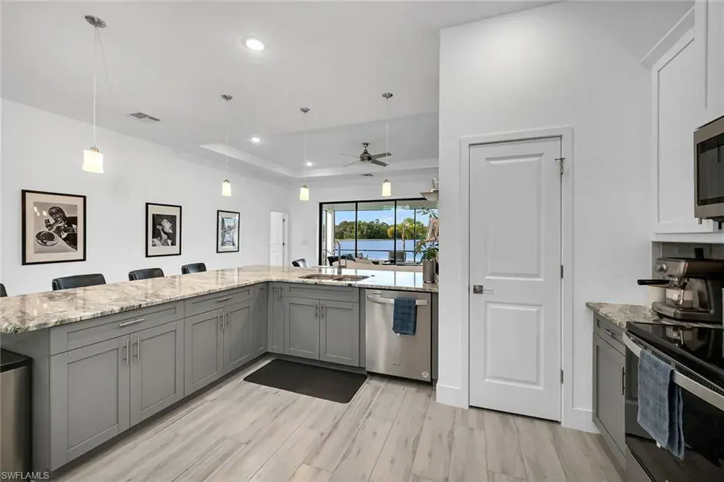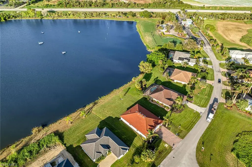 A stunning turnkey furnished home offering picturesque long lake views and exquisite upgrades throughout in Royal Palm Golf Estates. This meticulously maintained residence boasts 1,800 square feet of stylish living space, including three bedrooms, a den, two baths and a two-car garage. The exterior captivates with its flat tile roof, soffit down lighting and a long driveway, all setting the tone for the elegance that awaits inside. Enter through double doors into a beautifully designed kitchen featuring stainless appliances, two-toned shaker-style cabinets, granite countertops, a four-seater breakfast counter, and a convenient pantry, all framed by serene lake views. Adjacent to the kitchen, a cozy dining area provides a spot for meals with a window view. The spacious living room is a showstopper with a tray ceiling, a wood-feature wall housing two TVs and natural light pouring in through a glass slider, which opens to the expansive covered and screened-in lanai. This outdoor space is an entertainer’s dream, offering ample room for lounging and dining, an outdoor kitchen equipped with a KitchenAid gas grill and under-counter refrigerator, and breathtaking long lake views that make every moment memorable. The owner’s suite is a private retreat, featuring a tray ceiling, walk-in closet, and a luxurious en-suite bath featuring a dual-sink vanity topped with marble, a frameless glass walk-in shower with floor-to-ceiling tile walls, a deep soaker tub, and a linen closet. Two comfortable guest bedrooms share a well-appointed bath with a walk-in shower, while a spacious den with a charming barn door offers versatility for a home office and extra living space, the cabinet behind the desk is also a Murphy bed for extra space for guests. Additional highlights include a fully equipped laundry room, and a garage filled with natural light. Residents of Royal Palm Golf Estates have access to an array of amenities, including a Gordon Lewis-designed championship golf course, clubhouse with a restaurant and lounge, playground for kids, gated security, and paths for biking, recreation and jogging. This exceptional property combines modern elegance with a vibrant community lifestyle, making it the ideal place to call home in Naples. Don’t miss the opportunity to own this impeccable lakeside retreat!