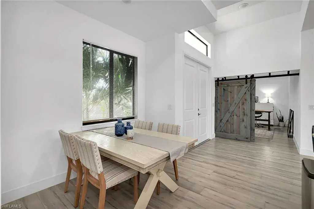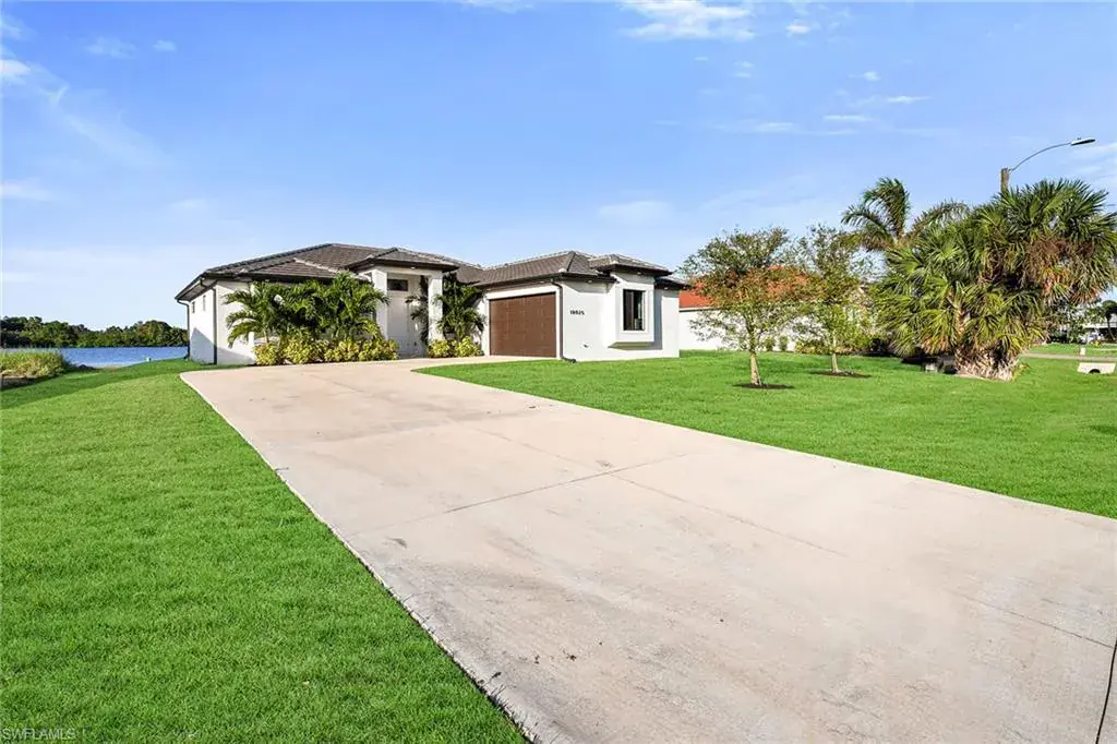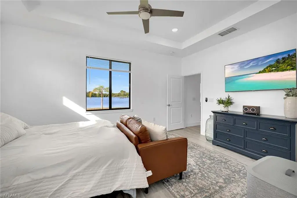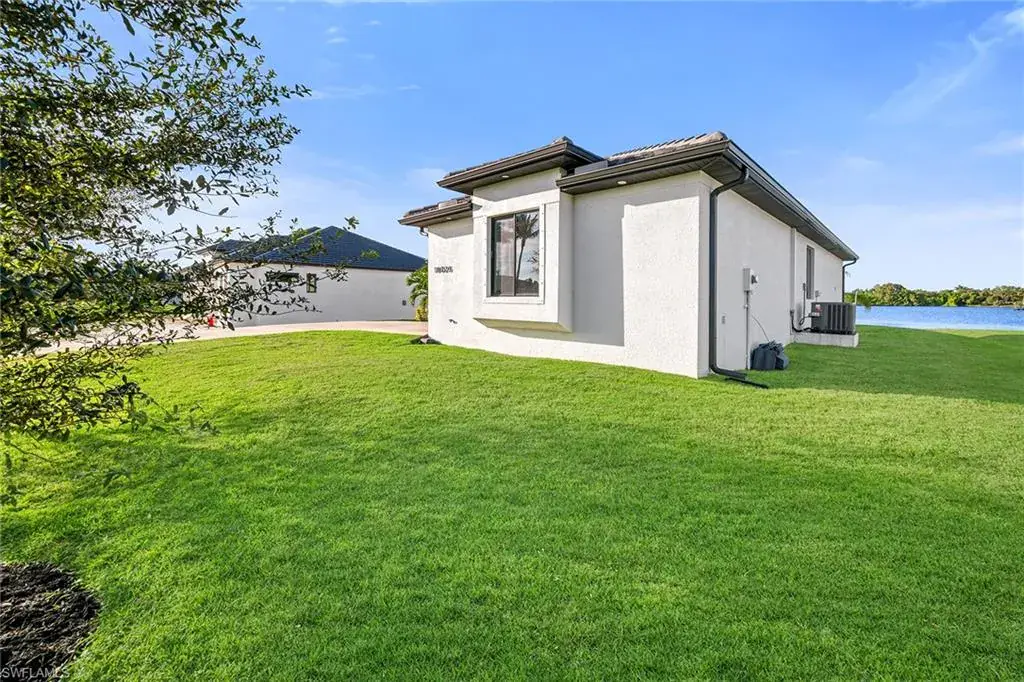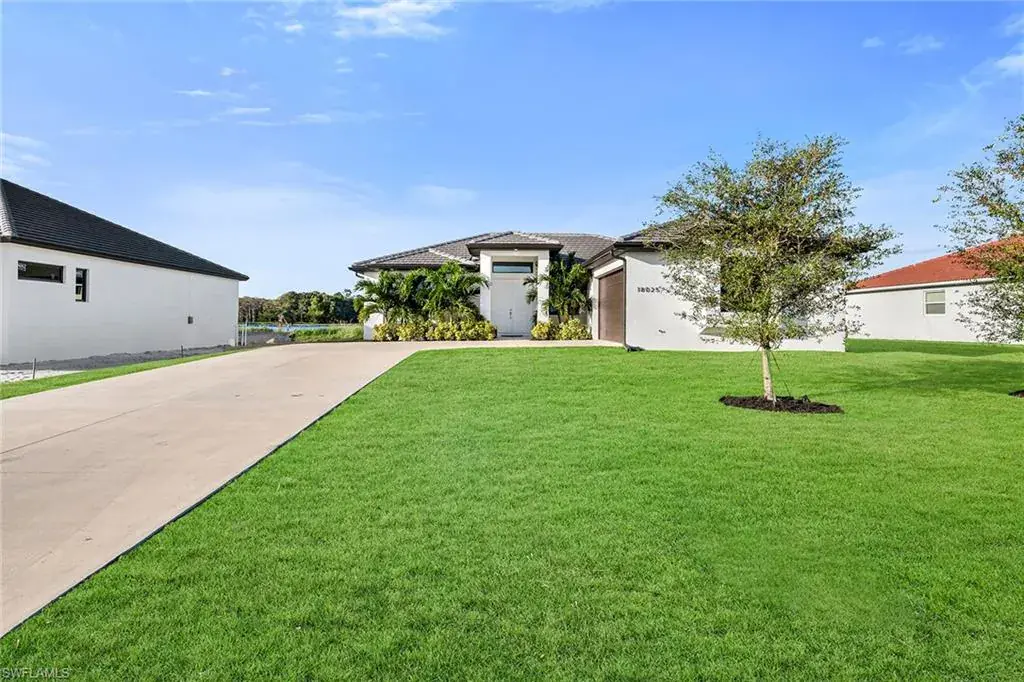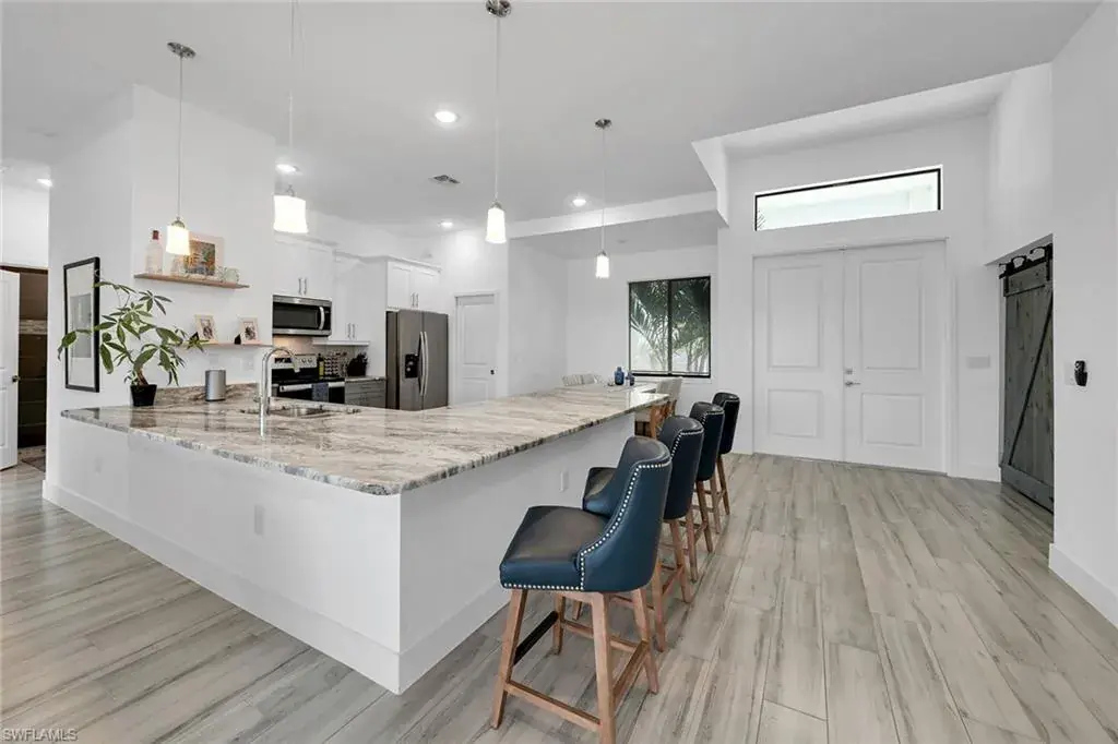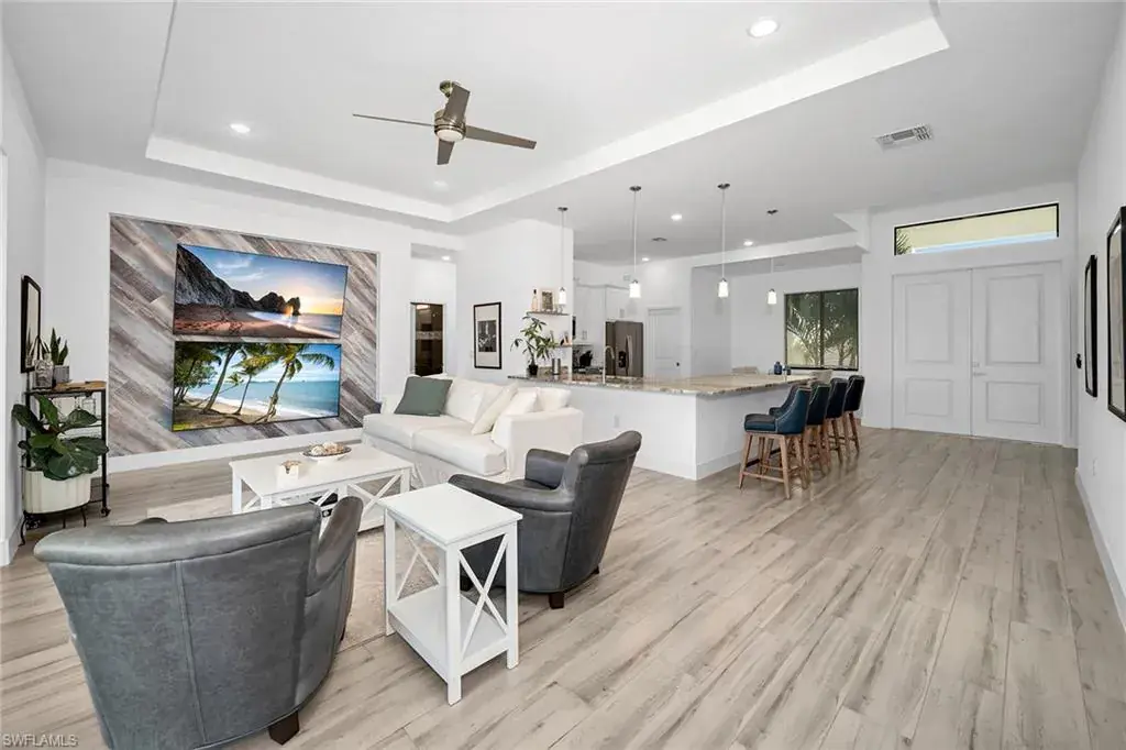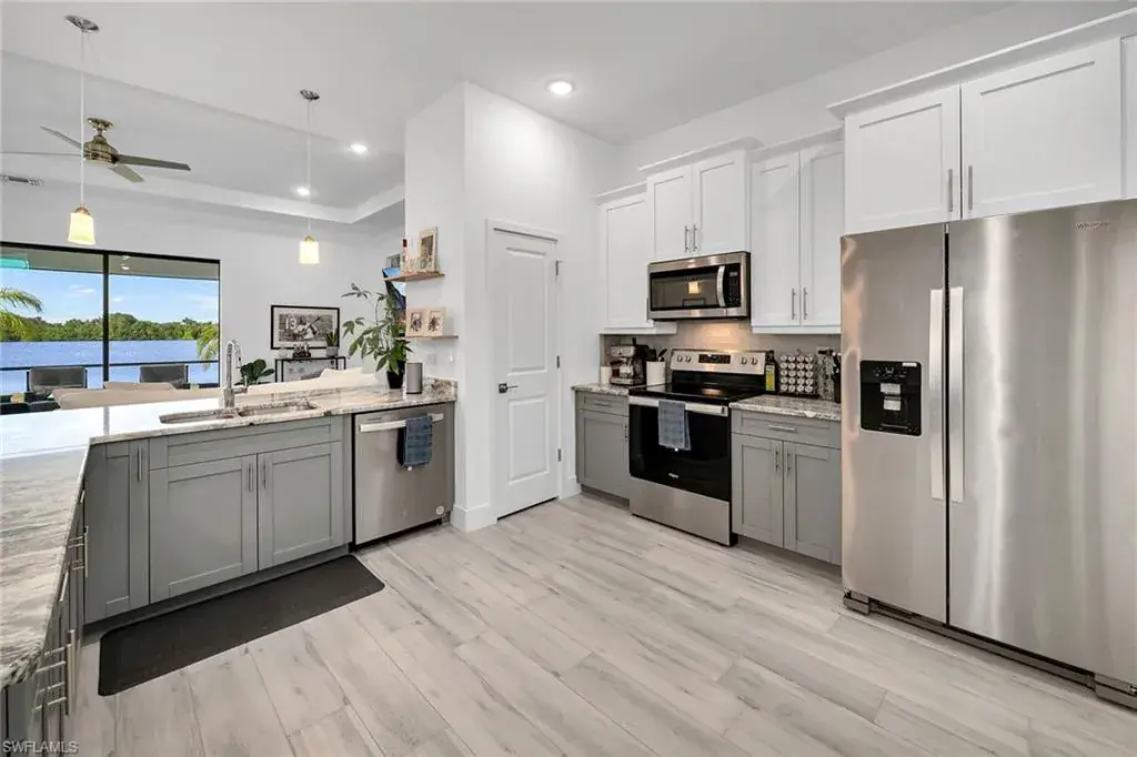 A stunning turnkey furnished home offering picturesque long lake views and exquisite upgrades throughout in Royal Palm Golf Estates. This meticulously maintained residence boasts 1,800 square feet of stylish living space, including three bedrooms, a den, two baths and a two-car garage. The exterior captivates with its flat tile roof, soffit down lighting and a long driveway, all setting the tone for the elegance that awaits inside. Enter through double doors into a beautifully designed kitchen featuring stainless appliances, two-toned shaker-style cabinets, granite countertops, a four-seater breakfast counter, and a convenient pantry, all framed by serene lake views. Adjacent to the kitchen, a cozy dining area provides a spot for meals with a window view. The spacious living room is a showstopper with a tray ceiling, a wood-feature wall housing two TVs and natural light pouring in through a glass slider, which opens to the expansive covered and screened-in lanai. This outdoor space is an entertainer’s dream, offering ample room for lounging and dining, an outdoor kitchen equipped with a KitchenAid gas grill and under-counter refrigerator, and breathtaking long lake views that make every moment memorable. The owner’s suite is a private retreat, featuring a tray ceiling, walk-in closet, and a luxurious en-suite bath featuring a dual-sink vanity topped with marble, a frameless glass walk-in shower with floor-to-ceiling tile walls, a deep soaker tub, and a linen closet. Two comfortable guest bedrooms share a well-appointed bath with a walk-in shower, while a spacious den with a charming barn door offers versatility for a home office and extra living space, the cabinet behind the desk is also a Murphy bed for extra space for guests. Additional highlights include a fully equipped laundry room, and a garage filled with natural light. Residents of Royal Palm Golf Estates have access to an array of amenities, including a Gordon Lewis-designed championship golf course, clubhouse with a restaurant and lounge, playground for kids, gated security, and paths for biking, recreation and jogging. This exceptional property combines modern elegance with a vibrant community lifestyle, making it the ideal place to call home in Naples. Don’t miss the opportunity to own this impeccable lakeside retreat!