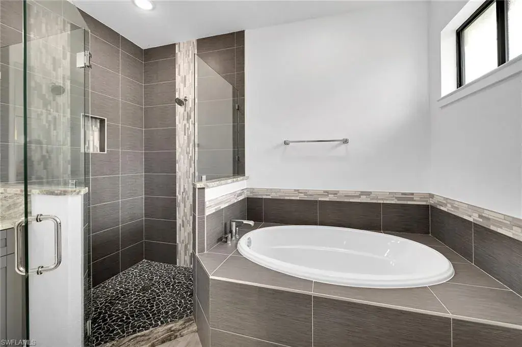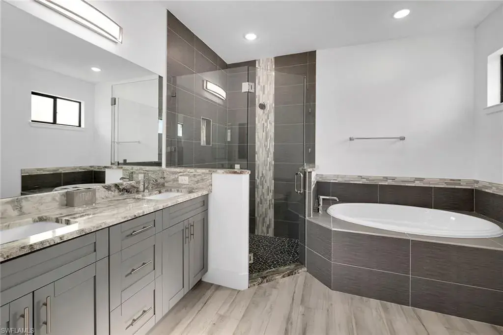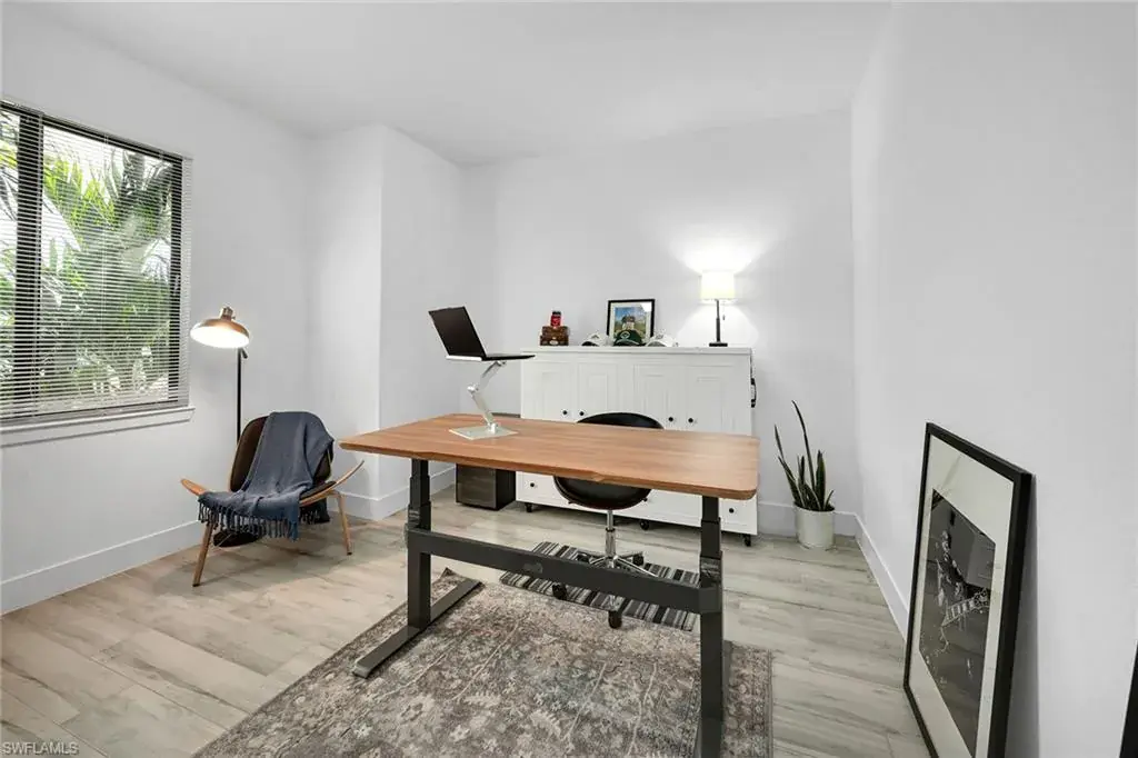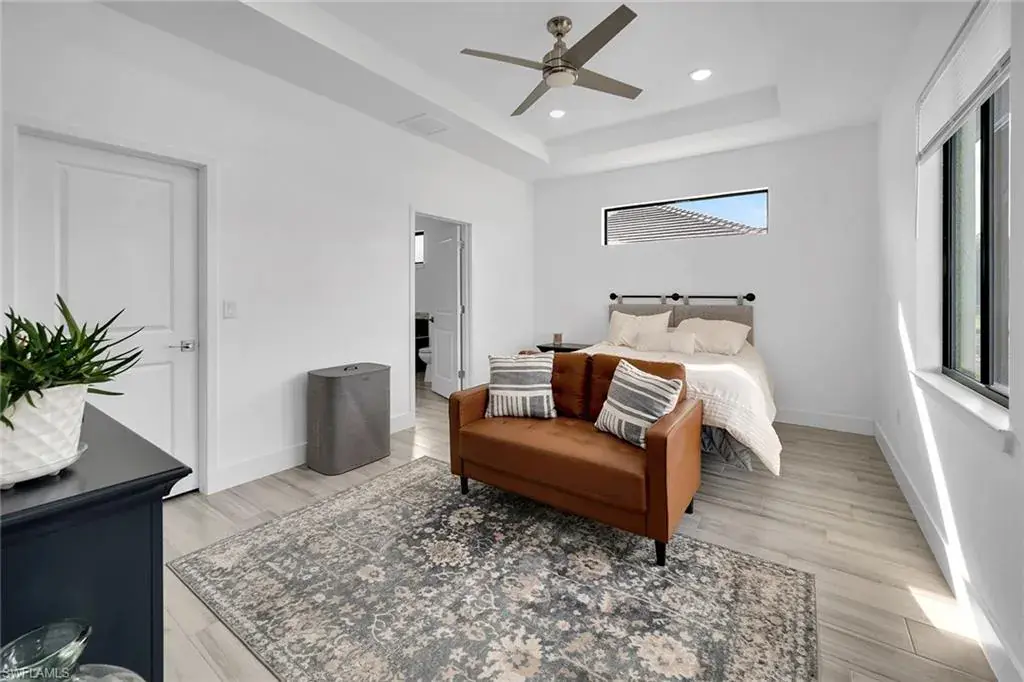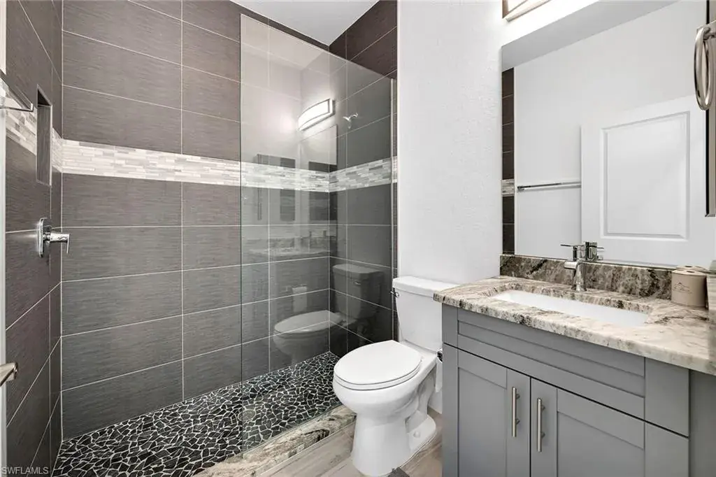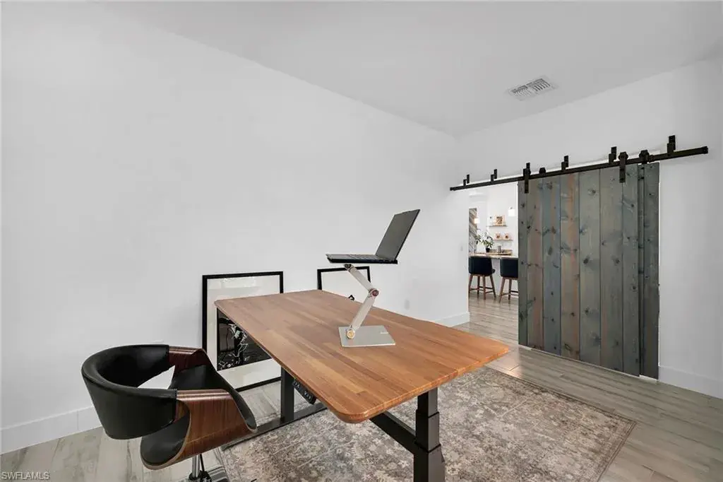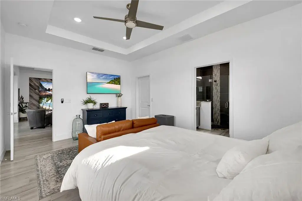 A stunning turnkey furnished home offering picturesque long lake views and exquisite upgrades throughout in Royal Palm Golf Estates. This meticulously maintained residence boasts 1,800 square feet of stylish living space, including three bedrooms, a den, two baths and a two-car garage. The exterior captivates with its flat tile roof, soffit down lighting and a long driveway, all setting the tone for the elegance that awaits inside. Enter through double doors into a beautifully designed kitchen featuring stainless appliances, two-toned shaker-style cabinets, granite countertops, a four-seater breakfast counter, and a convenient pantry, all framed by serene lake views. Adjacent to the kitchen, a cozy dining area provides a spot for meals with a window view. The spacious living room is a showstopper with a tray ceiling, a wood-feature wall housing two TVs and natural light pouring in through a glass slider, which opens to the expansive covered and screened-in lanai. This outdoor space is an entertainer’s dream, offering ample room for lounging and dining, an outdoor kitchen equipped with a KitchenAid gas grill and under-counter refrigerator, and breathtaking long lake views that make every moment memorable. The owner’s suite is a private retreat, featuring a tray ceiling, walk-in closet, and a luxurious en-suite bath featuring a dual-sink vanity topped with marble, a frameless glass walk-in shower with floor-to-ceiling tile walls, a deep soaker tub, and a linen closet. Two comfortable guest bedrooms share a well-appointed bath with a walk-in shower, while a spacious den with a charming barn door offers versatility for a home office and extra living space, the cabinet behind the desk is also a Murphy bed for extra space for guests. Additional highlights include a fully equipped laundry room, and a garage filled with natural light. Residents of Royal Palm Golf Estates have access to an array of amenities, including a Gordon Lewis-designed championship golf course, clubhouse with a restaurant and lounge, playground for kids, gated security, and paths for biking, recreation and jogging. This exceptional property combines modern elegance with a vibrant community lifestyle, making it the ideal place to call home in Naples. Don’t miss the opportunity to own this impeccable lakeside retreat!