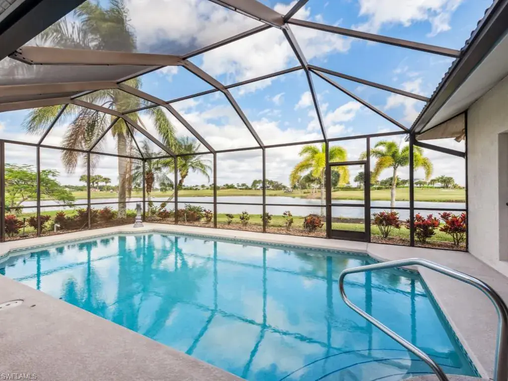 BACK TO MARKET WITH A NEWLY REDUCED PRICE TO SELL QUICKLY!!! ALL REASONABLE OFFERS CONSIDERED!!! Enjoy wide sweeping unobstructed views of the water and golf course from this large move in ready pool home on a cul-de-sac. Lots of updates and improvements; AC Air Handler is 2013 and the Condenser is 2016, Water Heater 2023, Pool Mechanical Systems all replaced in 2017, Stove, Refrigerator, Microwave all new within the last year, The whole exterior of the home was recently painted and all screening on both lanais along with screws were replaced in 2022. The home is neat as a pin and is being sold Turnkey Furnished. Enjoy a full 4 Bedrooms along with 3 full bathrooms as you take in everything Naples has to offer. This is a fast growing area of Naples with lots of shopping, a newer Publix very close by and more! The golf course is public with no requirement to join. Memberships are available and totally elective. The community is approximately 20 minutes to Olde Naples and Marco Island. This home has been in the same family since new and has been meticulously kept up. Make your appointment now on this lovely pool home.