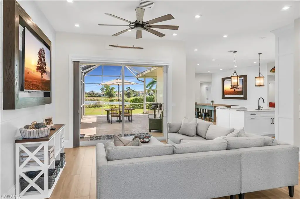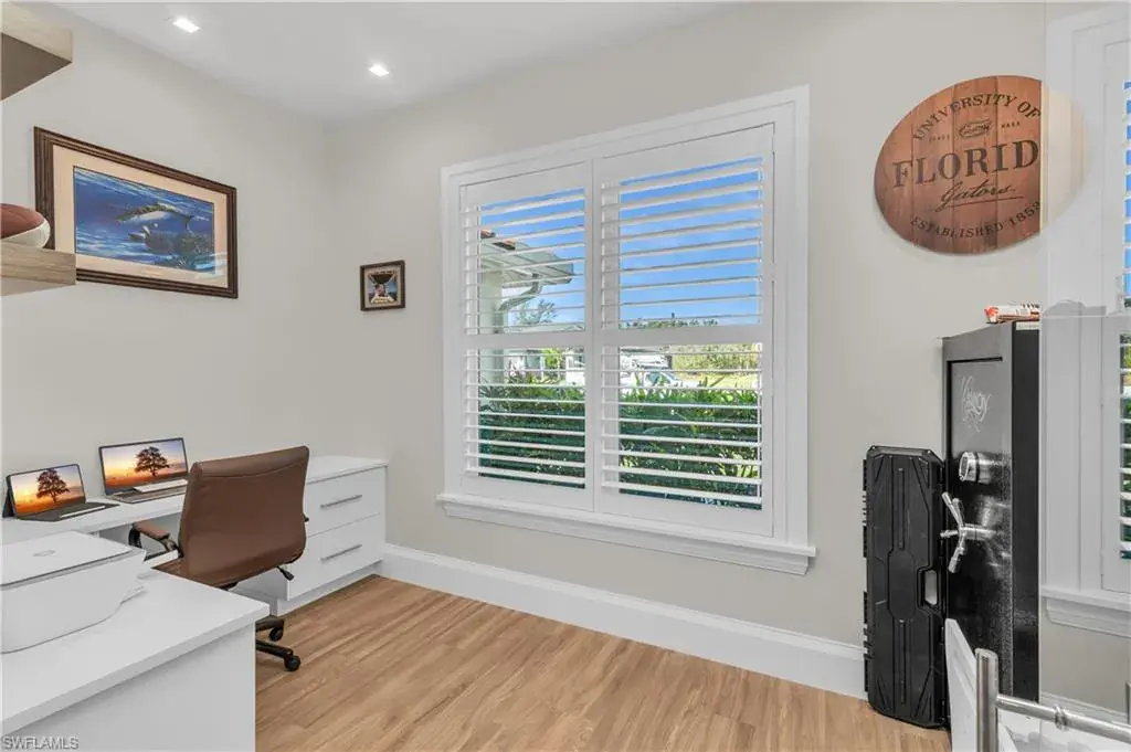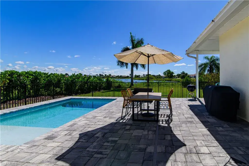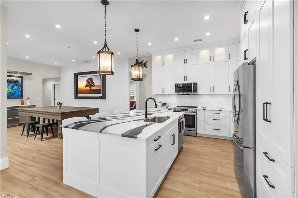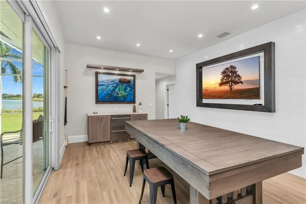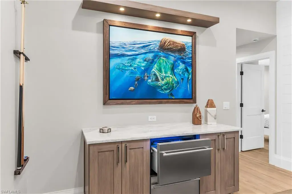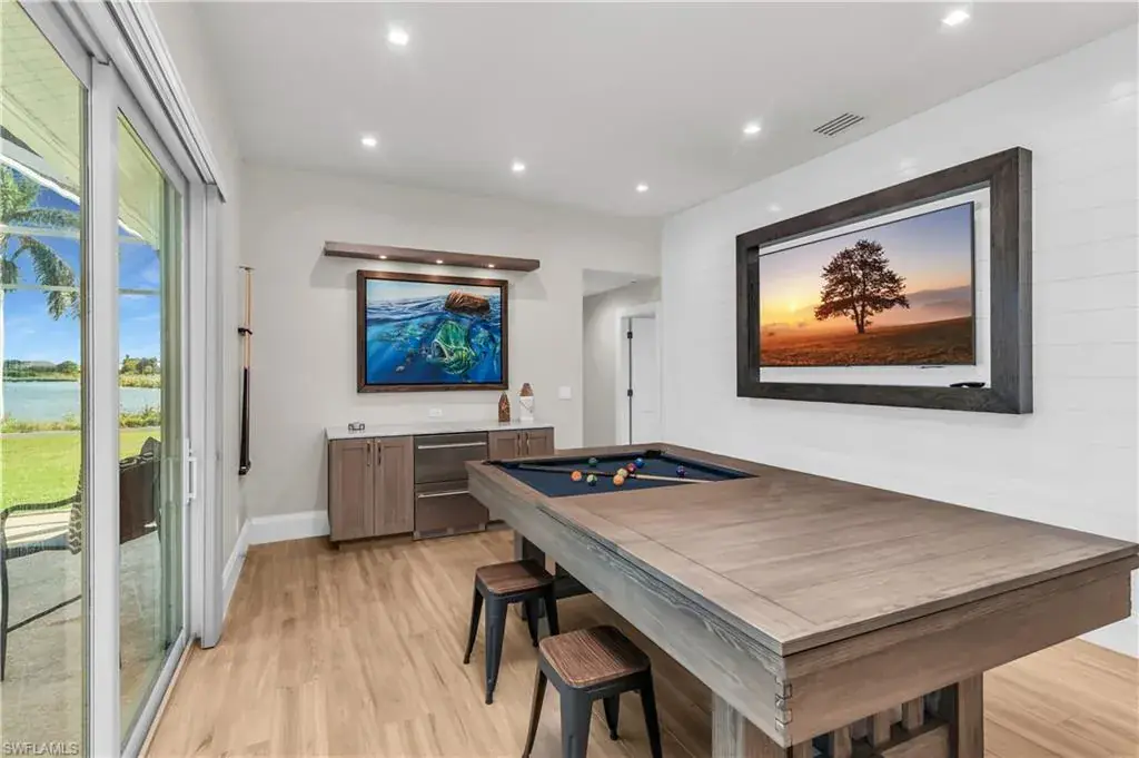 Welcome to your dream home in Royal Palm Golf Estates, a serene community featuring an 18-hole championship-level golf course. A BRAND-NEW POOL was just added, offering the perfect space to relax and entertain! This beautifully designed 4-bedroom, 3-bathroom home offers tranquil lake views and impeccable coastal Florida elegance. Step into the foyer and be greeted by an open-concept floor plan bathed in natural light. High-end finishes and thoughtful details abound, including 8” nickel gap paneling, custom LED lighting, and wood plantation shutters throughout. The chef’s kitchen is a true masterpiece, featuring floor-to-ceiling custom cabinetry with pull-out wood drawers, a built-in pantry, and a stunning Bentley quartz island. A beverage bar with a double-drawer beverage center and a custom-built dining area make this space perfect for entertaining. The home also includes a den with a seamless glass entry door, offering flexibility as a home office or additional living space. The master suite is a private retreat with two closets – one a walk-in with custom wood cabinetry and inserts – and a spa-like master bath with dual vanities and a walk-in shower. Additional highlights include an air-conditioned 2-car garage, hurricane-impact windows and doors, and elegant tile flooring throughout. Custom floating shelving adds a modern touch to the family and master bedrooms, while solid-core doors with exquisite hardware showcase the meticulous attention to detail in this home. Step out to your screened-in lanai, the perfect spot to enjoy your morning coffee as you take in the peaceful sunrise over the lake. The NEW beautiful pool is complete with a paver deck and a fence, creating the ultimate backyard oasis. Imagine relaxing in your private pool, enjoying the Florida sunshine in complete tranquility. Located in a quiet, serene community, this home offers the perfect balance of nature and convenience, just minutes from downtown Naples, beautiful beaches, and world-class amenities. Don’t miss this opportunity to live your Florida dream!