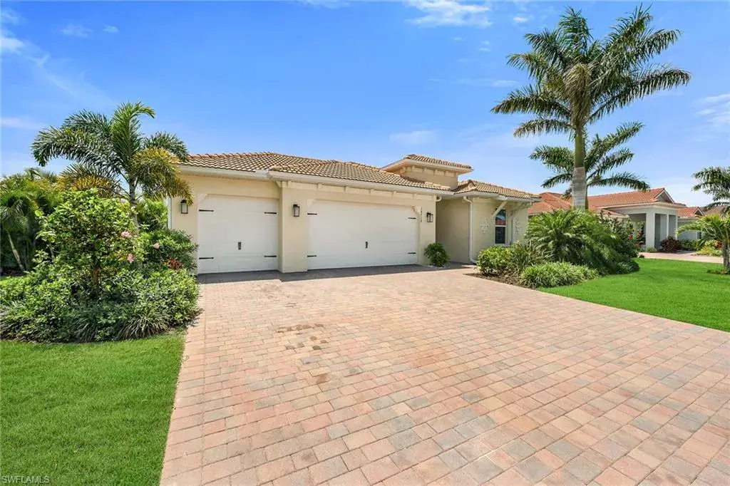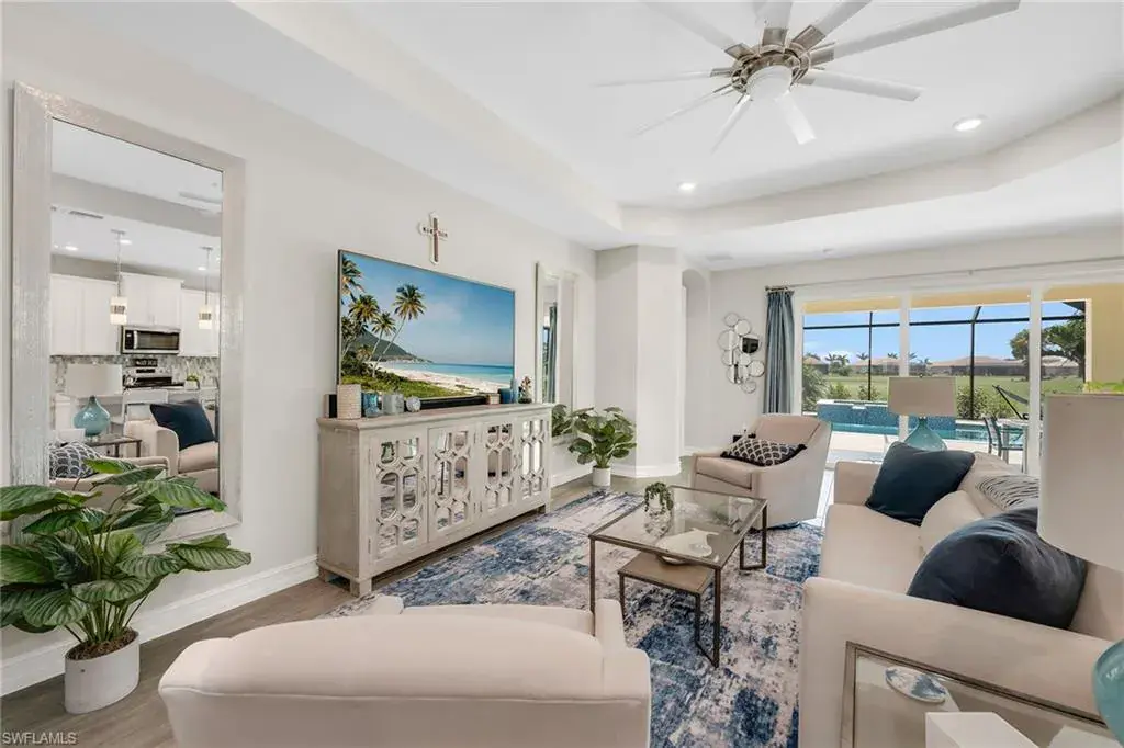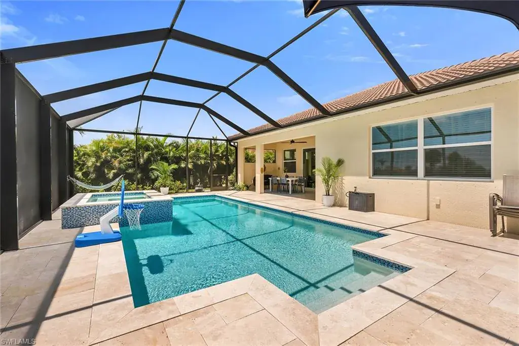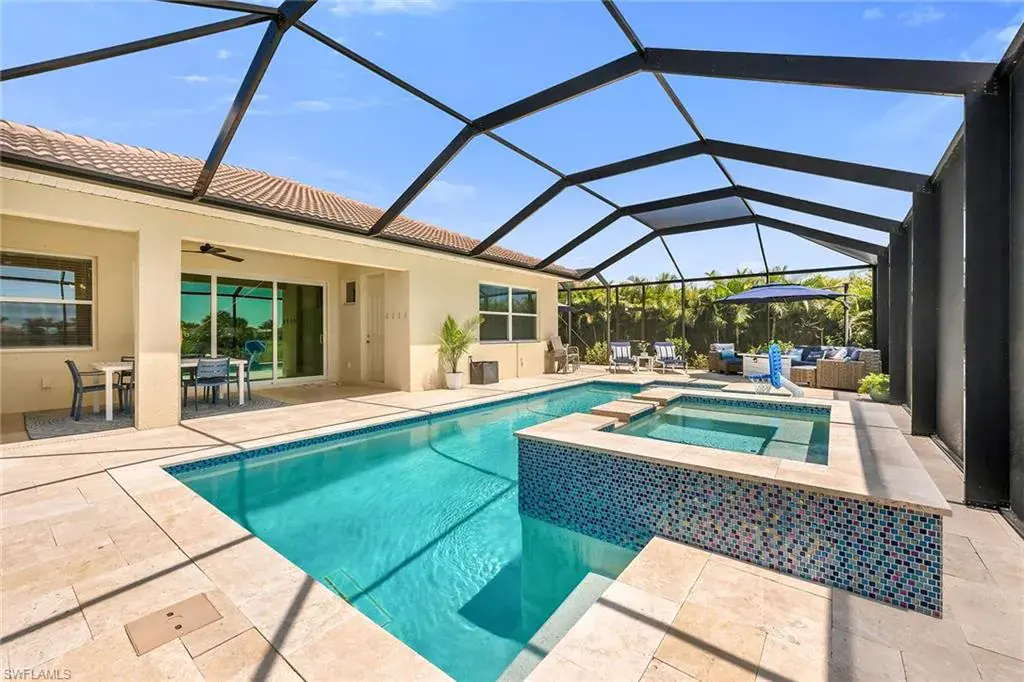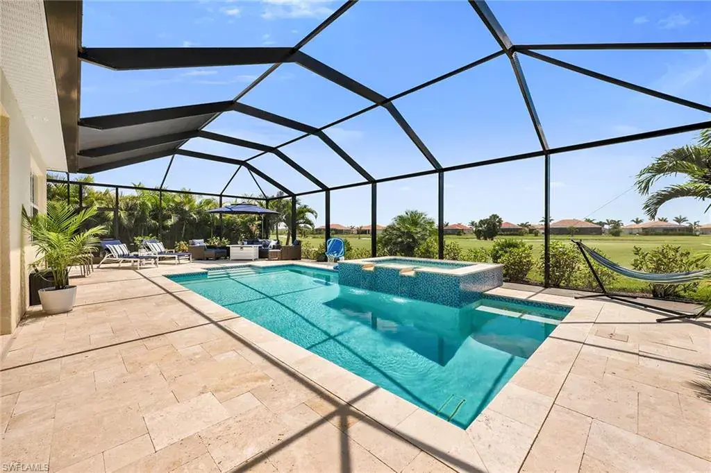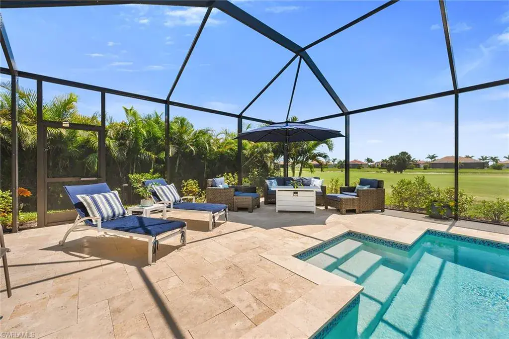 Welcome to this beautifully maintained single-story home in the gated community of Royal Palm Golf Estates. Offering three bedrooms plus a den, two full and two half baths, this residence blends luxury with everyday comfort. With serene golf course views, southern exposure and thoughtful upgrades throughout, this home is the epitome of Florida living. As you enter through the upgraded glass front door, you’re greeted by a long, welcoming hallway with ceramic tile flooring and freshly painted walls. The open-concept great room features a tray ceiling and large impact sliders that allow for an abundance of natural light and seamless indoor-outdoor living. The heart of the home is the kitchen, showcasing a large center island with a Sterling sink and Moen faucet, granite countertops, a tile backsplash and stainless steel appliances including a KitchenAid refrigerator and Whirlpool oven, microwave and dishwasher. Three pendant lights over the island add a stylish touch, while the adjacent dining area offers a cozy and light-filled space with a large chandelier. Just off the main living area, the French door entry to the den can be utilized as a home office, library or guest space. The spacious primary suite is a peaceful retreat with tranquil views and a large walk-in closet. The en-suite bath is spa-inspired, complete with a soaking tub, a walk-in glass shower with double shower heads, granite countertops and dual vanities. On the opposite wing of the home, two additional guest bedrooms offer privacy and comfort with a full guest bath. Outdoor living is exceptional in this home. Go out onto the screened lanai, complete with no-see-um mesh screening for year-round comfort, a custom saltwater pool and spa, with jets and a new pool pump, and a pool bath offer a place to unwind while enjoying tranquil golf course views. The spa is thoughtfully placed to create a stunning water feature visible from the entry, enhancing the home’s ambiance. Privacy palms and blooming gardenia bushes planted along both sides of the property create a lush and secluded outdoor sanctuary. Additional features include a freshly painted interior, impact sliders, manual shutters, a spacious laundry room with Samsung top-load washer and dryer, a storage closet with air handler and a large pantry. The oversized three-car tandem garage with painted concrete flooring provides exceptional storage and flexibility, offering more space than any other model in the neighborhood. In the gated, pet-friendly Royal Palm Golf Estates community, this home benefits from low HOA fees and allows golf carts on neighborhood streets. Residents have access to Eagle Lakes Golf Club, a public course with a clubhouse, restaurant and bar. Just minutes from the sugar-sand beaches of Marco Island and upscale shops and dining on Naples lively Fifth Avenue, this home is positioned for a lifestyle of coastal charm and casual sophistication.