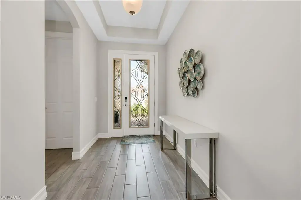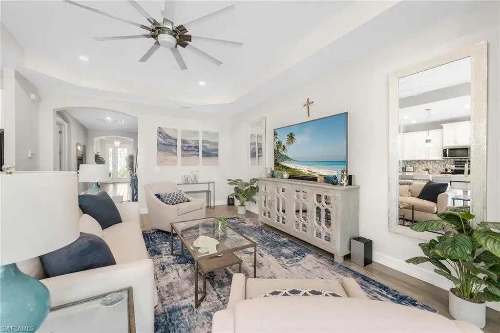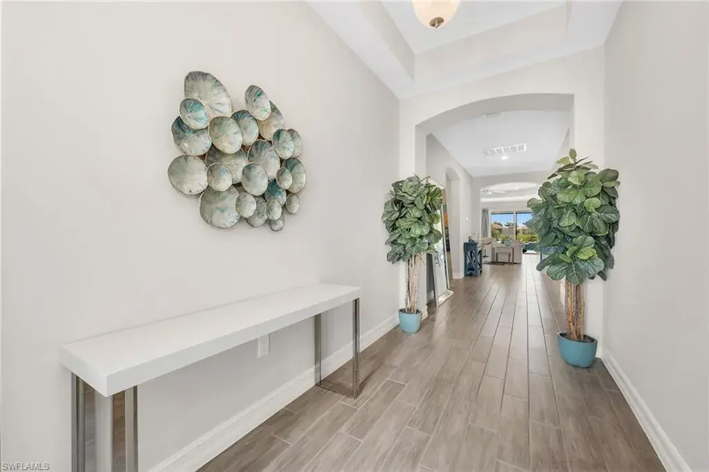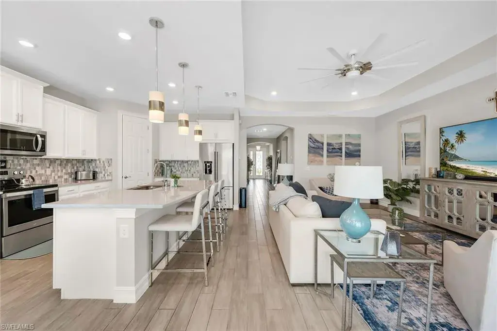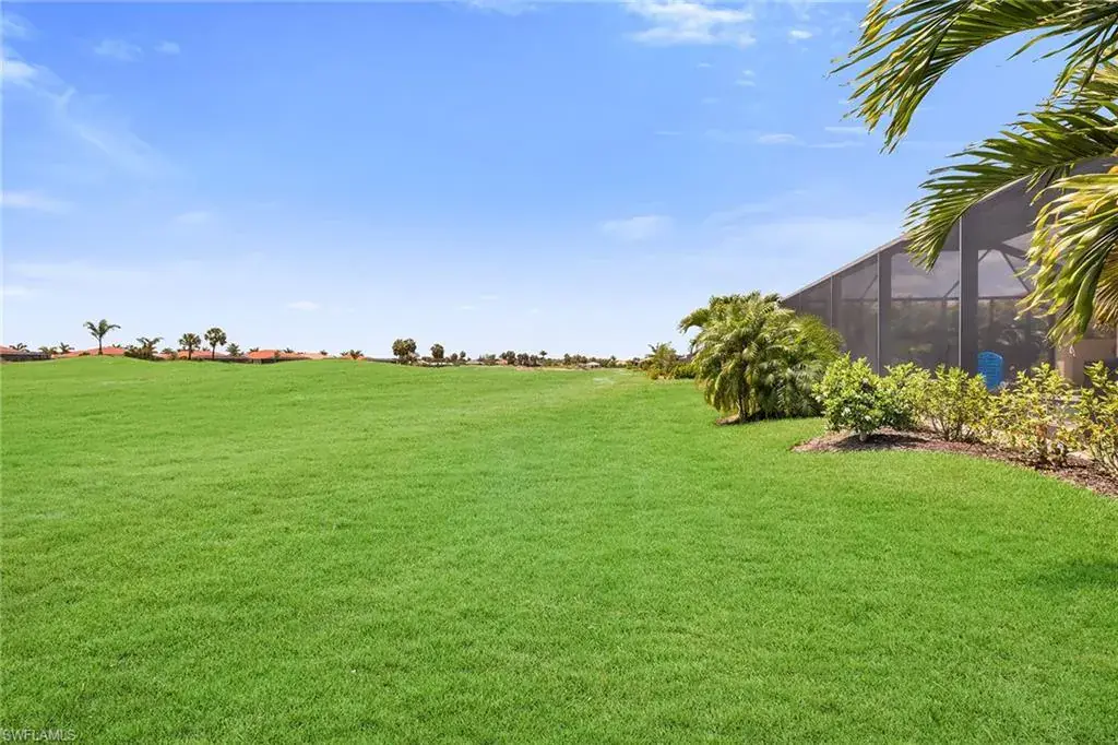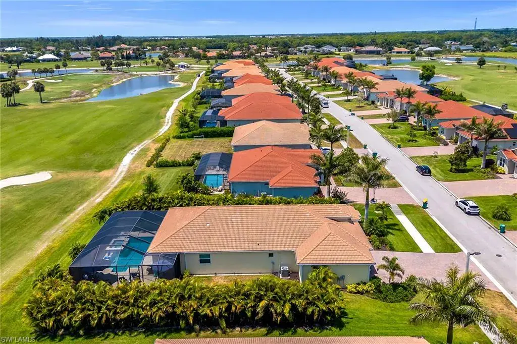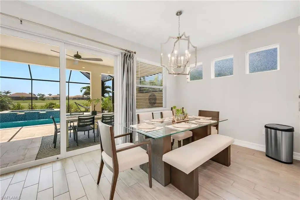 Welcome to this beautifully maintained single-story home in the gated community of Royal Palm Golf Estates. Offering three bedrooms plus a den, two full and two half baths, this residence blends luxury with everyday comfort. With serene golf course views, southern exposure and thoughtful upgrades throughout, this home is the epitome of Florida living. As you enter through the upgraded glass front door, you’re greeted by a long, welcoming hallway with ceramic tile flooring and freshly painted walls. The open-concept great room features a tray ceiling and large impact sliders that allow for an abundance of natural light and seamless indoor-outdoor living. The heart of the home is the kitchen, showcasing a large center island with a Sterling sink and Moen faucet, granite countertops, a tile backsplash and stainless steel appliances including a KitchenAid refrigerator and Whirlpool oven, microwave and dishwasher. Three pendant lights over the island add a stylish touch, while the adjacent dining area offers a cozy and light-filled space with a large chandelier. Just off the main living area, the French door entry to the den can be utilized as a home office, library or guest space. The spacious primary suite is a peaceful retreat with tranquil views and a large walk-in closet. The en-suite bath is spa-inspired, complete with a soaking tub, a walk-in glass shower with double shower heads, granite countertops and dual vanities. On the opposite wing of the home, two additional guest bedrooms offer privacy and comfort with a full guest bath. Outdoor living is exceptional in this home. Go out onto the screened lanai, complete with no-see-um mesh screening for year-round comfort, a custom saltwater pool and spa, with jets and a new pool pump, and a pool bath offer a place to unwind while enjoying tranquil golf course views. The spa is thoughtfully placed to create a stunning water feature visible from the entry, enhancing the home’s ambiance. Privacy palms and blooming gardenia bushes planted along both sides of the property create a lush and secluded outdoor sanctuary. Additional features include a freshly painted interior, impact sliders, manual shutters, a spacious laundry room with Samsung top-load washer and dryer, a storage closet with air handler and a large pantry. The oversized three-car tandem garage with painted concrete flooring provides exceptional storage and flexibility, offering more space than any other model in the neighborhood. In the gated, pet-friendly Royal Palm Golf Estates community, this home benefits from low HOA fees and allows golf carts on neighborhood streets. Residents have access to Eagle Lakes Golf Club, a public course with a clubhouse, restaurant and bar. Just minutes from the sugar-sand beaches of Marco Island and upscale shops and dining on Naples lively Fifth Avenue, this home is positioned for a lifestyle of coastal charm and casual sophistication.