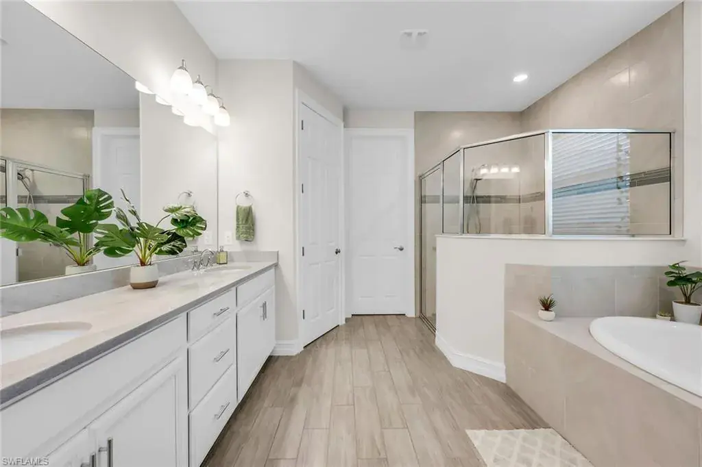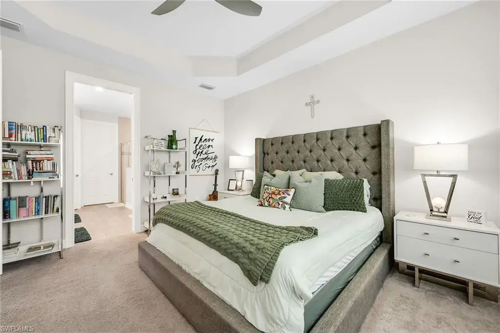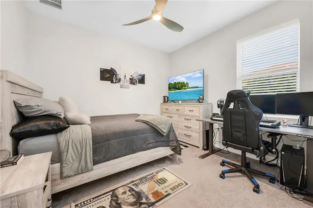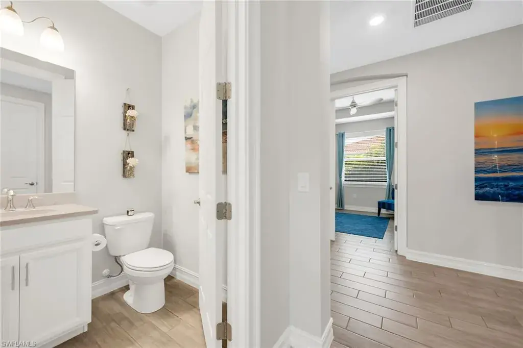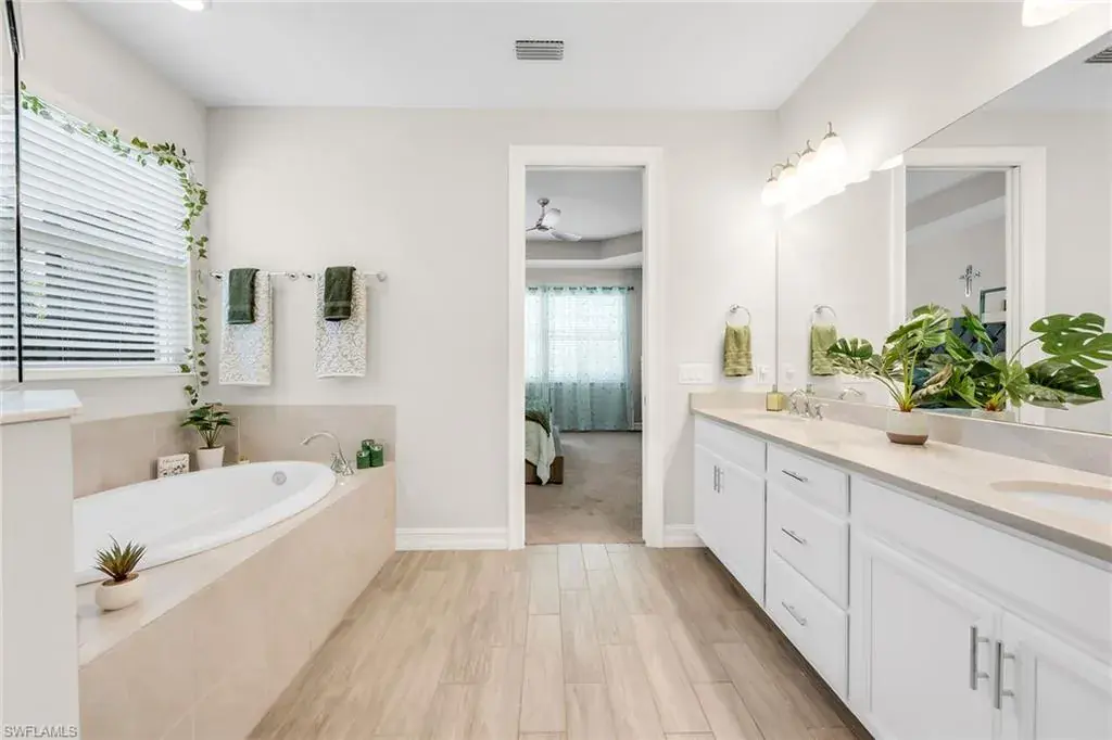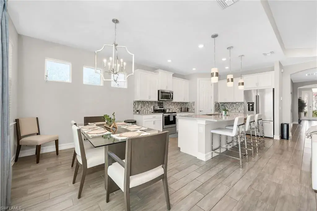 Welcome to this beautifully maintained single-story home in the gated community of Royal Palm Golf Estates. Offering three bedrooms plus a den, two full and two half baths, this residence blends luxury with everyday comfort. With serene golf course views, southern exposure and thoughtful upgrades throughout, this home is the epitome of Florida living. As you enter through the upgraded glass front door, you’re greeted by a long, welcoming hallway with ceramic tile flooring and freshly painted walls. The open-concept great room features a tray ceiling and large impact sliders that allow for an abundance of natural light and seamless indoor-outdoor living. The heart of the home is the kitchen, showcasing a large center island with a Sterling sink and Moen faucet, granite countertops, a tile backsplash and stainless steel appliances including a KitchenAid refrigerator and Whirlpool oven, microwave and dishwasher. Three pendant lights over the island add a stylish touch, while the adjacent dining area offers a cozy and light-filled space with a large chandelier. Just off the main living area, the French door entry to the den can be utilized as a home office, library or guest space. The spacious primary suite is a peaceful retreat with tranquil views and a large walk-in closet. The en-suite bath is spa-inspired, complete with a soaking tub, a walk-in glass shower with double shower heads, granite countertops and dual vanities. On the opposite wing of the home, two additional guest bedrooms offer privacy and comfort with a full guest bath. Outdoor living is exceptional in this home. Go out onto the screened lanai, complete with no-see-um mesh screening for year-round comfort, a custom saltwater pool and spa, with jets and a new pool pump, and a pool bath offer a place to unwind while enjoying tranquil golf course views. The spa is thoughtfully placed to create a stunning water feature visible from the entry, enhancing the home’s ambiance. Privacy palms and blooming gardenia bushes planted along both sides of the property create a lush and secluded outdoor sanctuary. Additional features include a freshly painted interior, impact sliders, manual shutters, a spacious laundry room with Samsung top-load washer and dryer, a storage closet with air handler and a large pantry. The oversized three-car tandem garage with painted concrete flooring provides exceptional storage and flexibility, offering more space than any other model in the neighborhood. In the gated, pet-friendly Royal Palm Golf Estates community, this home benefits from low HOA fees and allows golf carts on neighborhood streets. Residents have access to Eagle Lakes Golf Club, a public course with a clubhouse, restaurant and bar. Just minutes from the sugar-sand beaches of Marco Island and upscale shops and dining on Naples lively Fifth Avenue, this home is positioned for a lifestyle of coastal charm and casual sophistication.