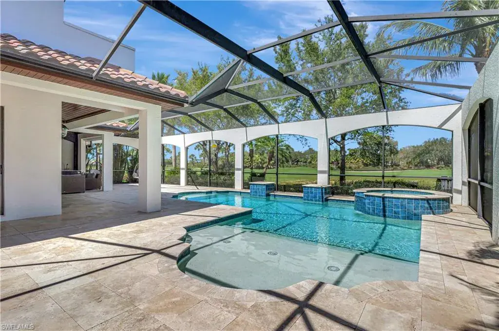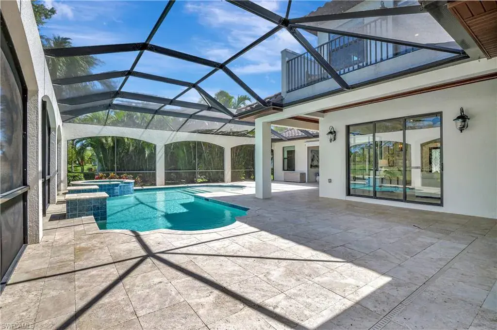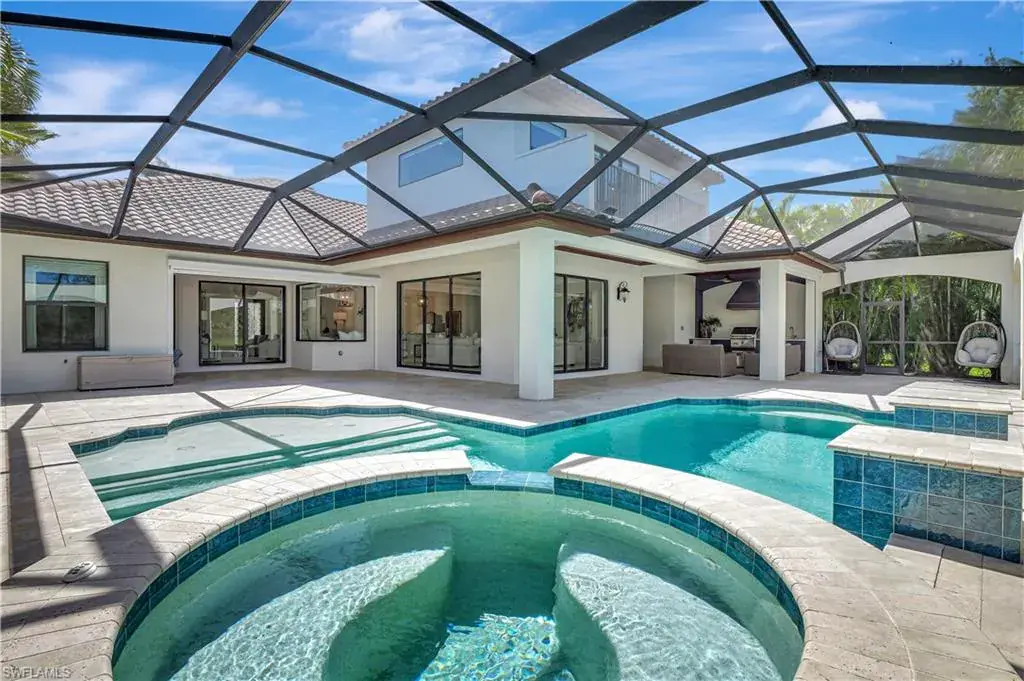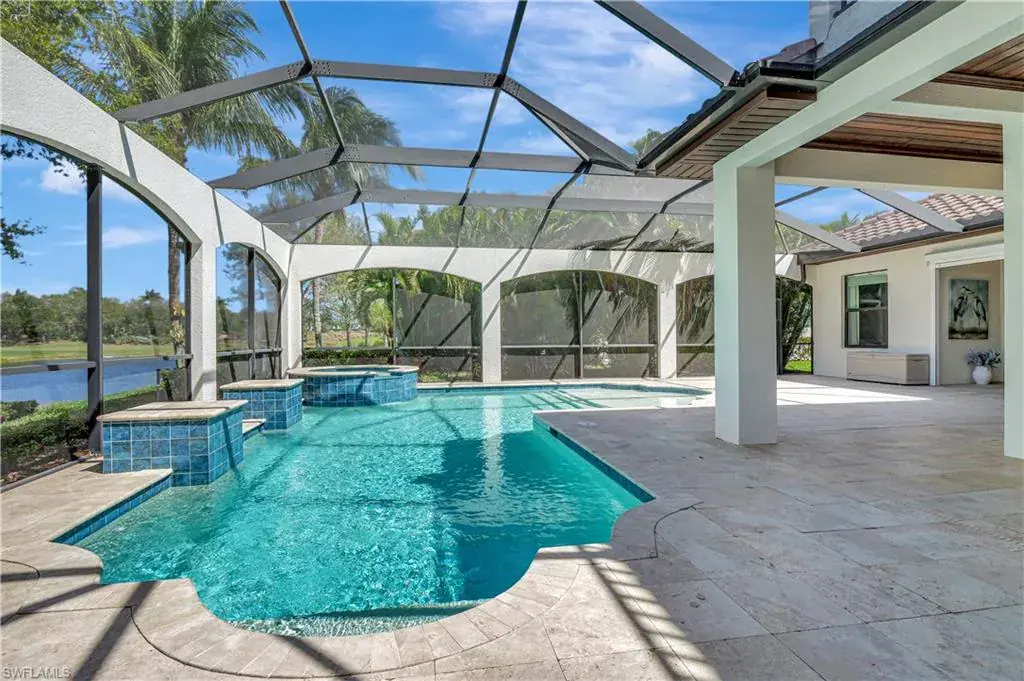 Enjoy the exquisite golf course and lake views from the expansive lanai to the 2nd floor balcony of this 4-bedroom plus den, 4-bath home. Royal palms and elegant architectural details, tranquil vistas and ample privacy. Many enhancements make this 2-story home a class above. Upgrades include 3 AC units, Generac generator, tankless hot water heater. Chisel-edged stone and wood flooring throughout, volume entry ceilings, plantation shutters, coastal shiplap and tray ceilings elevate this home, in addition to well-thought-out floor plan. Open formal room with dining, kitchen peninsula, banquette off kitchen. Gourmet kitchen with gas cooktop and stove, white custom wood and soft-close cabinetry, Quartz countertops, stainless steel appliances, walk-in pantry, and modern lighting. Upscale main bedroom suite has wood floors, rear lanai entry, plenty of natural light, designer walk-in closet, plus additional closet with double door. Ensuite bathroom has separated dual vanities, soaking tub, stunning walk-in shower, arched windows, and modern lighting. Study/office with glass doors for private work and views. 2nd bedroom with ensuite bath/pool bath, plantation shutters, closet with additional storage, and sliders with view and pool access. 3rd bedroom light and inviting with upgraded shiplap, walk-in closet, and plantation shutters. Additional guest bath with double sinks, full shower and plantation shutters. 2nd floor bonus room – large bedroom/entertainment room. Private balcony, walk-in closet, mini bar, ensuite bathroom; custom archways throughout. Custom oversized gas-heated pool with elegant water features, spillover ledge spa, and fountains. Travertine deck lanai with ample seating, outdoor grill and kitchen. Impact glass doors and windows, electric hurricane-rated screens, mature landscaping, brick driveway, 3 car garage. Whole-house generator, surge protection, central vac. Furniture negotiable. Runaway Bay within Fiddler’s Creek gated community amenities include clubhouse, swimming pools, fitness center, spa, tennis and pickleball courts, restaurants; optional golf, beach and marina memberships available. Enjoy member-only amenities in this friendly neighborhood and remarkable upgraded home.