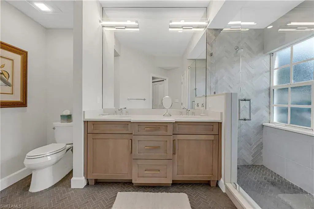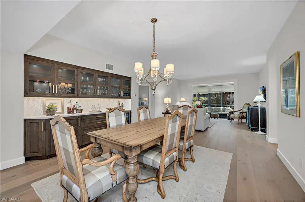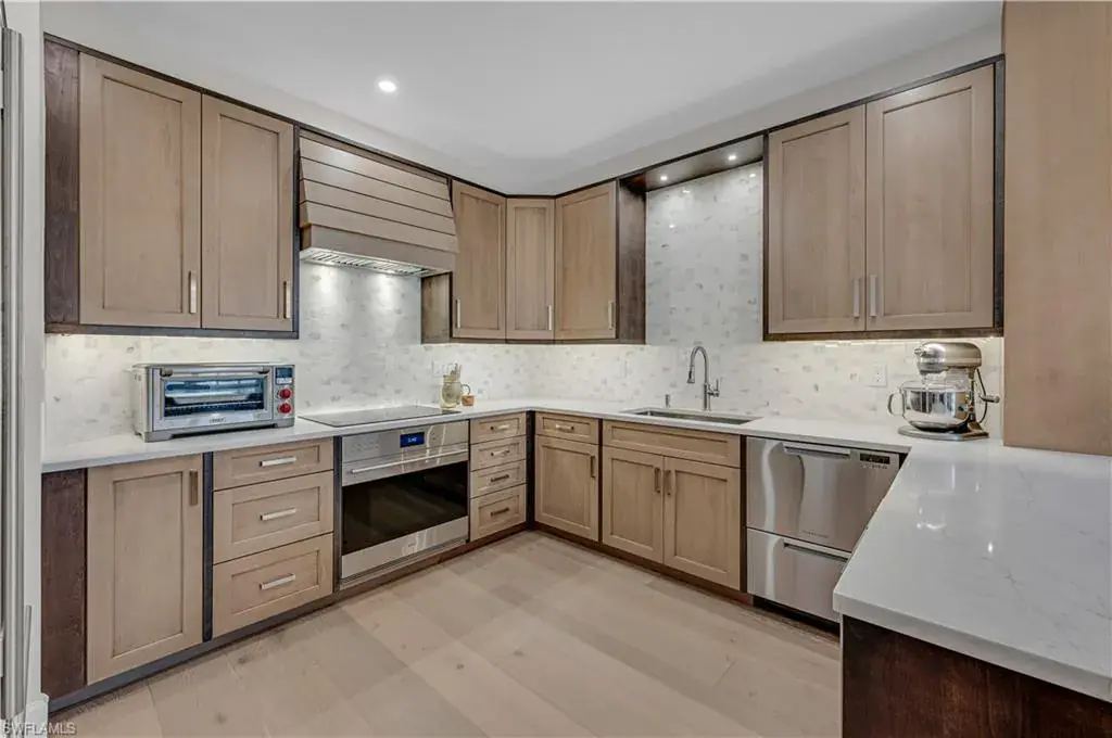 Not to be missed San Marino Condo in Pelican Bay! Fabulous renovation with top of the line features. Current owners did an extensive renovation and used quality material throughout. Gorgeous wide plank white oak flooring in main living and kitchen. Open Kitchen with custom wood cabinets, quartz counter tops, marble backsplash, Sub*Zero Refrigerator, Wolf Induction cooktop. Pantry wall of cabinets. Extensive built in bar with wine fridge in dining area. Renovated primary and guest bathrooms with custom cabinets and beautiful tile selections. Tasteful furnishings, custom window treatments. New cabinets in laundry room. Quality and care throughout. San Marino offers residents it’s own pool, spa, grills, fitness room and social space. It is a also Pet Friendly community allowing 2 pets under 45 pounds OR 1 under 70 pounds. San Marino is conveniently located just across the street from the private Pelican Bay tram stop for quick and easy beach access. Residents of Pelican Bay, enjoy exclusive access to all its premier amenities, including 2 private beachfront restaurants and bars, attended beach service, kayaks, paddle boards, 18 Har-Tru tennis courts, an advanced fitness center, pickleball coming soon, and scenic nature trails for walking and biking. Perfectly situated near Artis Naples, Waterside Shops, and Mercato.