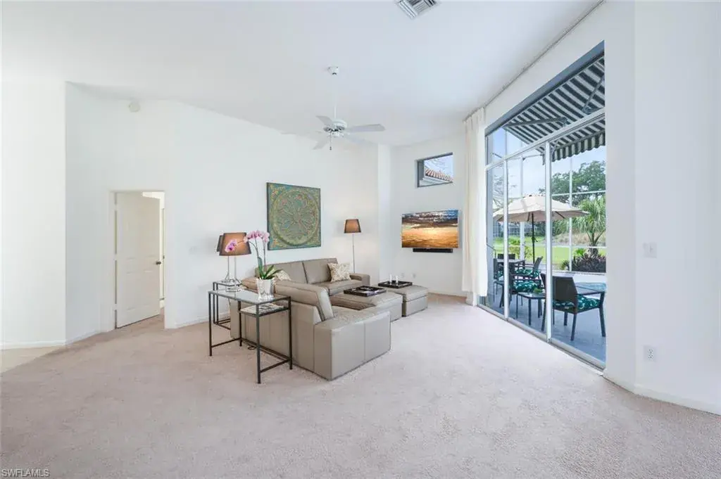 Stunning panoramic views!! Relax and enjoy the peaceful long vistas of the 14th hole! This lovingly maintained seasonal home was originally designed as a model home. Sunlight reflects into all the rooms making this an exceptionally bright home with an inviting floor plan. Vineyards residents take delight with the beautiful landscaping, walking paths and majestic oak tree canopies. Owner upgrades include the tile roof installed in 2018, premium Kitchen Aide stainless steel appliances in the kitchen, tile floors, epoxy garage floor, and the redesigned laundry room complete with a washer and dryer, extra storage and a wet sink. The quality Turnkey furniture package and décor were thoughtfully selected from the Arhaus and Ikea brands. Outstanding maintenance features are included in the association fees. Homes in San Rafael are painted every 8 years while the roofs and the driveways are power washed annually. Additionally, a concrete parking pad is adjacent to the double driveway providing an extra parking space to accommodate guests. Vineyards Country Club offers optional Full or Lifestyle Memberships. This allows residents to select and experience their preferred amenities. San Rafael is located a short drive from Naples picturesque beaches, upscale shops and restaurants, parks, health care facilities and major highways. Vineyards and San Rafael present an ideal opportunity for either a weekend retreat or a permanent residence.