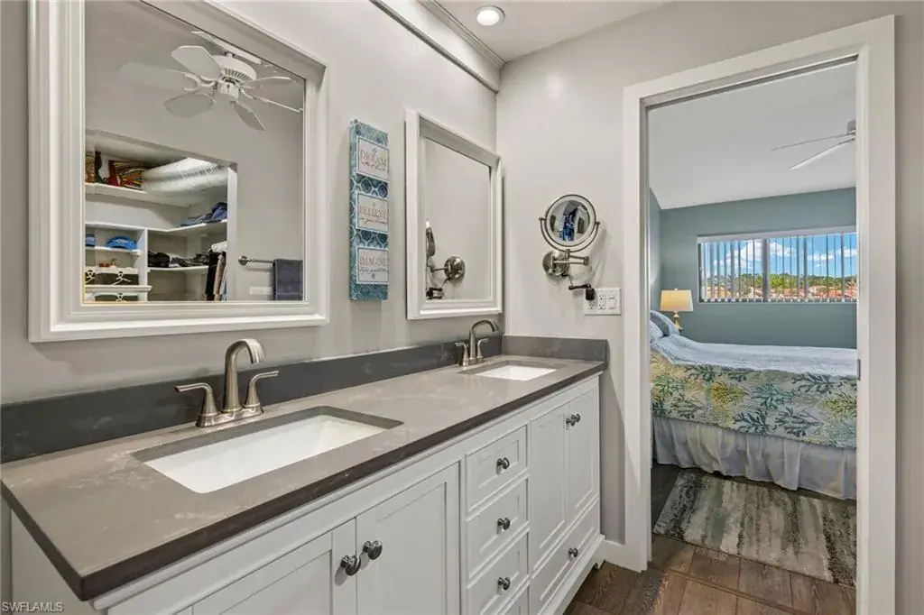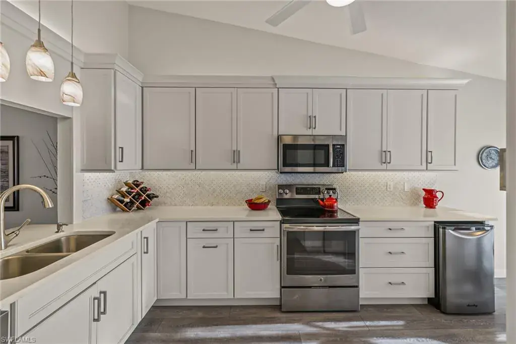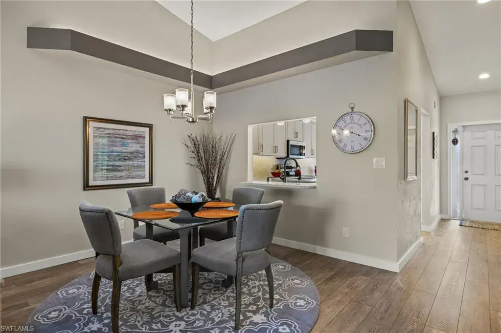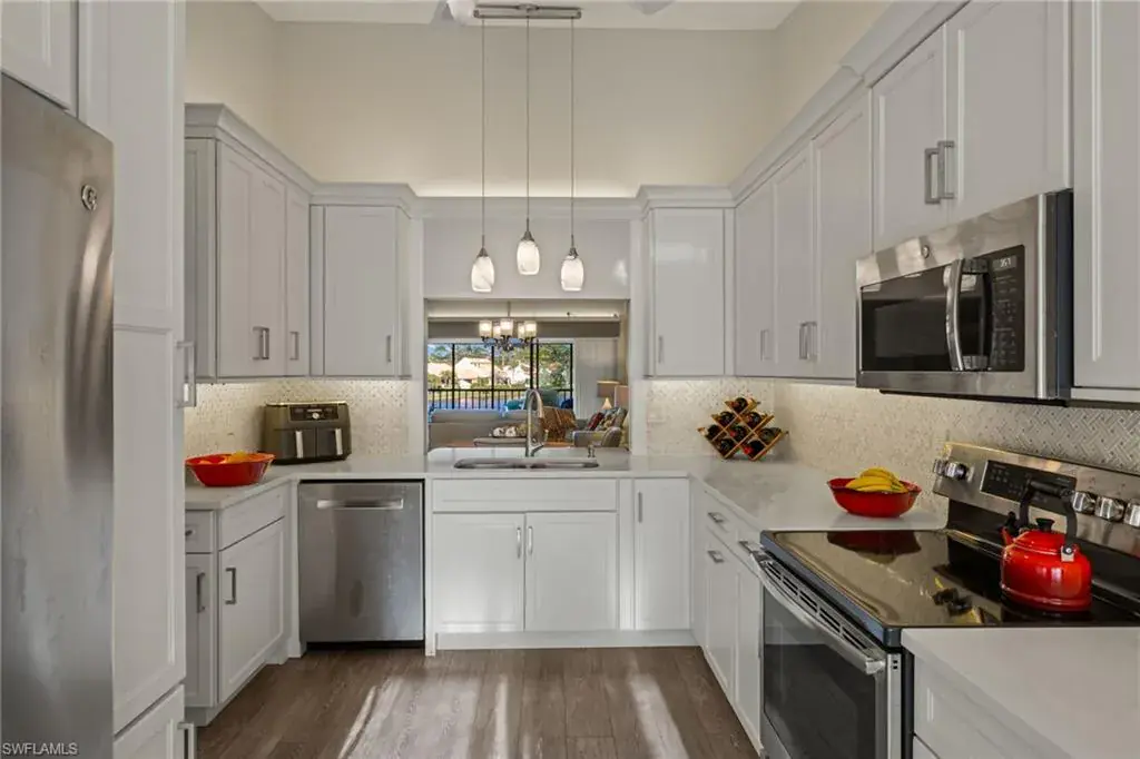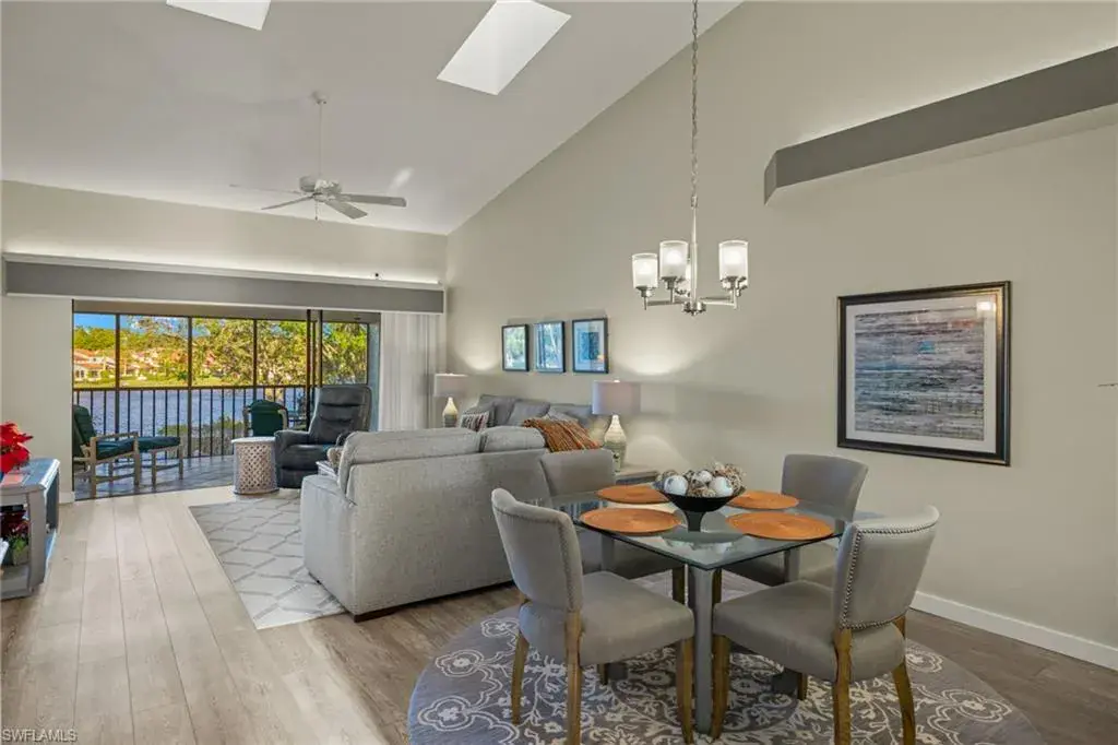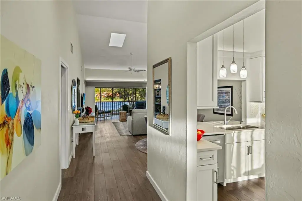 As you step inside, you’ll be captivated by the breathtaking view through the lanai overlooking the lake, elegant wood laminate flooring and soaring ceilings. The updated kitchen boasts quartz countertops and stainless steel appliances, seamlessly blending style and functionality.
