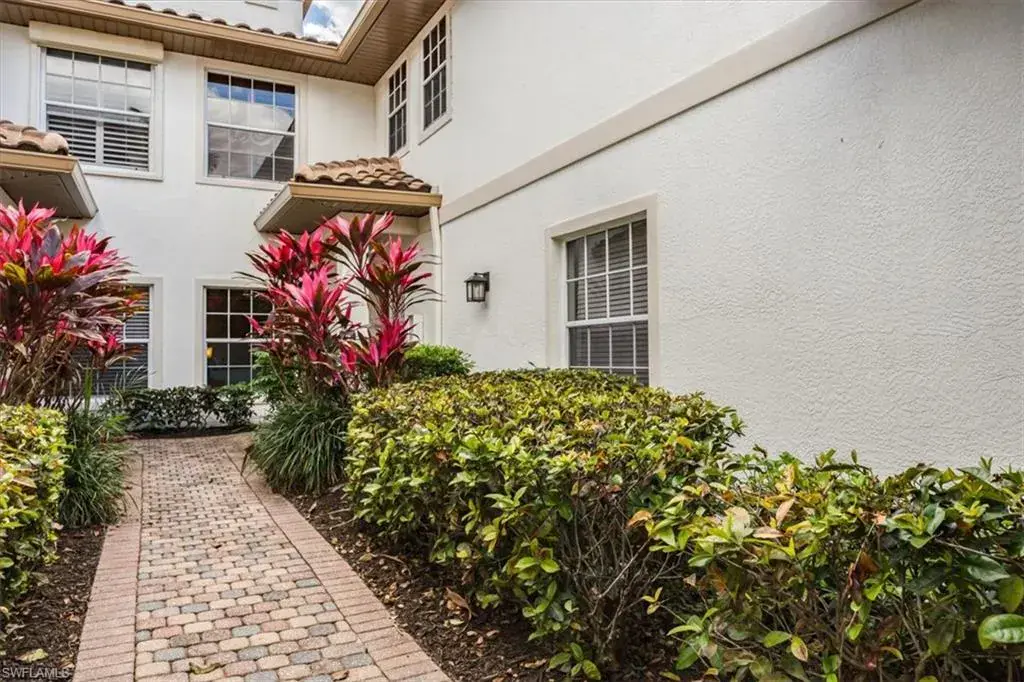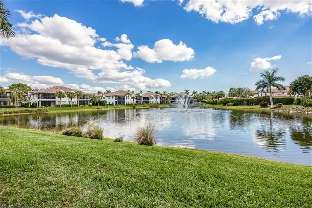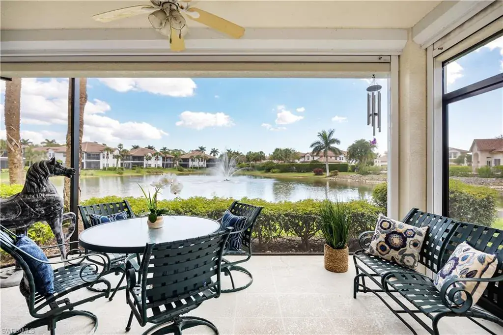 Enjoy stunning lake and fountain views in this first-floor, lakefront, condo featuring: a spacious great room floor plan with 2 bedrooms, a den, and 2 baths. The eat-in kitchen boasts a center island and walk-in pantry, while the primary suite offers a bay window, large walk-in closet, and private bath with dual sinks, soaking tub, and shower. Enjoy wood-look porcelain tile flooring throughout, a walk-in laundry room with sink, ample storage, electric storm shutters, large storage room and an attached 2-car garage — and panoramic screened lanai with stunning lake and fountain views.