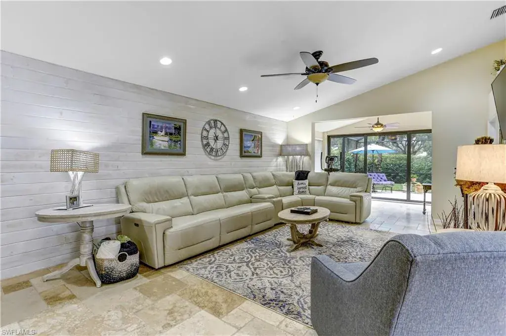 –Timeless Travertine tile in neutral tones of gray, cream, brown, & beige throughout the home except for 2 bedrooms can accent any home style from Coastal Farm House to Modern, wood shiplap feature wall & ceiling, (in neutral colors, but can be painted), white cabinetry, newer refrigerator and dishwasher in cream colors to match the motif of the home, subway tile backsplash, granite counters, raised vanities in baths, new glass shower door in main bath, huge walk-in closet in primary bedroom, and newer large water heater are a few of the many fine features of this home.