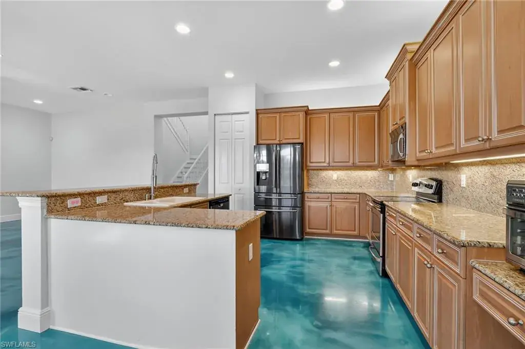 Spacious “Sapphire” floorplan (4 Bedrooms + Loft / 3.5 Baths / 3-Car Garage / 3,773 sq. ft.) is perfectly situated in the highly sought-after, amenity-rich community of Saturnia Lakes. From the moment you enter, you’ll be greeted by soaring 22-foot ceilings, luxury Brand New Epoxy floors throughout ground level and an open, light-filled layout with generously sized rooms throughout. The first-floor primary suite is a true retreat featuring