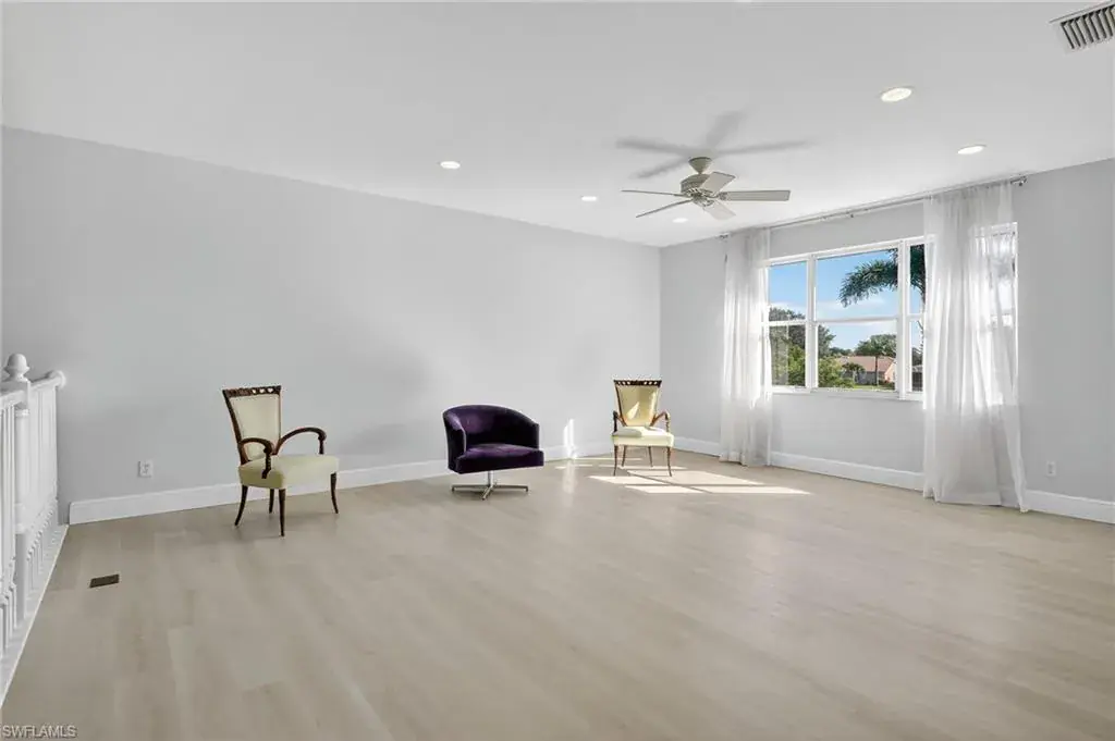 two large walk-in closets, a cozy sitting area, French doors leading to the lanai, and a luxurious bath with dual vanities, a soaking tub, and a brand-new frameless glass shower. Master suite also includes dedicated AC/Heat unit. Upstairs, enjoy a spacious loft/bonus area, three oversized guest bedrooms, and two full bathrooms — perfect for family or guests. Brand new White luxury LVP floors throughout 2 nd floor and stairs. Step outside to