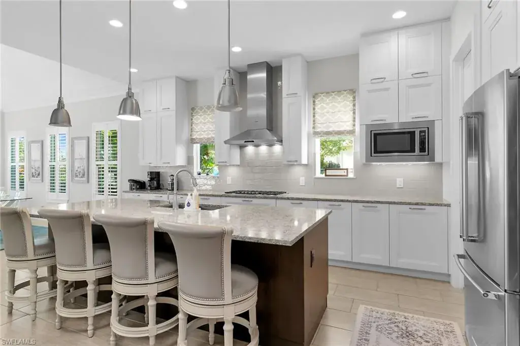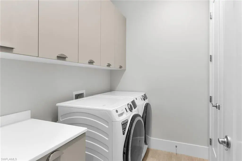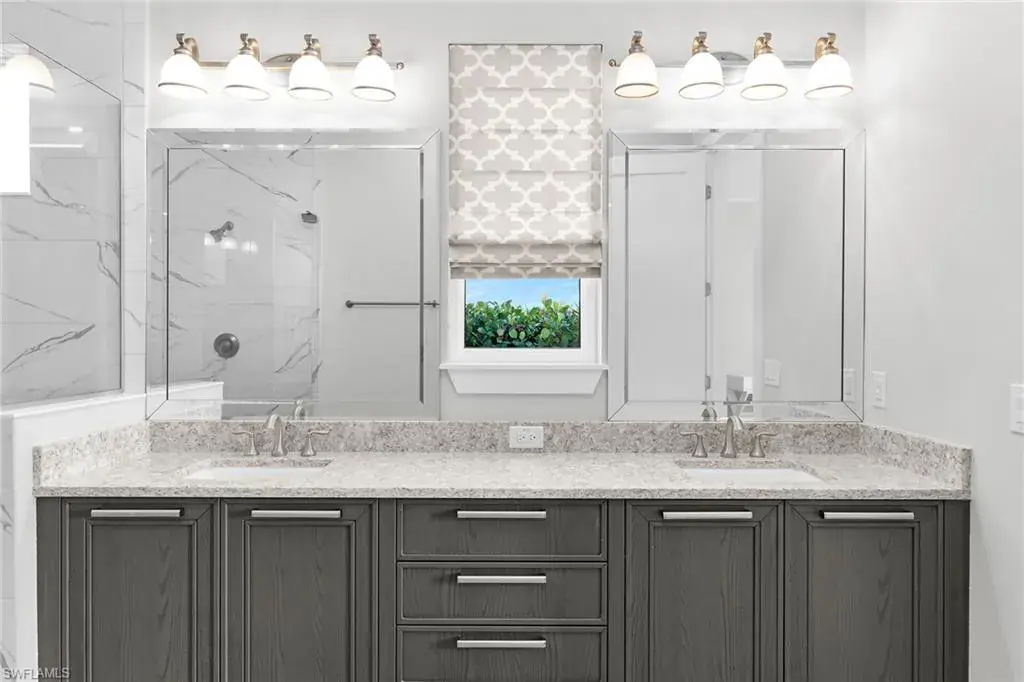Stunning Ashton Woods custom home on a private .29-acre southeast-facing water lot with serene lake and preserve views. This light and bright 3,144 sq ft, 3BR+Den, 3.5BA residence features a dramatic 19’ entry, open great room with gas fireplace, built-in cabinetry, Sonos sound system, and disappearing sliders to the screened lanai. Gourmet kitchen offers Italian Cucine cabinetry, quartz counters, large island, KitchenAid appliances, Thermador gas cooktop, double ovens, Bosch dishwasher, walk-in pantry, and under-cabinet LED lighting. Main-floor master suite includes engineered hardwood floors, vaulted shiplap ceiling, lake views, lanai access, and a spa-style bath with quartz counters, oversized tile shower, and custom closet. Additional highlights include a temperature-controlled 400-bottle wine room, study with built-ins, upstairs loft with water views, and en-suite baths in both guest bedrooms. Outdoor living shines with a large screened lanai, outdoor kitchen (TEC infrared grill + vented hood), Storm Smart remote hurricane screen, and a custom 30’ heated saltwater pool & spa with waterfall and auto overflow. Major upgrades: new saltwater pool system (2021), Storm Smart shutter (2021), solar system with 30 panels + 2 Tesla batteries (2019), impact windows/doors, metal roof, plantation shutters, shiplap feature walls, custom landscaping, 5’ aluminum fence, smart home system, and dual HVAC. Three-car tandem garage, family entry drop zone, walk-in closets, and gated community with manned guardhouse add to the convenience and security of this exceptional property. From its sophisticated design to its cutting-edge energy features and breathtaking water views, this residence offers the best of luxury living—crafted for comfort, elegance, and effortless everyday enjoyment.