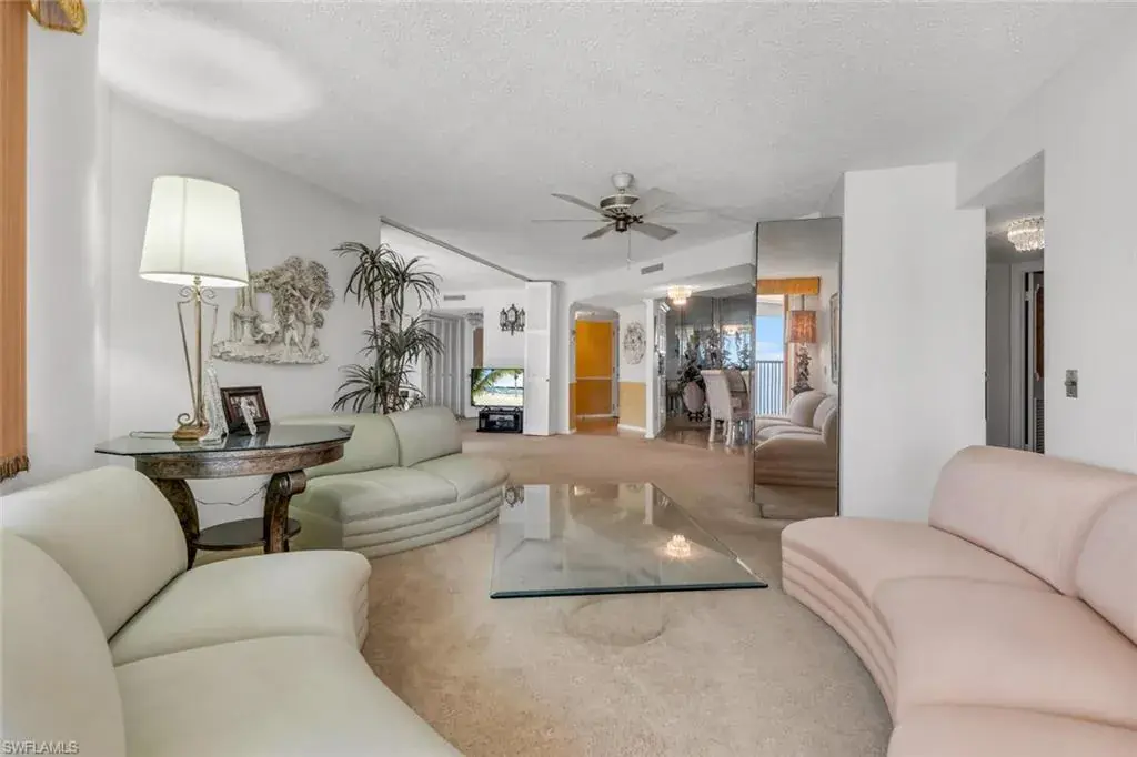 This residence offers 2,400 sq ft of living space, complete with three private lanais and captivating Gulf views. Located on the 15th floor, this spacious layout provides flexibility, with the den easily converted to a third bedroom. The primary suite features direct Gulf views, dual vanities, a 5-piece bath with a jetted tub, and generous walk-in closets. The second bedroom also boasts a walk-in closet and a private en-suite bath and lanai.
