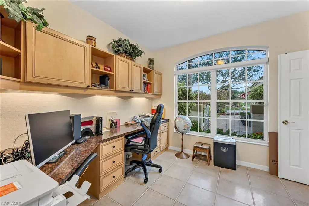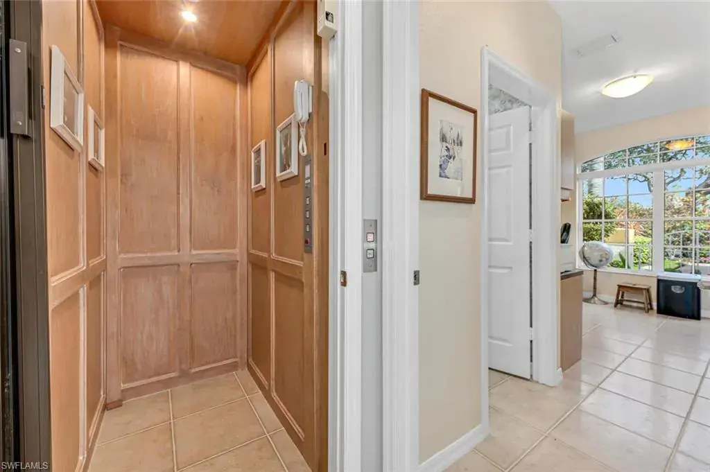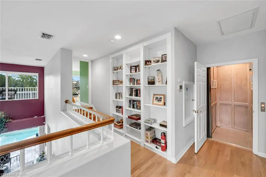 Truly unique and rarely available “Aberdeen” with an additional bonus room ensuite! This is the largest version of this in demand floor plan in The Strand. Impressive, spacious detached villa home boasting a newer roof (2019), power storm protection on the lanai, dedicated golf cart garage bay, and spectacular Western water and golf course views. The property features four true bedrooms, with one being a grand bonus room ensuite. There is also a den with built in shelving, and a large loft space. This home is one of very few in the community with its own private elevator!! There’s also a glamorous tiled open terrace area off of the second-floor bonus room overlooking the pool and view. You’ll quickly fall for this stately property with no home immediately to the left. It is the first home on Persimmon Way, and boasts large windows on the Southern side of the home, allowing the home to be beautiful and bright throughout the day. The rear sliders pocket into the living room wall for a feeling that the living space extends seamlessly outdoors during our beautiful winters. The entire pool area/outdoor space has been extensively updated. The pool decking and pool coping match nicely. The outdoor cabinetry has been updated to create a fresh and bright look. Enjoy an active country club lifestyle, complete with 3 beautifully maintained 9-hole golf courses, tennis, pickleball, all new fitness center, and an impressive pool with lap lanes, newer bocce courts, as well as a recently added croquet center and Island Bar for residents to enjoy. The clubhouse next door to the Jr. Olympic pool houses two upscale restaurants: one upstairs, and the downstairs Tavern 59 restaurant opens into botanical garden/outdoor wedding venue location. The Strand is a golf cart friendly community, and has recently added more dedicated golf cart parking spaces near to the 4 new brand new pickleball courts. Many shopping and dining conveniences are within close proximity, and most importantly, the sugar sand beaches of the Gulf are a straight shot westbound down Immokalee Rd.
