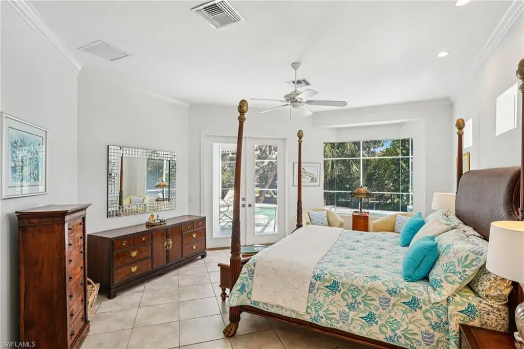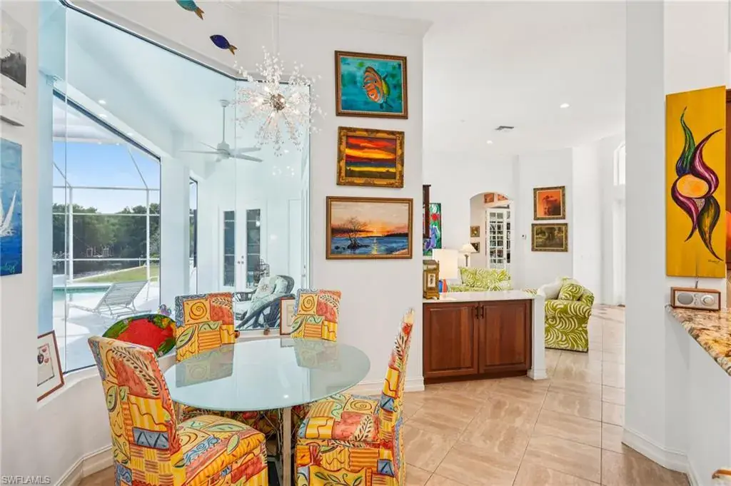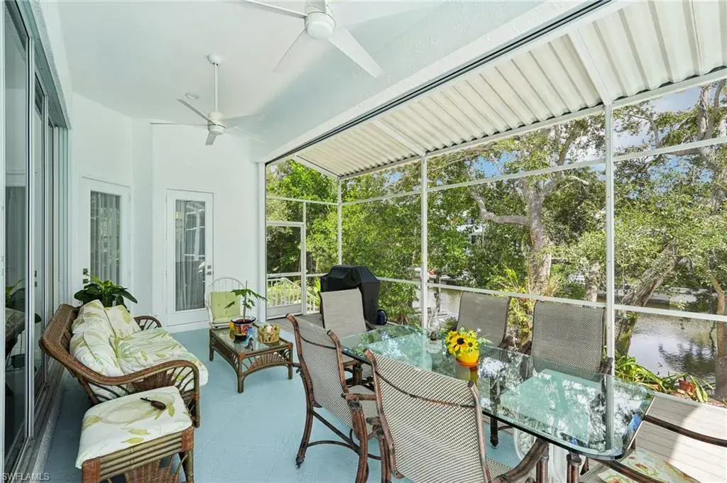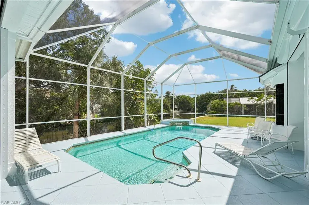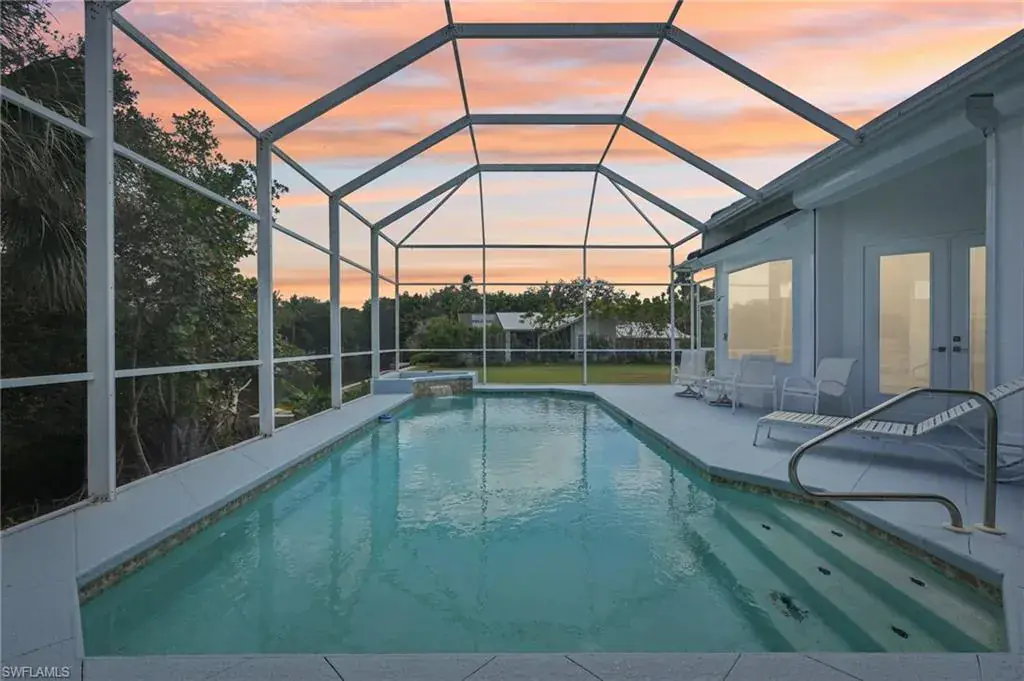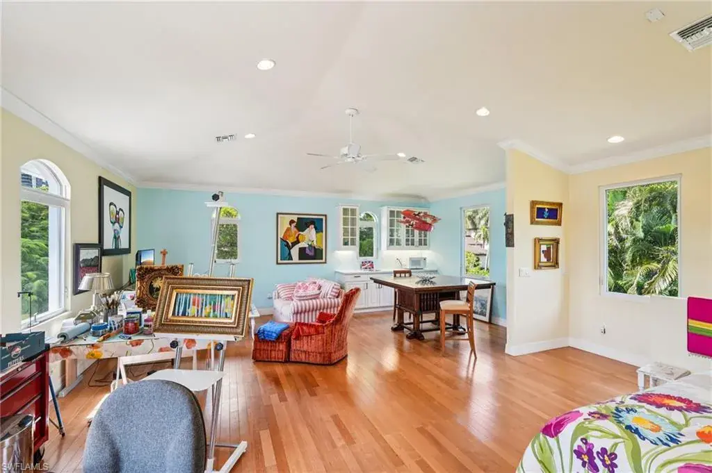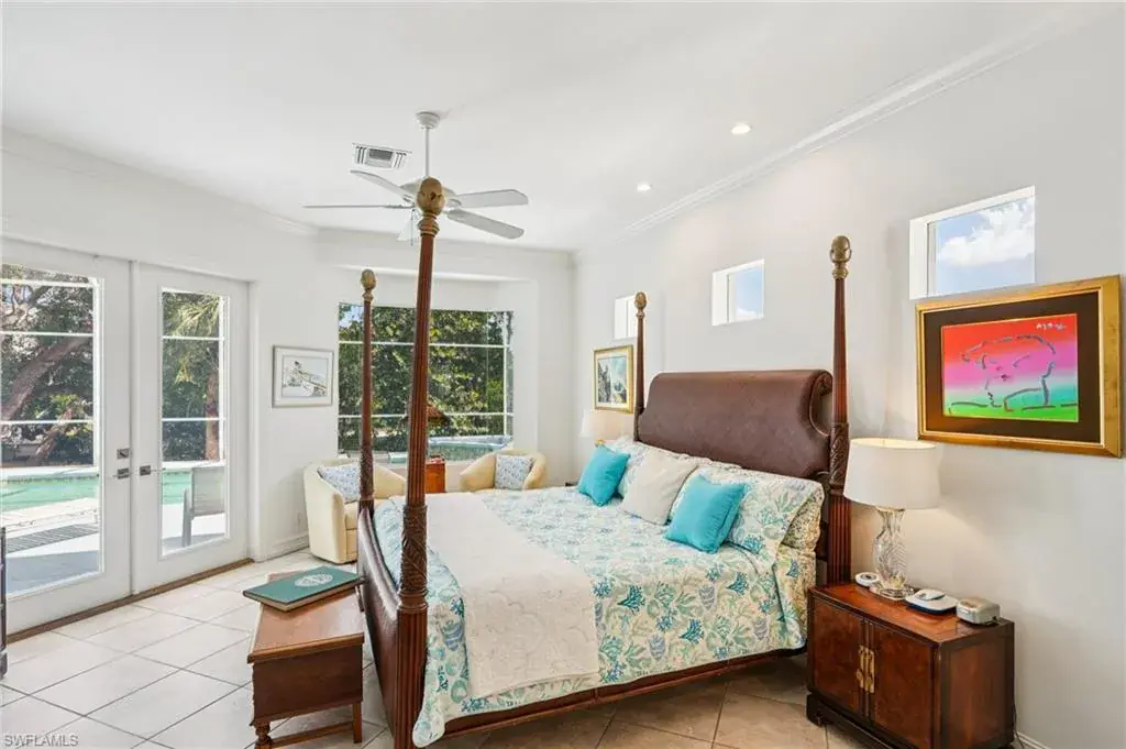 Waterfront Seagate home with tranquil mangrove views and a private dock on a navigable canal (indirect Gulf access; bridge/tidal—well-suited to kayaks, paddleboards, and smaller craft). Everyday living extends outdoors to a deep covered lanai and a screened, heated pool with a water feature and dedicated planting bed. A private, carriage-style studio suite sits above the three-car garage—currently configured as an art studio—with a kitchenette and full bath; its separation from the main house makes it ideal for visiting guests, creative work, or quiet retreat. Inside the main residence, four en-suite bedrooms include a first-floor primary retreat opening by French doors to the lanai, plus a nearby guest en-suite. A light-filled den with built-ins, a formal living room, and a separate family room support both entertaining and downtime, while the island kitchen and a breakfast nook overlook the pool. Peace-of-mind features include impact-rated windows and electric roll-down shutters; practical updates include newer A/C, water heater, and pool pump, fresh exterior paint, and a 2025 roof. The attached three-car garage adds a storage room and interior stairs to the studio.