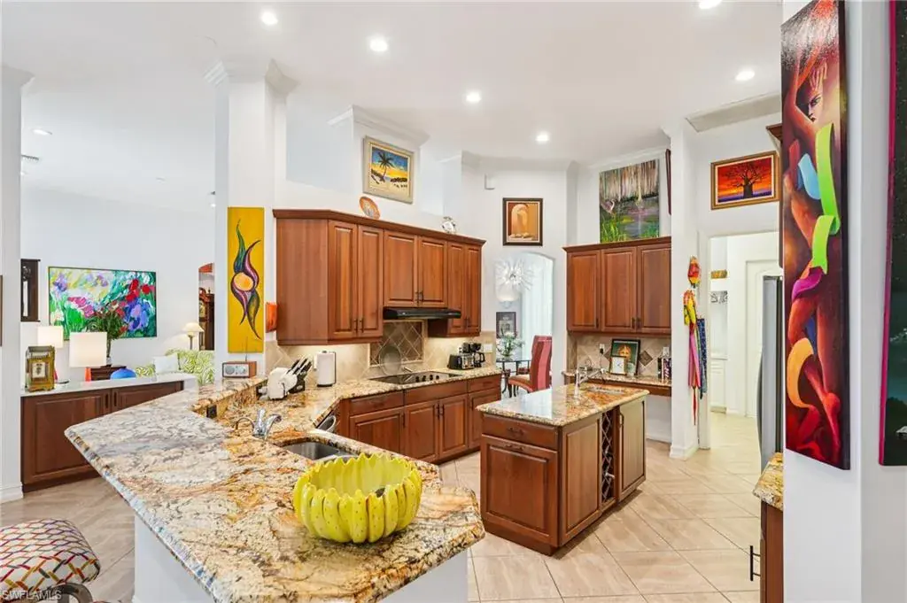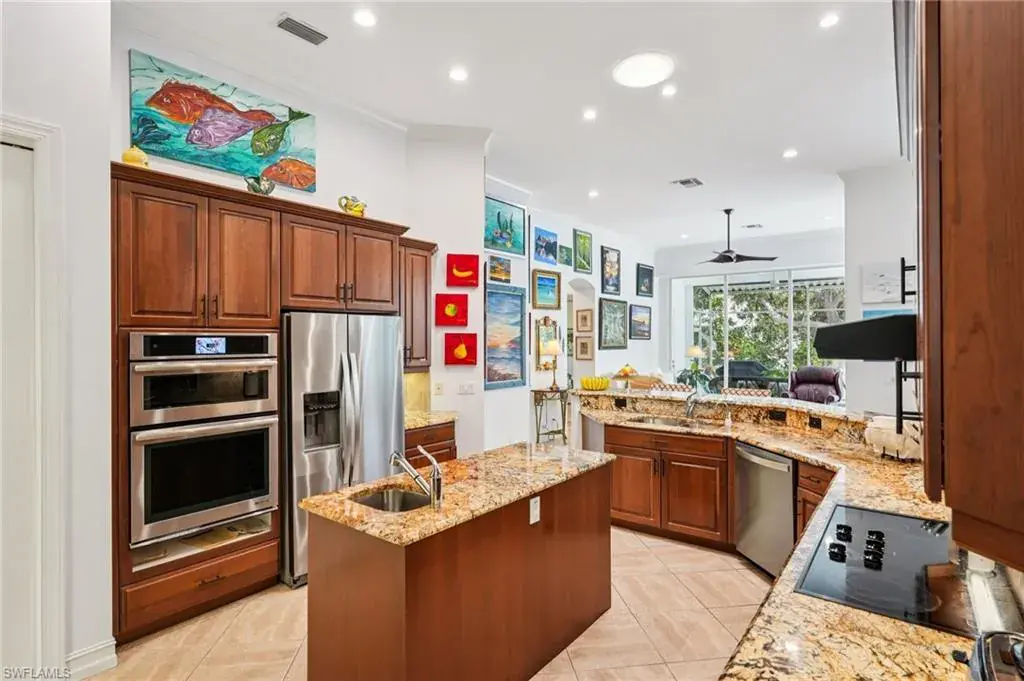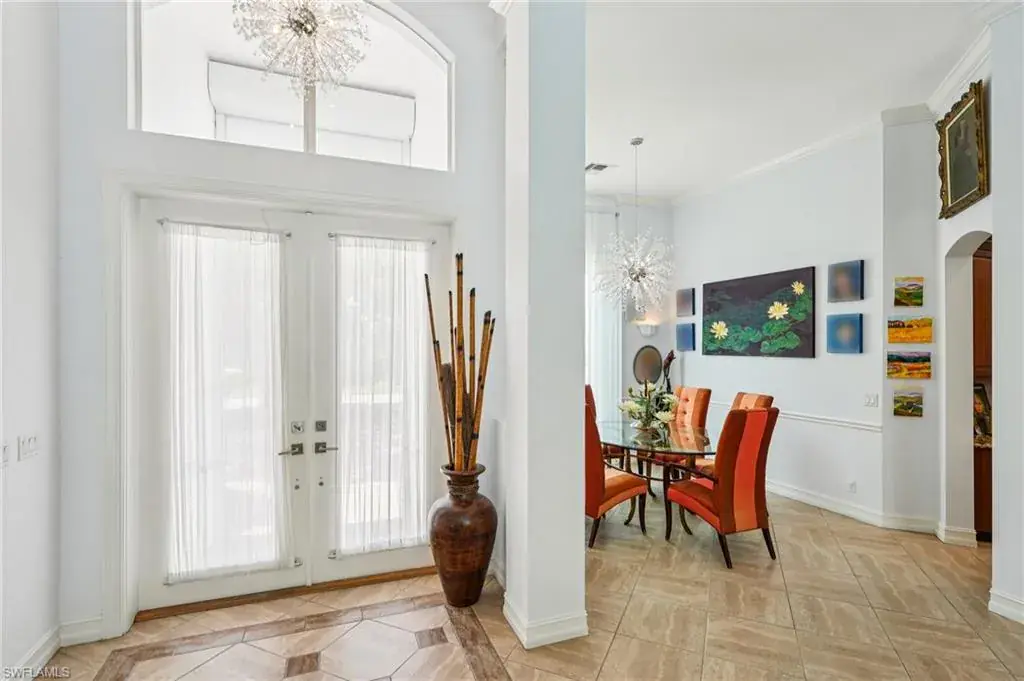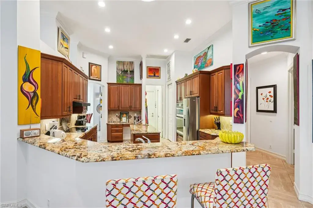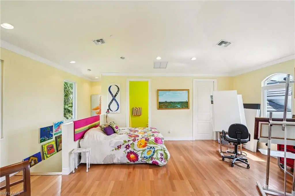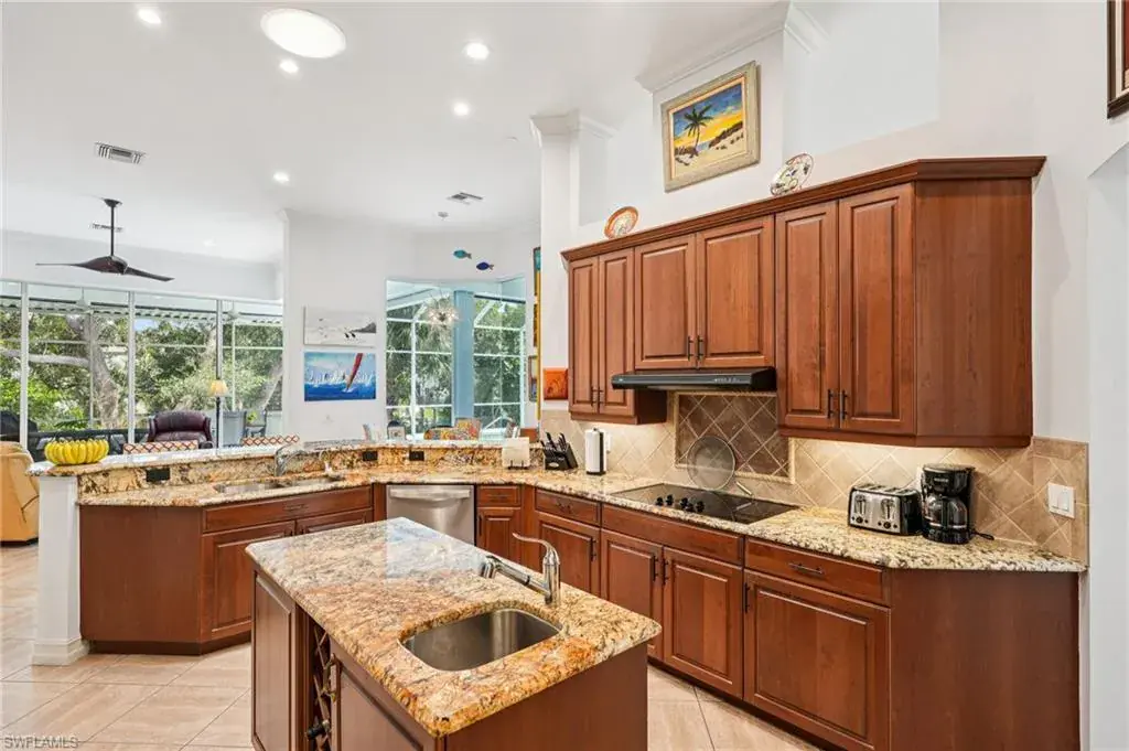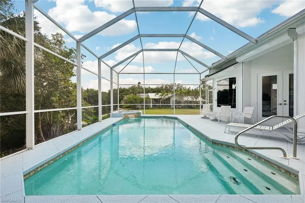 Waterfront Seagate home with tranquil mangrove views and a private dock on a navigable canal (indirect Gulf access; bridge/tidal—well-suited to kayaks, paddleboards, and smaller craft). Everyday living extends outdoors to a deep covered lanai and a screened, heated pool with a water feature and dedicated planting bed. A private, carriage-style studio suite sits above the three-car garage—currently configured as an art studio—with a kitchenette and full bath; its separation from the main house makes it ideal for visiting guests, creative work, or quiet retreat. Inside the main residence, four en-suite bedrooms include a first-floor primary retreat opening by French doors to the lanai, plus a nearby guest en-suite. A light-filled den with built-ins, a formal living room, and a separate family room support both entertaining and downtime, while the island kitchen and a breakfast nook overlook the pool. Peace-of-mind features include impact-rated windows and electric roll-down shutters; practical updates include newer A/C, water heater, and pool pump, fresh exterior paint, and a 2025 roof. The attached three-car garage adds a storage room and interior stairs to the studio.
