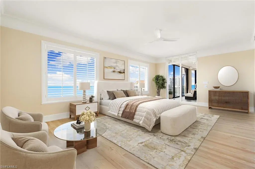 Ideally positioned on the 11th floor of the prestigious Seasons at Naples Cay, this three-bedroom plus den sky home showcases sweeping Gulf views and a spacious, residence-style layout. Step from your private elevator lobby into the expansive great room, where a dramatic wall of windows frames the coastline and 9+ ft ceilings combined with refined wood flooring create an inviting, airy ambiance ready for your personal design vision. The gourmet kitchen exudes coastal sophistication with white quartz countertops, a light tile backsplash, custom cabinetry, natural gas range, and abundant storage, all seamlessly flowing into the dining area and beyond. Designed for privacy, the split bedroom layout features a serene primary suite complete with dual walk-in closets, a generous spa-inspired bath, and unobstructed Gulf views. The separate guest wing includes two ensuite bedrooms and access to an eastern-facing terrace—perfect for sunrises. Additional highlights include newly replaced windows, two parking spaces, and two extra storage units. Behind the secure gates of Naples Cay, The Seasons offers world-class amenities: a resort-style pool with outdoor cooking and bar, a state-of-the-art fitness center, 24-hour security, and more—delivering an exceptional coastal lifestyle.