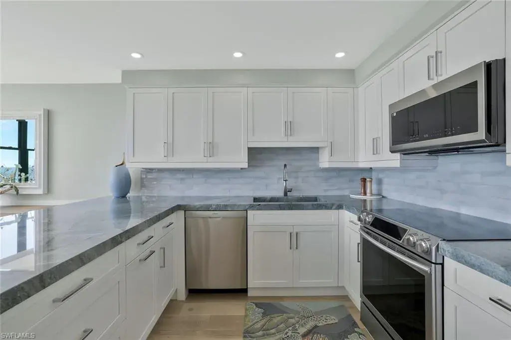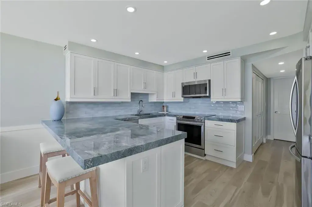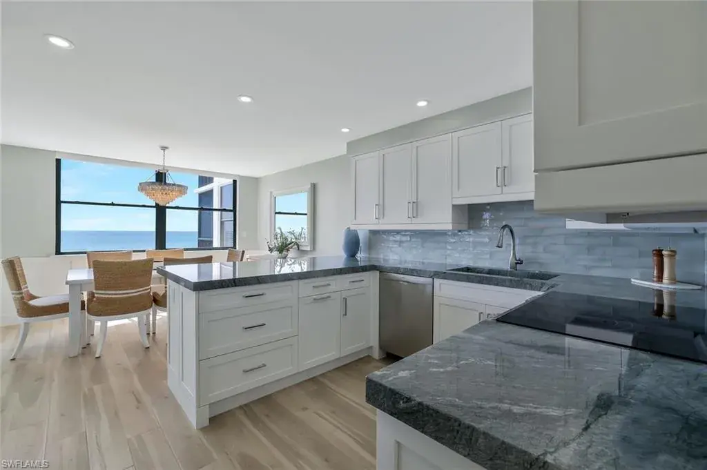 This direct beachfront, fully remodeled, turnkey 2-bed, 2-bath retreat invites you to indulge in the ultimate coastal lifestyle. Thanks to the home’s thoughtful design and ideal orientation, refreshing salt-laced cross breezes flow effortlessly throughout, creating a naturally invigorating and tranquil ambiance. Enjoy breathtaking Gulf views from nearly every angle while the rhythmic waves provide a soothing soundtrack to daily life. Designed in a coastal contemporary style, this stunning condo boasts wood-style tile flooring throughout, a beautifully remodeled chef’s kitchen (2022) with high-end countertops, brand-new appliances, and a sleek glass subway tile backsplash. Both spa-like bathrooms have been impeccably redesigned (2022), ensuring every inch of this condo exudes modern luxury. Beyond your private oasis, Seawatch has been completely revitalized, featuring a new roof, fresh coastal-white exterior paint, a fully remodeled lobby and social room, new landscaping, and a newly redesigned pool deck. La Playa, the Ritz-Carlton, the renowned Turtle Club, and the ultra-luxurious Ritz-Carlton Residences are close at hand. Upscale shopping, fine dining, and vibrant entertainment await just moments away at Mercato, Waterside Shops, and Artis Naples. Experience boutique beachfront living at its finest.