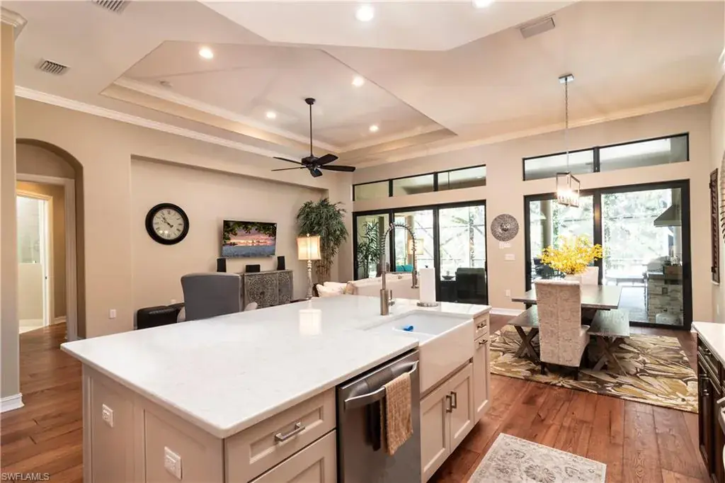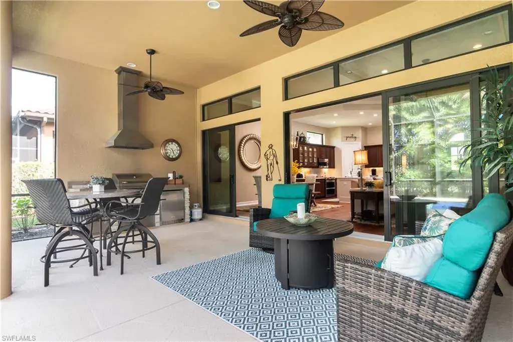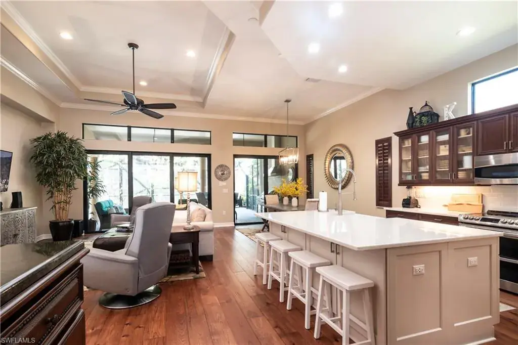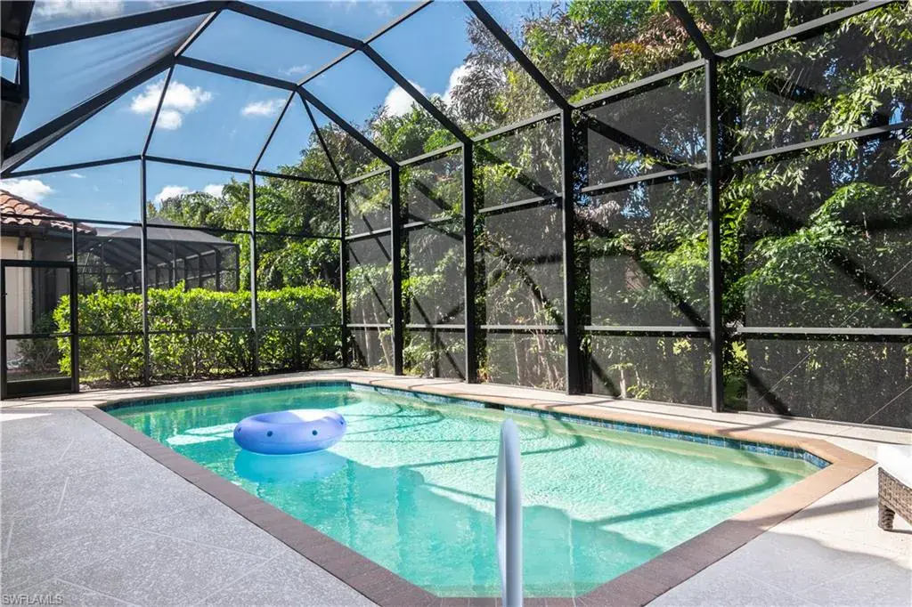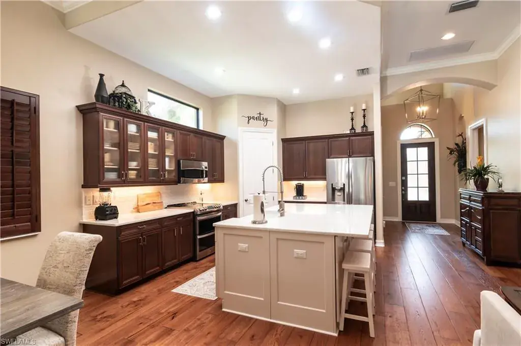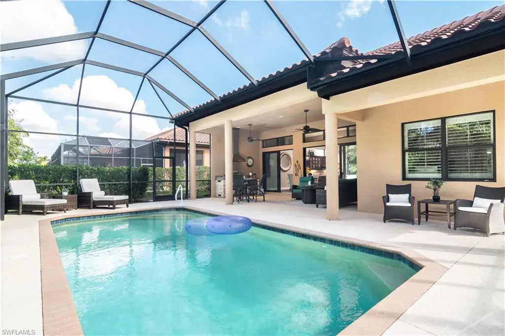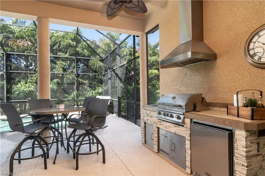 WOW! Every detail, top to bottom, has been upgraded in this 3 bed, 2 bath, San Remo III pool home. First impressions are everything with lush landscaping leading to the gorgeous high-impact iron and glass front door. The home opens to soaring 12 ft cove ceilings, transom windows for cascading natural light, extra canned ceiling lights, new light fixtures and fans, crown molding, plantation shutters, and an inviting West facing view of the pool and outdoor living space. Sunsets every night are the perfect backdrop to an open floor plan where entertaining is effortless between indoor and outdoor spaces. Totally renovated kitchen, one-level island with extra storage and pullouts, quartz countertops, newer appliances including a double oven, and built-in pantry shelving. Enjoy the best of alfresco living in a brand new outdoor kitchen with gas grill and exhaust hood, leaving nothing to be desired for your family grill master. Engineered wide plank wood flooring throughout, all high-impact windows and doors, renovated bathrooms with quartz counters, stunning walk-in shower in master bath, along with two vanities and extra cabinets. No shortage of storage space with additional closets created in hallway, laundry room, and office. Six feet of additional deep garage space with epoxy flooring, plus a finished floor in attic for even more storage. A very private and quiet neighborhood with low fees in North Naples! Close to everything. A must see community and home that will impress you at every turn. Luxury is in the details and this home has it all!