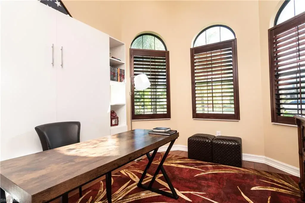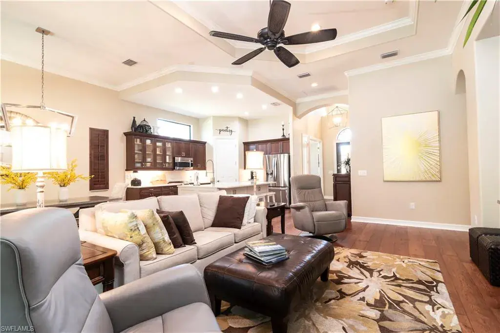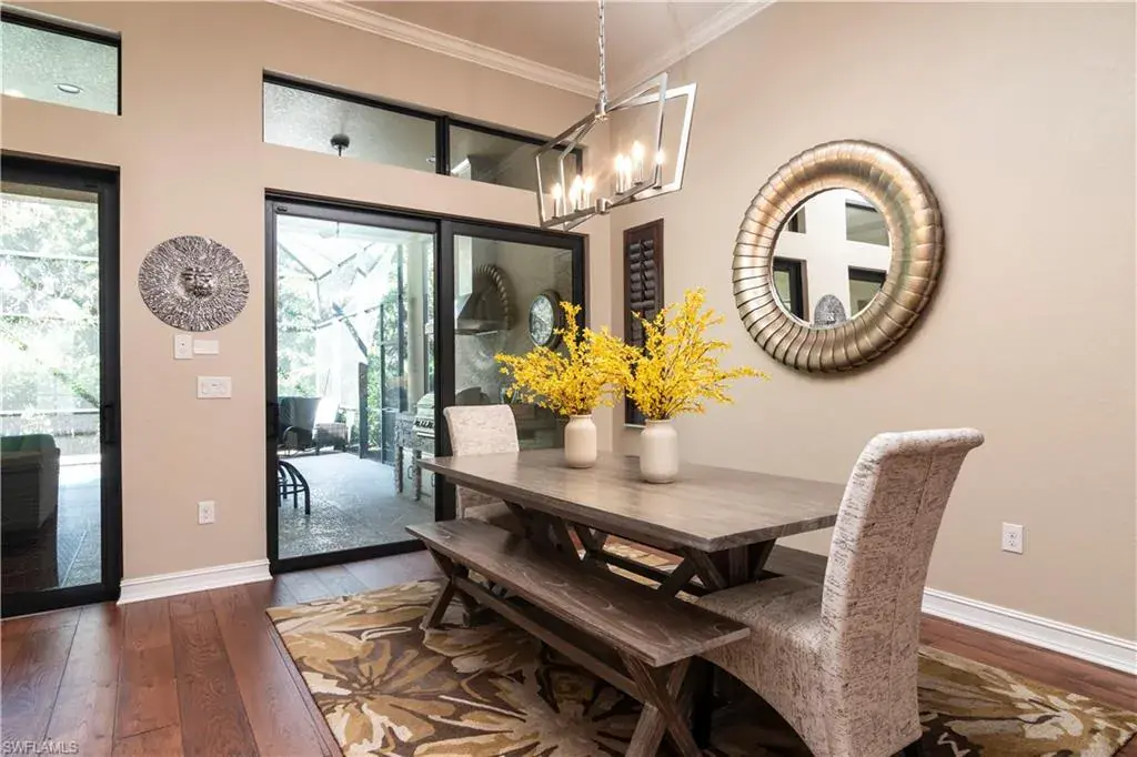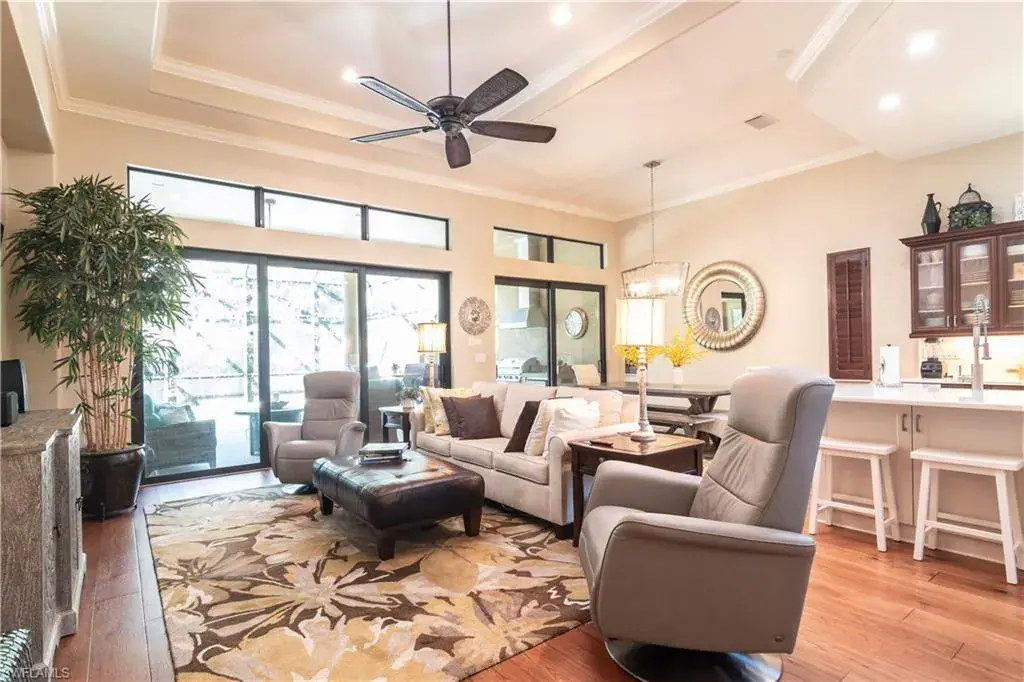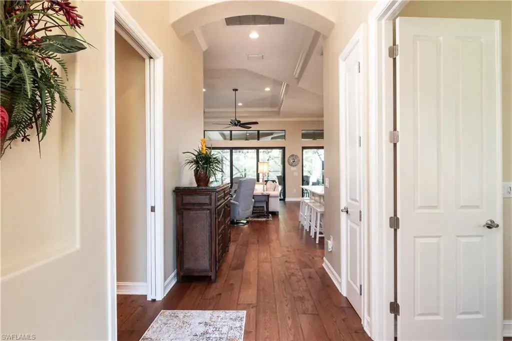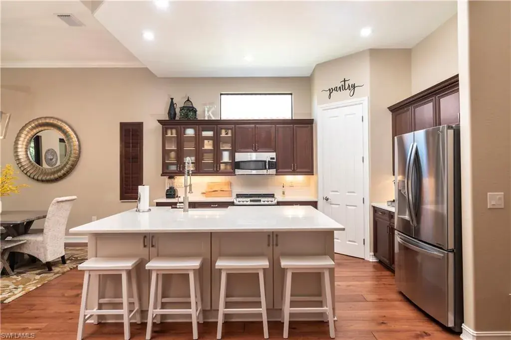 WOW! Every detail, top to bottom, has been upgraded in this 3 bed, 2 bath, San Remo III pool home. First impressions are everything with lush landscaping leading to the gorgeous high-impact iron and glass front door. The home opens to soaring 12 ft cove ceilings, transom windows for cascading natural light, extra canned ceiling lights, new light fixtures and fans, crown molding, plantation shutters, and an inviting West facing view of the pool and outdoor living space. Sunsets every night are the perfect backdrop to an open floor plan where entertaining is effortless between indoor and outdoor spaces. Totally renovated kitchen, one-level island with extra storage and pullouts, quartz countertops, newer appliances including a double oven, and built-in pantry shelving. Enjoy the best of alfresco living in a brand new outdoor kitchen with gas grill and exhaust hood, leaving nothing to be desired for your family grill master. Engineered wide plank wood flooring throughout, all high-impact windows and doors, renovated bathrooms with quartz counters, stunning walk-in shower in master bath, along with two vanities and extra cabinets. No shortage of storage space with additional closets created in hallway, laundry room, and office. Six feet of additional deep garage space with epoxy flooring, plus a finished floor in attic for even more storage. A very private and quiet neighborhood with low fees in North Naples! Close to everything. A must see community and home that will impress you at every turn. Luxury is in the details and this home has it all!