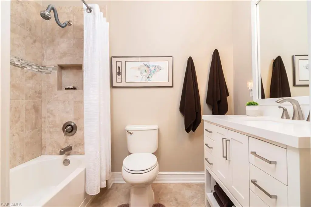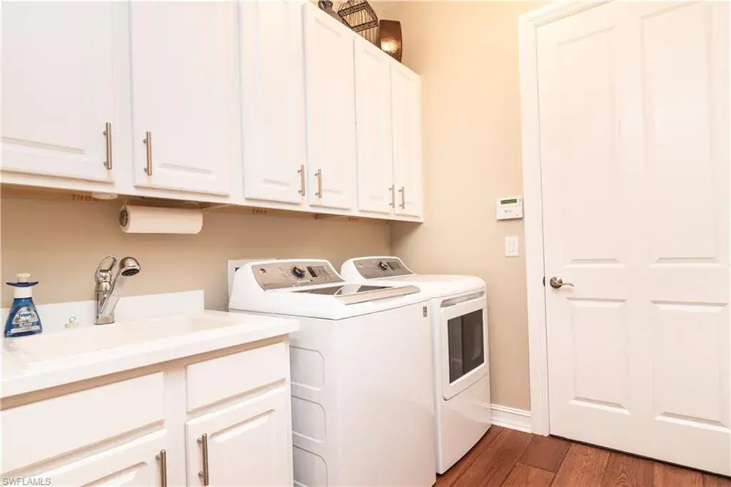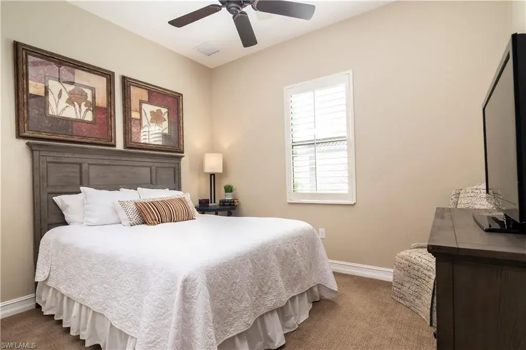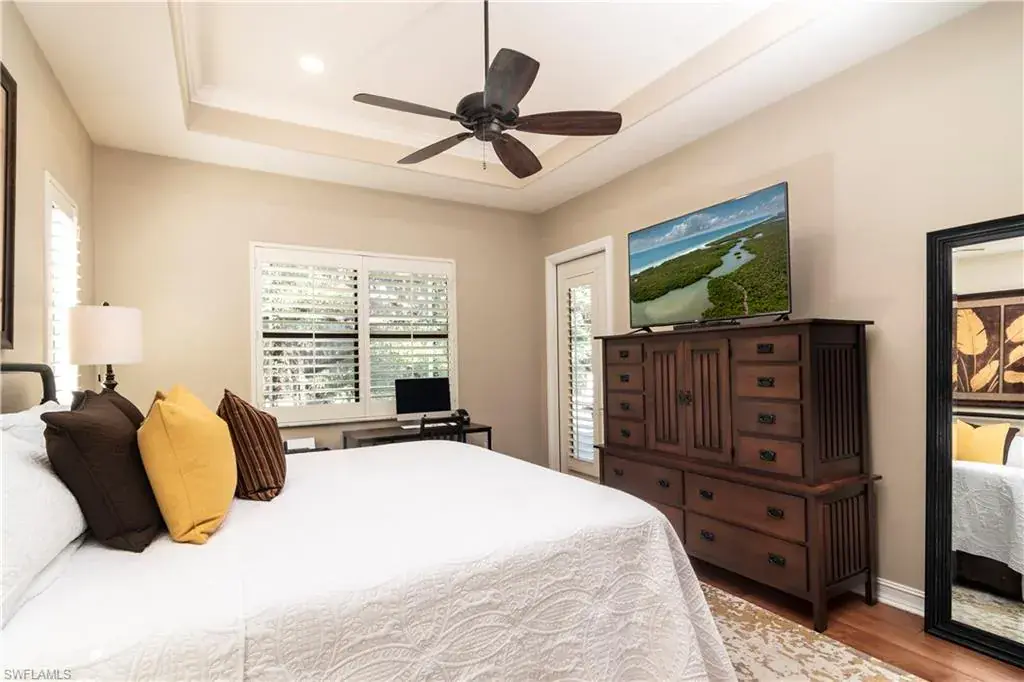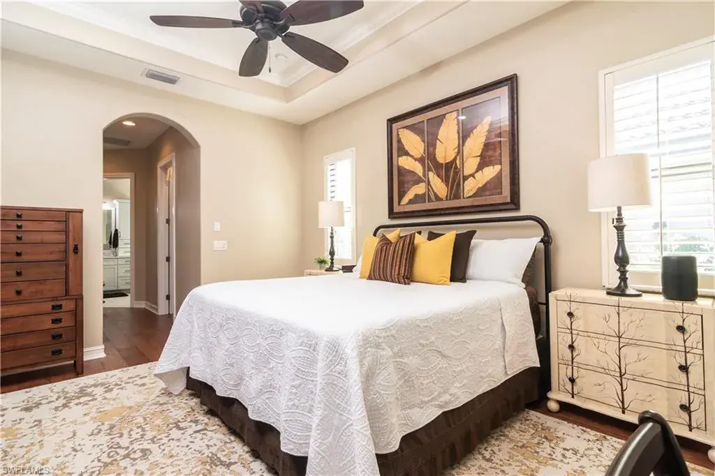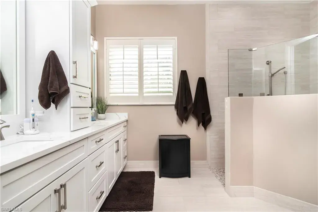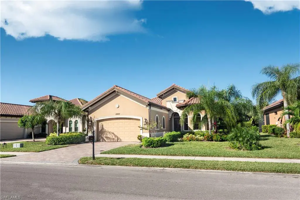 WOW! Every detail, top to bottom, has been upgraded in this 3 bed, 2 bath, San Remo III pool home. First impressions are everything with lush landscaping leading to the gorgeous high-impact iron and glass front door. The home opens to soaring 12 ft cove ceilings, transom windows for cascading natural light, extra canned ceiling lights, new light fixtures and fans, crown molding, plantation shutters, and an inviting West facing view of the pool and outdoor living space. Sunsets every night are the perfect backdrop to an open floor plan where entertaining is effortless between indoor and outdoor spaces. Totally renovated kitchen, one-level island with extra storage and pullouts, quartz countertops, newer appliances including a double oven, and built-in pantry shelving. Enjoy the best of alfresco living in a brand new outdoor kitchen with gas grill and exhaust hood, leaving nothing to be desired for your family grill master. Engineered wide plank wood flooring throughout, all high-impact windows and doors, renovated bathrooms with quartz counters, stunning walk-in shower in master bath, along with two vanities and extra cabinets. No shortage of storage space with additional closets created in hallway, laundry room, and office. Six feet of additional deep garage space with epoxy flooring, plus a finished floor in attic for even more storage. A very private and quiet neighborhood with low fees in North Naples! Close to everything. A must see community and home that will impress you at every turn. Luxury is in the details and this home has it all!