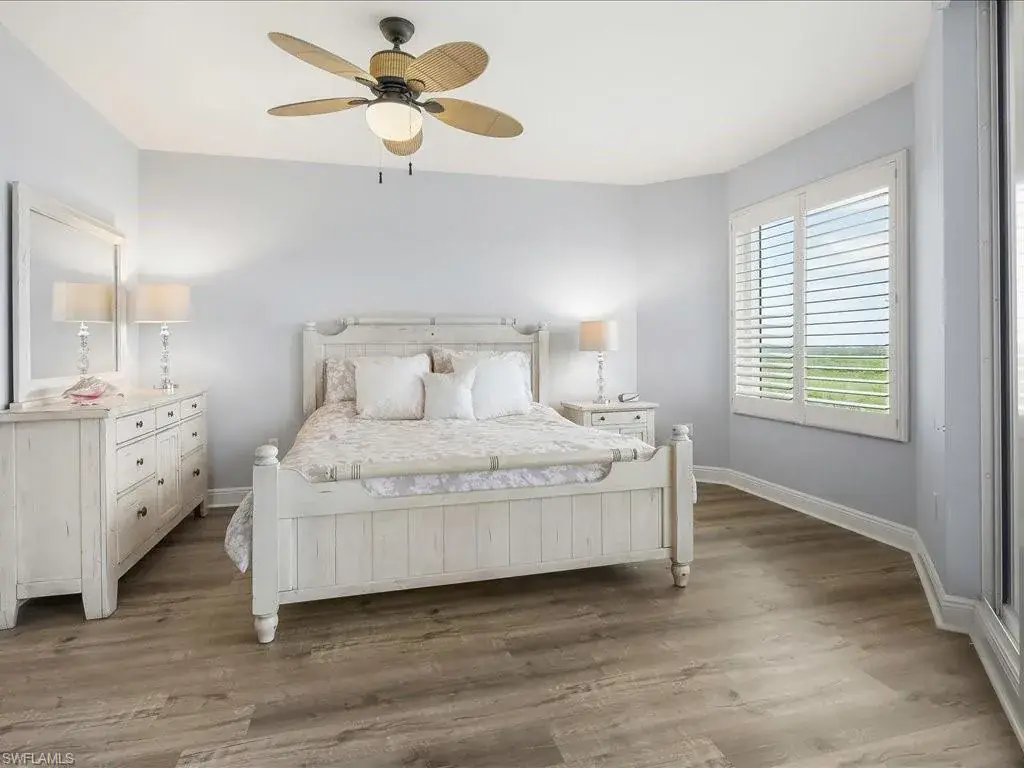 The master bedroom is a private sanctuary, designed with a soothing coastal palette, lanai access, two generous walk-in closets, and a luxurious ensuite bath complete with dual vanities, a spa-style tub, walk-in shower and private water closet.