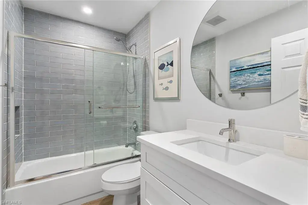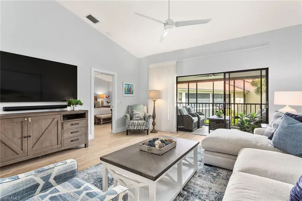 In the private oasis of Serendipity this beautifully renovated, turnkey, two bedrooms, two baths, furnished, coastal contemporary condominium in Pelican Bay is move-in ready. Within this spacious open-concept home is wide plank porcelain tile flooring with soaring vaulted ceilings. The kitchen has been totally remodeled including Adomus ¾-inch custom cabinetry, Pompeii quartz countertops, pantry, magnificent center island with counter seating and stainless-steel appliances. Each bath has been updated with high-end finishes which include high gloss ceramic backsplash, frameless ultra clear glass shower, fogless mirrors and walk-in closets. This gorgeous second-floor unit also offers plantation shutters throughout, LED lighting, remote-controlled window treatments and a large screened, glassed in lanai and access to two pools, spas and club clubhouse all surrounded by lush, beautifully landscaped grounds. This conveniently located condominium offers proximity to Artis-Naples/Baker Museum, Waterside Shops, two private beach club restaurants with beachside dining, chair and umbrella services, kayaks, sailboats, paddle boards, convenient tram service for easy access, and miles of nature trails great for biking, recreation and jogging. As a Pelican Bay resident, enjoy world-class amenities which feature three miles of private beachfront, a vibrant community center, art studio, card rooms, state-of-the-art fitness center, full-service fitness classes, wellness spa, world-class tennis with 18 Har-Tru courts and a new racquet center that will include eight additional Har-Tru courts and 20 pickleball courts. Pelican Bay offers the ultimate Naples lifestyle. Don’t miss this rare opportunity!