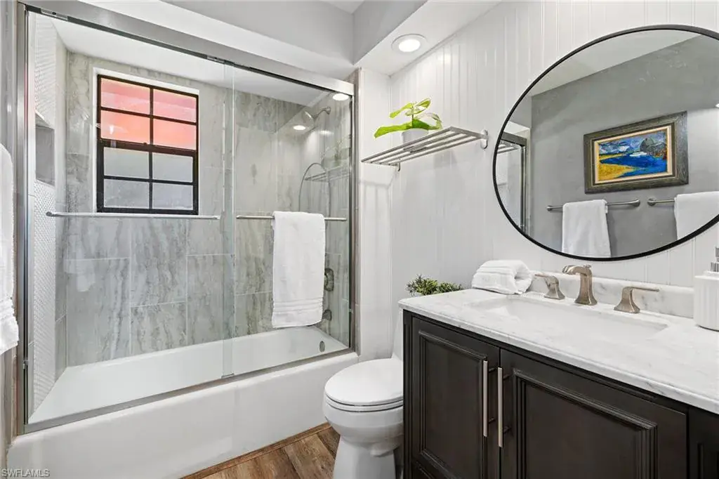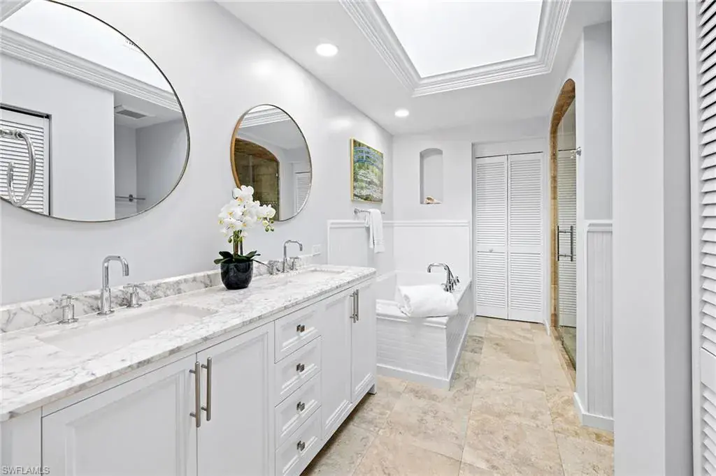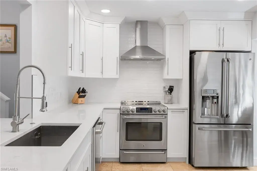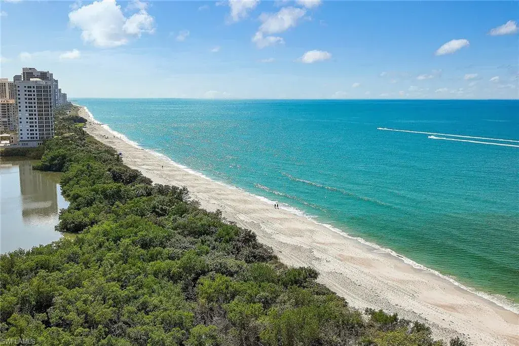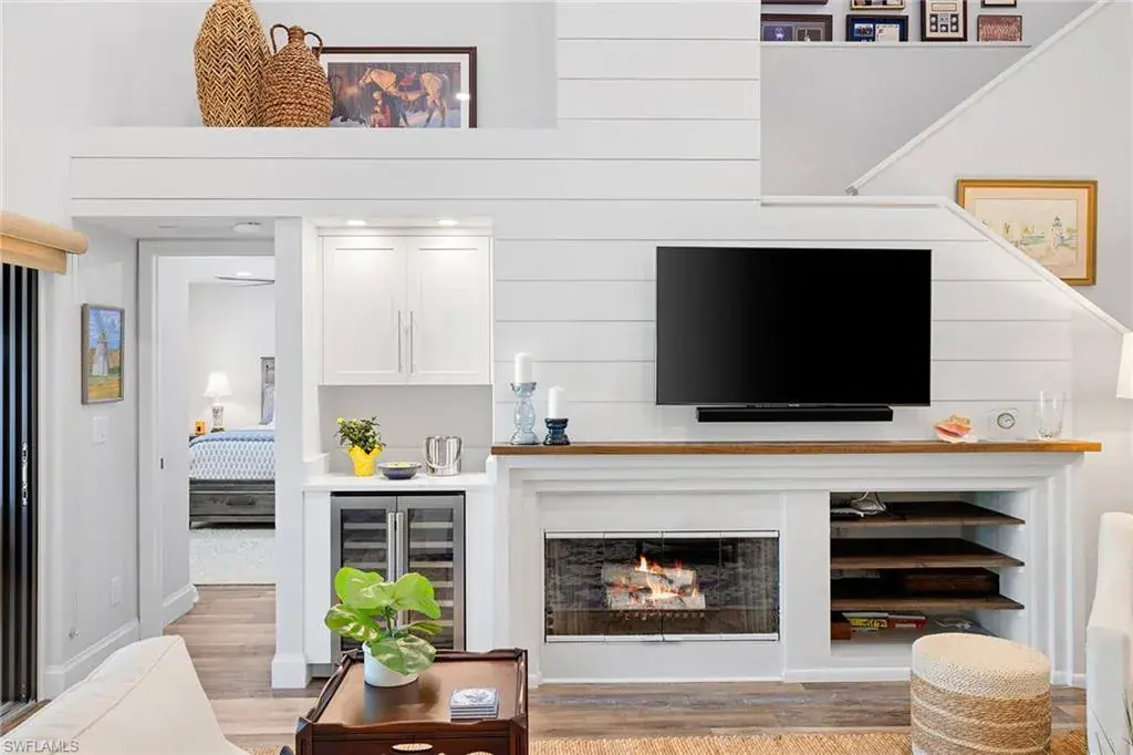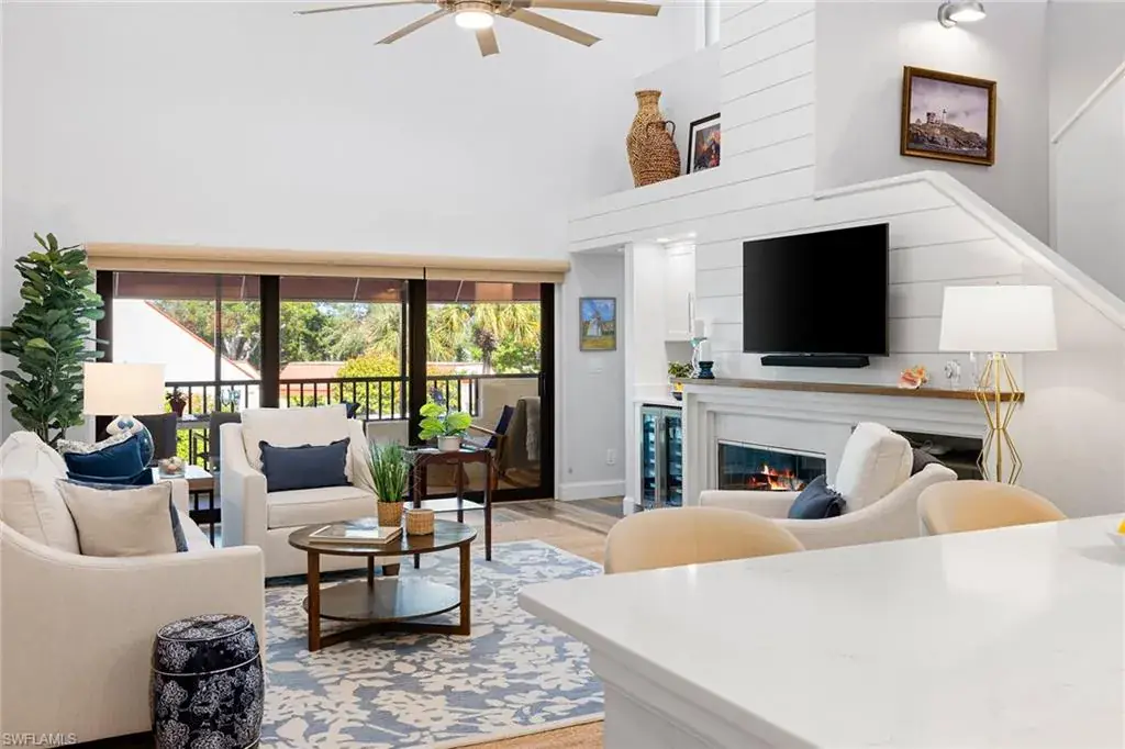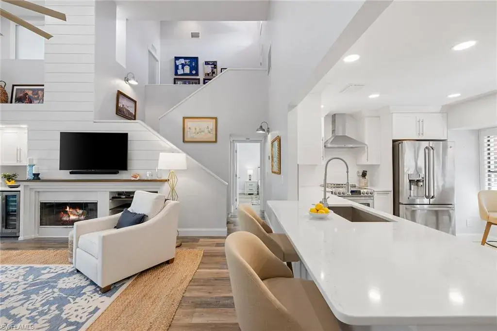 Fully updated, light and airy three-bedroom three-bath multi-level condominium with tasteful coastal finishes. In the desired south end of Pelican Bay and lives like a private villa with a second-floor entrance and soaring 16-foot cathedral ceilings. Walk to Waterside Shops, dining, Artis-Naples and Baker Museum. Offered turnkey with exclusions. Featuring a new kitchen with quartz countertops, soft-close cabinetry, and Bosch & GE Café appliances. A large owner’s suite offers a spa-like bath with soaking tub, frameless glass shower, double vanity and dual walk-in closets. A junior suite and third bedroom with updated bath. The living room includes a fireplace, beverage cooler, impact glass sliders opening to a private lanai overlooking a peaceful lagoon, water feature, and one of two community pools. Extras include custom shutters, HVAC air purifier, new roof, updated electrical and fresh exterior paint. Pet-friendly and charming home in amenity-rich Pelican Bay with private beachfront cabana service, dining, tennis/pickleball, fitness and vibrant social scene. It’s all ready for you! Just pack your sunscreen.
