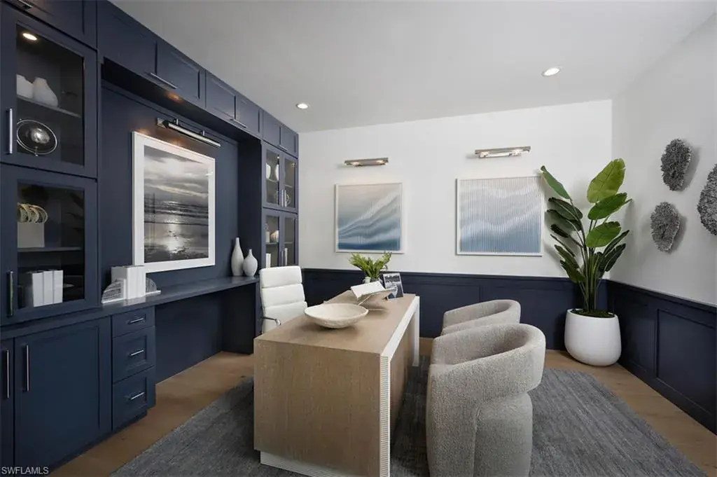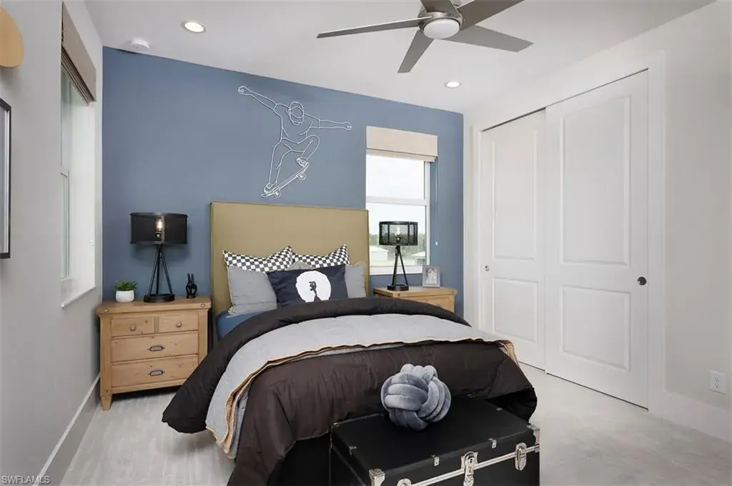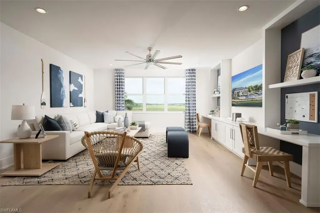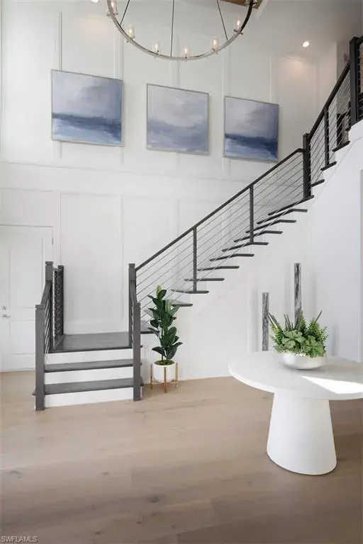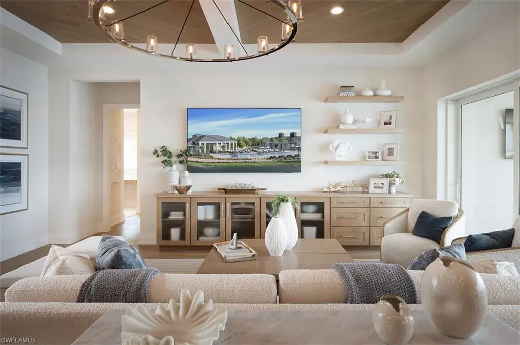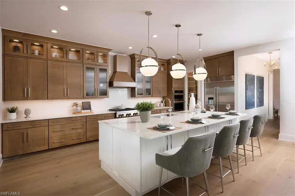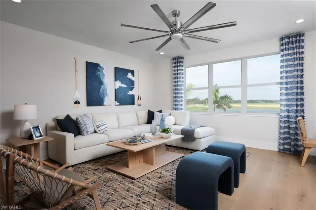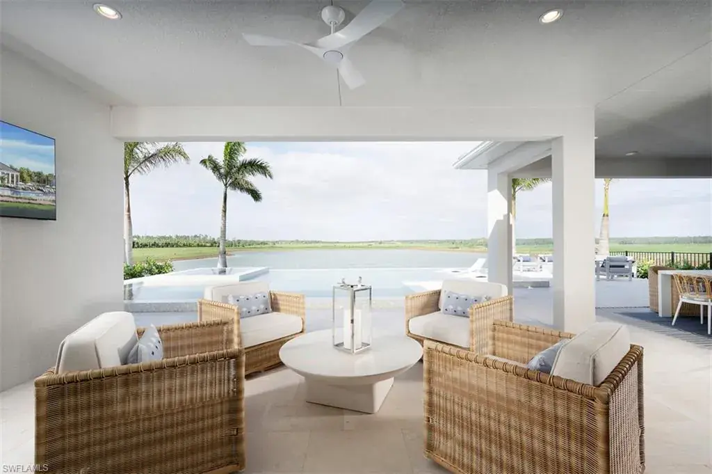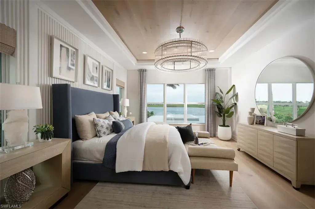 Discover the ultimate in luxury waterfront living with this brand-new, beautifully designed 2-story home in the heart of South Naples! Showcasing over 4,061 square feet of refined living space, this stunning residence captures the essence of Florida elegance and indoor-outdoor harmony. Step outside to your own private oasis featuring a sparkling pool and spa under a screened enclosure, an expansive covered lanai, and a full cabana bathroom — all overlooking serene waterfront views. The oversized backyard and seamless outdoor living design create the perfect setting for entertaining guests, hosting family gatherings, or simply unwinding in your personal paradise surrounded by tropical tranquility. Inside, the open-concept floor plan welcomes you with expansive windows that frame beautiful water views throughout the main living areas, filling the home with light and sophistication. The gourmet kitchen is a showpiece, equipped with premium Jennair appliances, a natural gas cooktop with vented hood, an elegant butler’s pantry, and a large quartz-topped center island ideal for culinary creativity and conversation. Double-stacked wood cabinetry adds drama and functionality to this culinary haven. The primary suite is a true retreat, offering peaceful water views and a spa-inspired bathroom with a luxurious soaking tub, a spacious dual-head walk-in shower, double vanities with quartz countertops, and two expansive walk-in closets. Upstairs, three additional bedrooms each feature their own private en suite baths, while a generous loft provides flexible space perfect for a media room, home office, or relaxation area. Crafted with meticulous attention to detail, this home features impact-resistant windows and doors, the latest building codes, and a builder warranty for your peace of mind. Residents enjoy an exceptional resort-style amenity center complete with a resort pool, clubhouse, fitness center, tennis and pickleball courts, putting green, and a dedicated lifestyle director curating engaging events throughout the year. Perfectly located near Fifth Avenue South, white-sand Gulf beaches, and the vibrant dining and nightlife of Marco Island, this extraordinary South Naples residence offers the perfect blend of luxury, comfort, and timeless waterfront living — a true masterpiece designed to impress and inspire. Talk to onsite sales consultant about special rate buydown program! Please see MLS Supplements for floor plan layout. Lot 189.