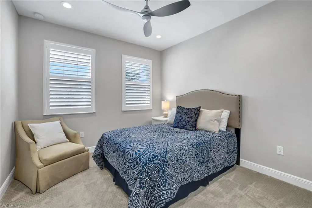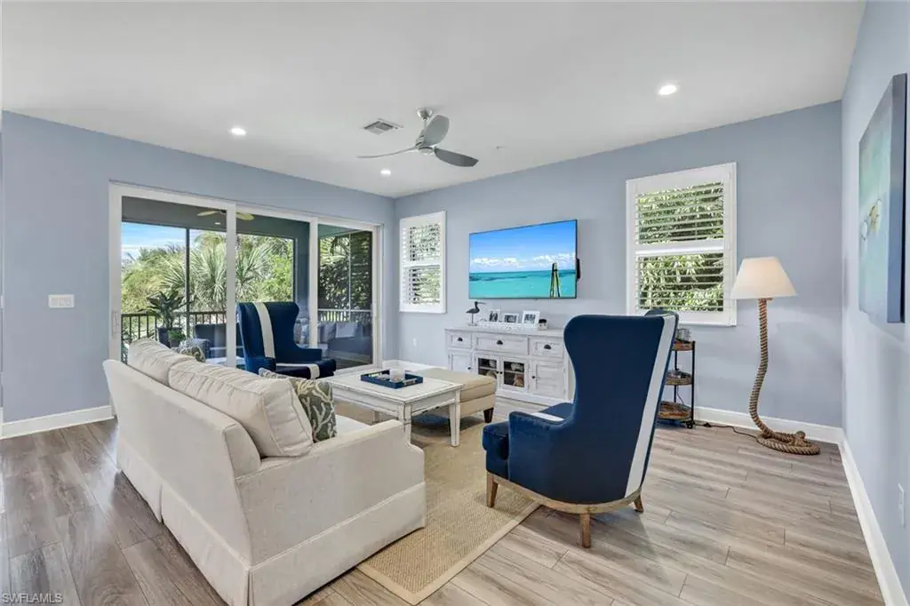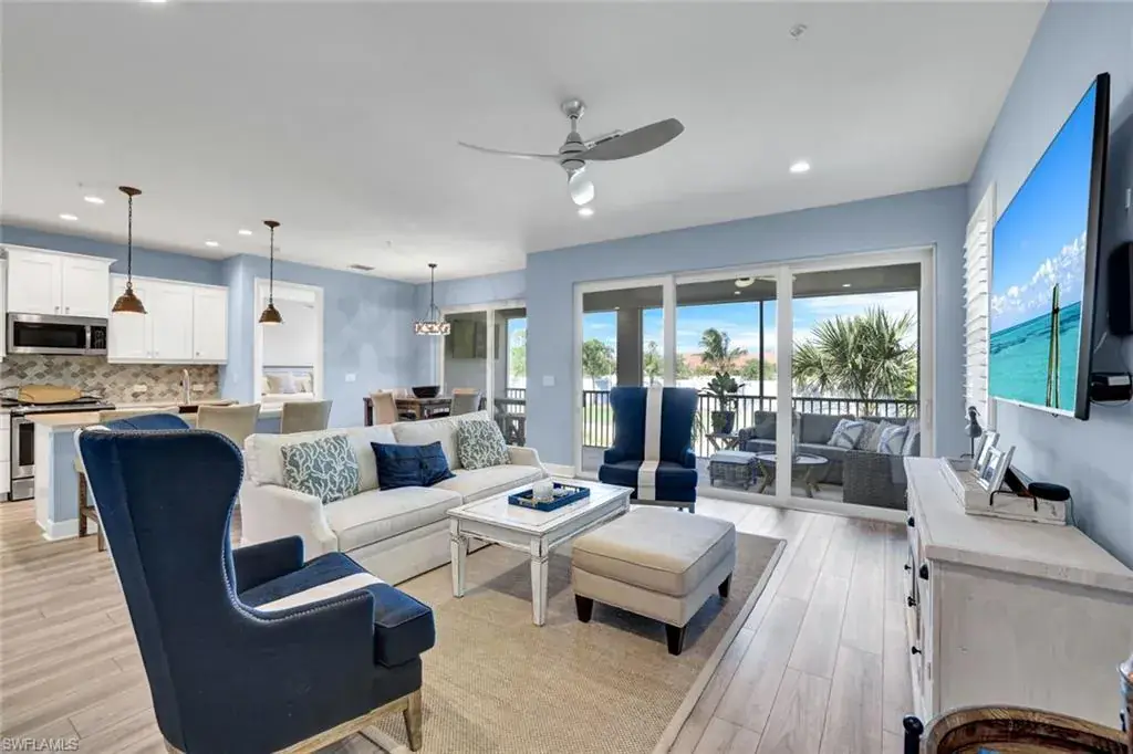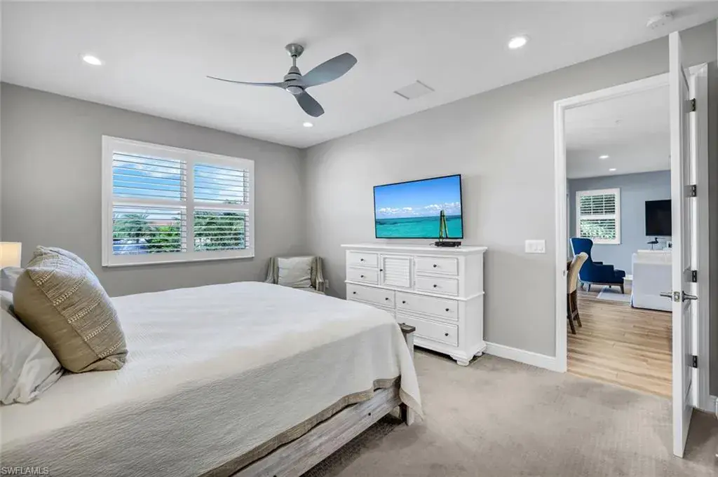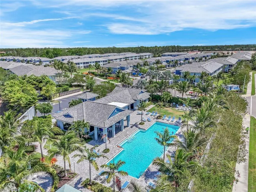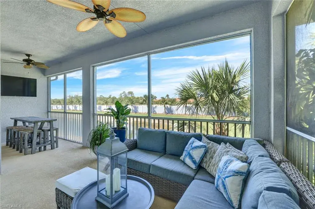 WOW! PRICED TO SELL! Lakeview and Western Exposure for Naples Sunsets! Seychelles built by Neal Communities is a luxury British West Indies architecture.  NEGOTIABLE ON FURNISHING! 2nd story carriage home located 5 minutes to downtown Naples/5th Avenue and the white sandy beaches of the Gulf. This light and airy open-concept Windemere floor plan unit is located in private cul-de-sac featuring 2 large bedrooms + Den (furnished) 2 full bathrooms and 1 car garage with long driveway for guests. Loaded with luxury upgrades, plantation shutters, including porcelain stone look flooring, chef’s eat-in kitchen, dining room, white cabinets with soft close cabinetry, under mount lighting, designer backsplash, contemporary white quartz countertops, LG stainless refrigerator, appliances, and a center island. The spacious master bedroom and spa-like walk-in shower bath is elegantly appointed with double vanity, and has an oversized walk-in-closet  One of the most desirable features of this home is the lanai with TV overlooking the beautiful lake and washer dryer.  Seychelles features amenities that included an oversized resort style heated pool and spa, fitness center featuring impact floors, Matrix equipment and free weights, fire pit, outdoor gas grill and clubhouse for social gatherings!  Convenient location to downtown Naples, I-75 and airports.
