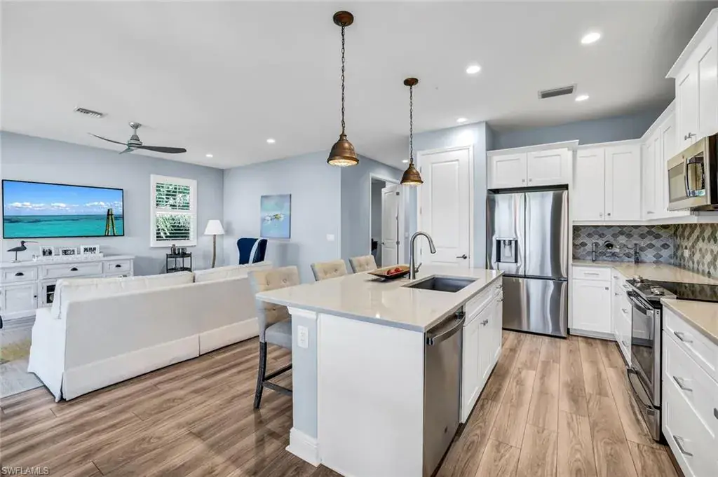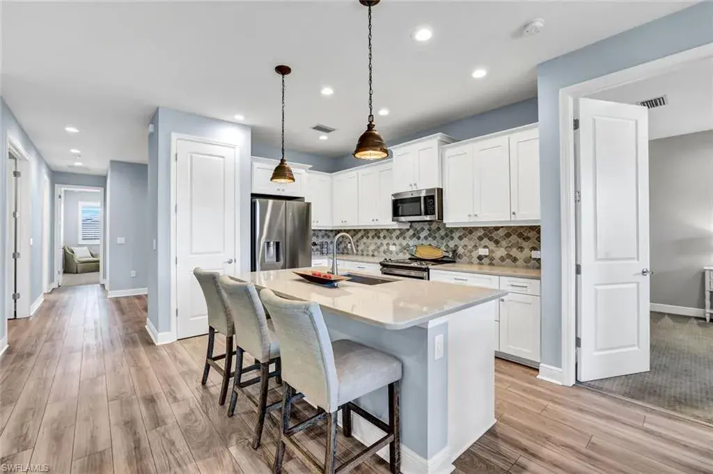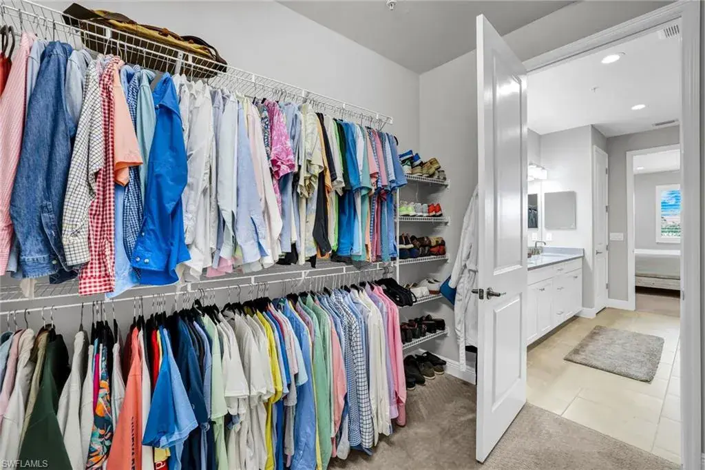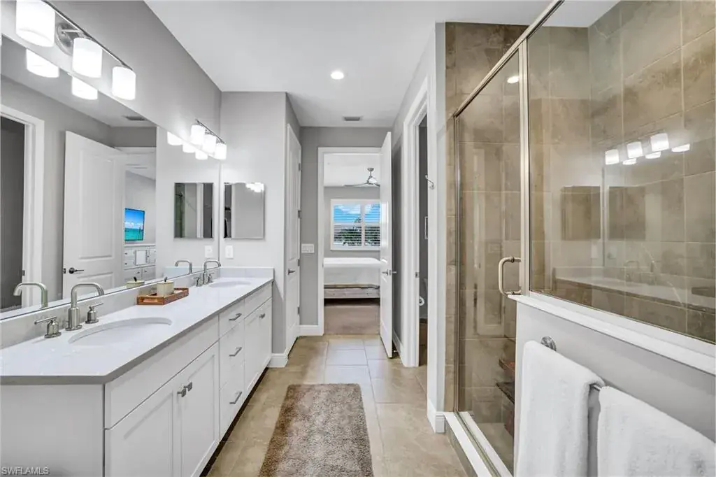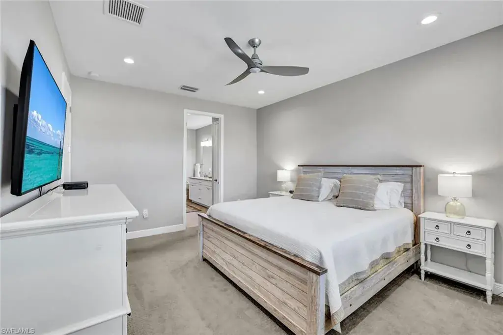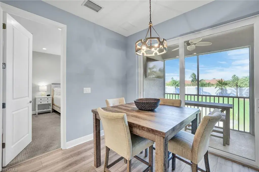 WOW! PRICED TO SELL! Lakeview and Western Exposure for Naples Sunsets! Seychelles built by Neal Communities is a luxury British West Indies architecture.  NEGOTIABLE ON FURNISHING! 2nd story carriage home located 5 minutes to downtown Naples/5th Avenue and the white sandy beaches of the Gulf. This light and airy open-concept Windemere floor plan unit is located in private cul-de-sac featuring 2 large bedrooms + Den (furnished) 2 full bathrooms and 1 car garage with long driveway for guests. Loaded with luxury upgrades, plantation shutters, including porcelain stone look flooring, chef’s eat-in kitchen, dining room, white cabinets with soft close cabinetry, under mount lighting, designer backsplash, contemporary white quartz countertops, LG stainless refrigerator, appliances, and a center island. The spacious master bedroom and spa-like walk-in shower bath is elegantly appointed with double vanity, and has an oversized walk-in-closet  One of the most desirable features of this home is the lanai with TV overlooking the beautiful lake and washer dryer.  Seychelles features amenities that included an oversized resort style heated pool and spa, fitness center featuring impact floors, Matrix equipment and free weights, fire pit, outdoor gas grill and clubhouse for social gatherings!  Convenient location to downtown Naples, I-75 and airports.