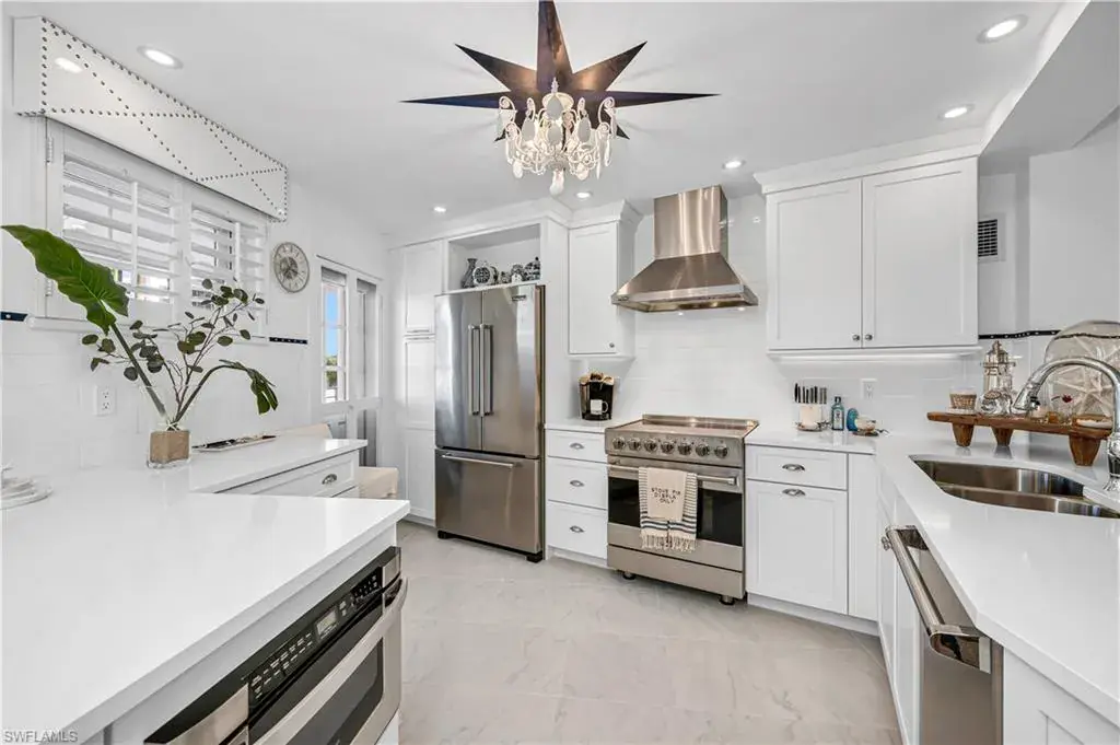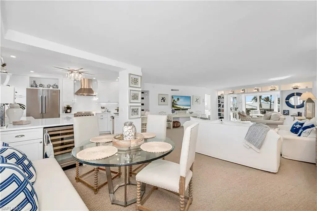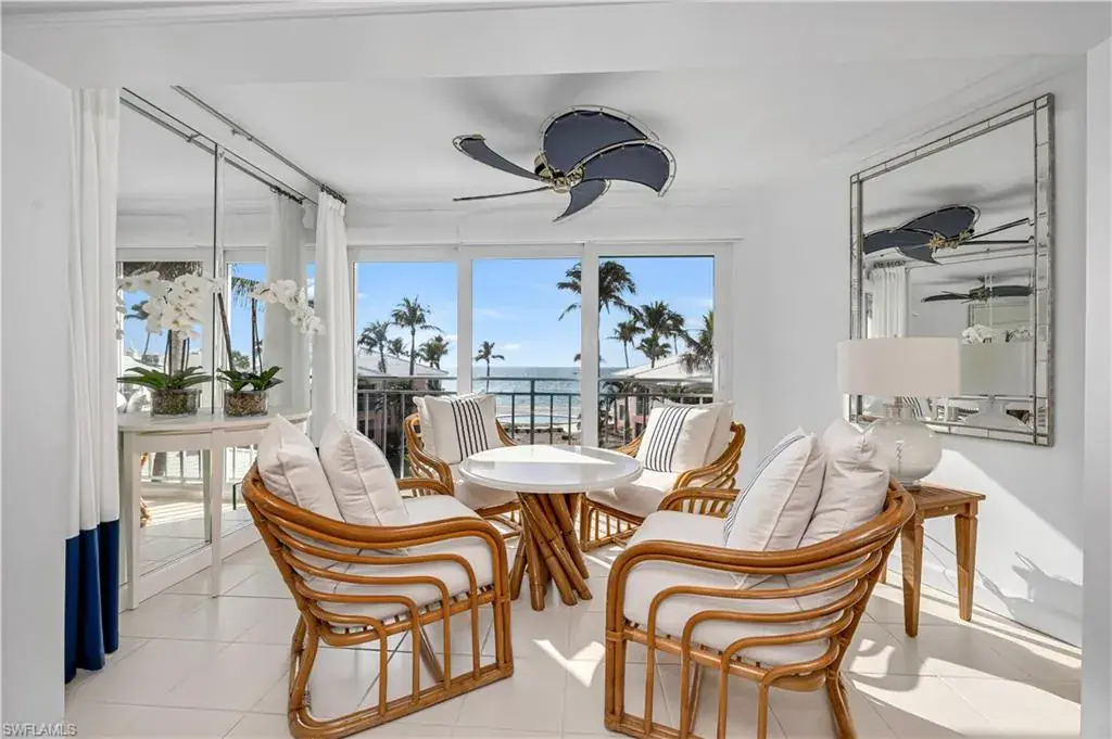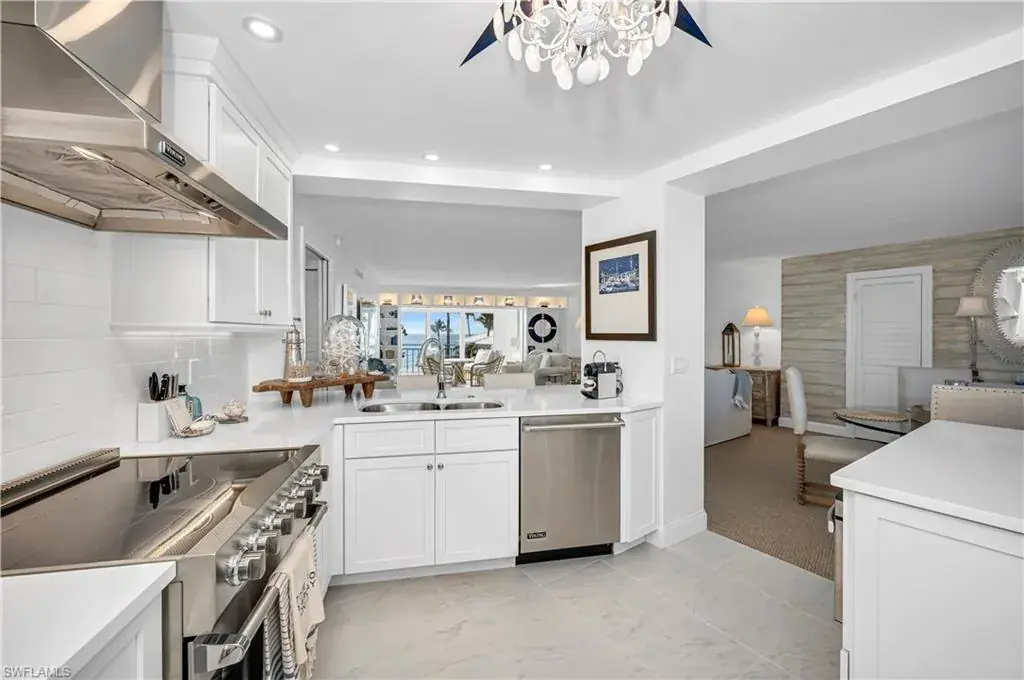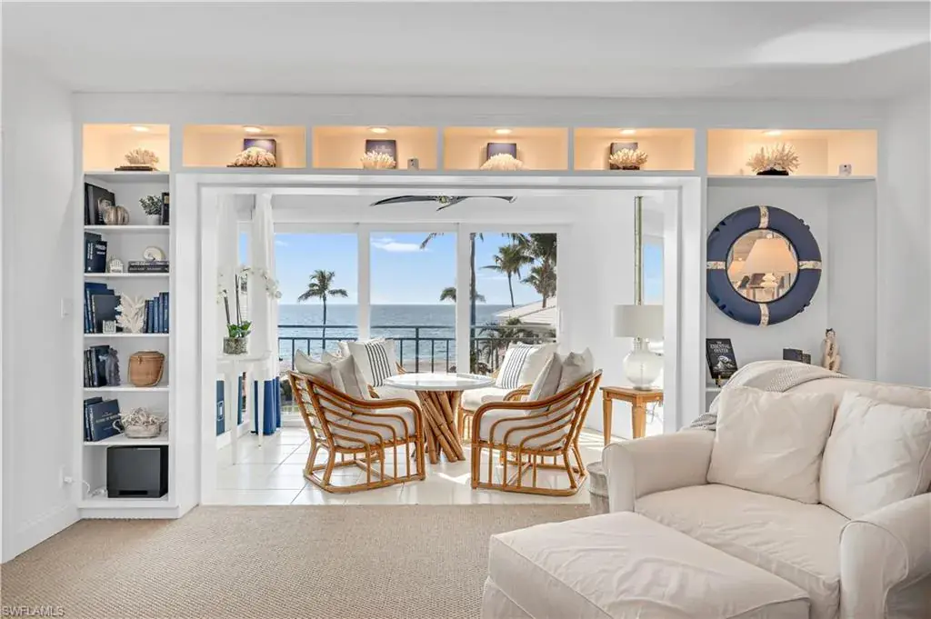 This luxurious condo offers courtyard views of The Gulf and features 2 bedrooms, 2 bathrooms, and 1518 sq/ft under air. Located on the 3rd floor this unit boasts a gourmet kitchen with Quartz countertops and Viking appliances, opened up to showcase Gulf views. A wine refrigerator is conveniently located near the dining room. The living area is adorned with sisal flooring, while the baths are tiled. The remarkable built-in bookcases with lighting adds a touch of class. The master bedroom enjoys glorious Gulf views, and the master bath is well-appointed with dual sinks and large walk-in shower. Guest bedroom includes California Closet built-in cabinets with plenty of storage. New AC has been recently installed. Additionally, the open-air front balcony is a delightful benefit adding to the total square footage. The Shores #33 has a pleasant, well put-together-feel, and the furnishings are included with the sale. Located on the quietest and perhaps the most beautiful stretch of Gulf Shore Blvd, less than 2 miles from the great restaurants and shops of Venetian Village. On a quiet and almost private part of the Gulf beach, less than 100 yards from Doctors Pass that provides easy access to peaceful kayaking and paddle boarding.