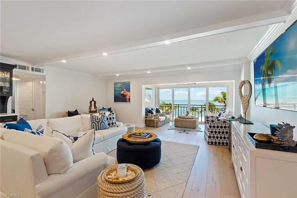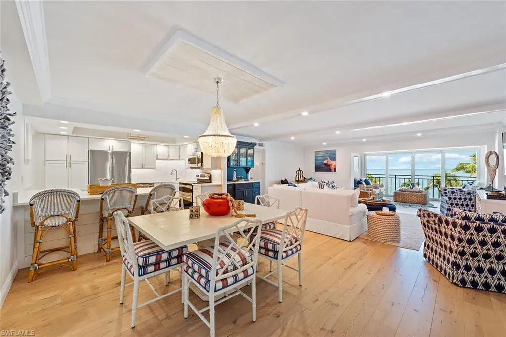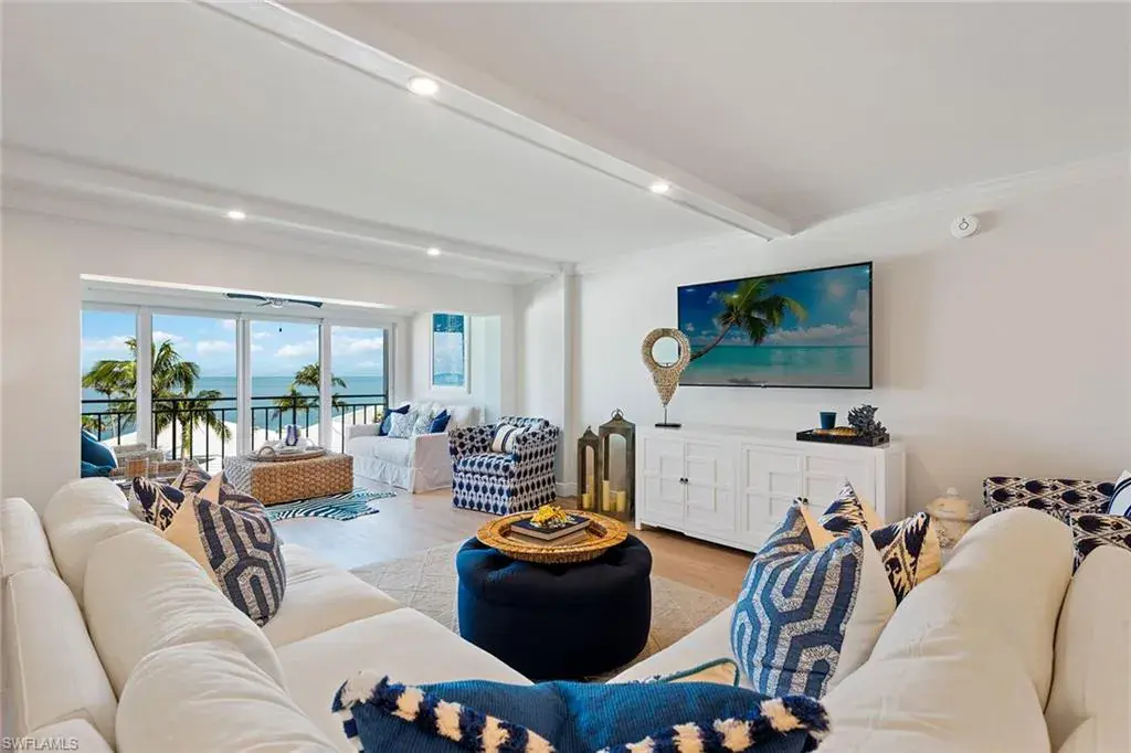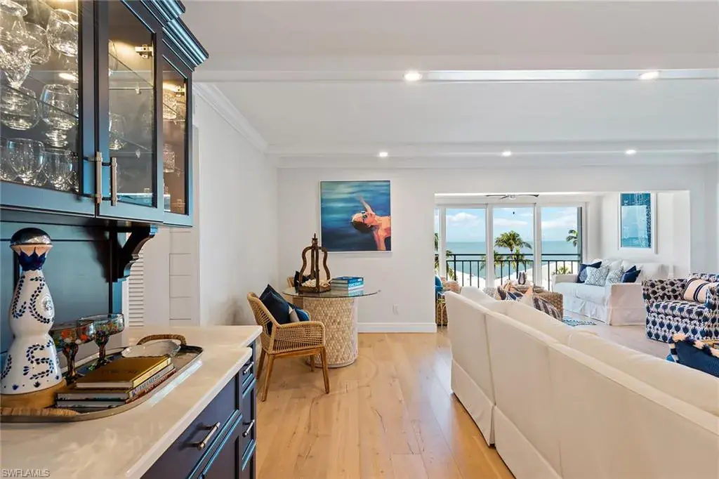 Walk into this newly renovated fifth-floor beachfront getaway with stunning gulf views from every room! This tastefully updated end unit features impact windows and sliders, wide-plank oak flooring, recessed lighting and extra decorative details such as shiplap walls and plantation shutters. The open kitchen boasts stainless steel GE Profile appliances, an added bar with wine cooler, beautiful countertops and tile backsplash. Enjoy an evening cocktail with amazing sunsets from the comfort of your own home or put your feet in the white sand just near your front door. Owners enjoy carport parking, on-site manager’s office, secure entry and a peaceful beachfront community pool. For maximum comfort and privacy, leasing and pets are not allowed. On the beach, the Shores at Naples is a beautiful community just north of Doctors Pass on Gulf Shore Boulevard. With easy access to the renowned dining and shopping at Venetian Village and 5th Avenue, plus optional memberships to the Moorings Beach Park or the Moorings Golf & Country Club, you have everything you need for the Naples lifestyle.
