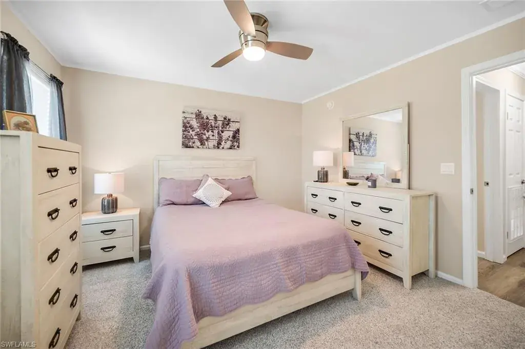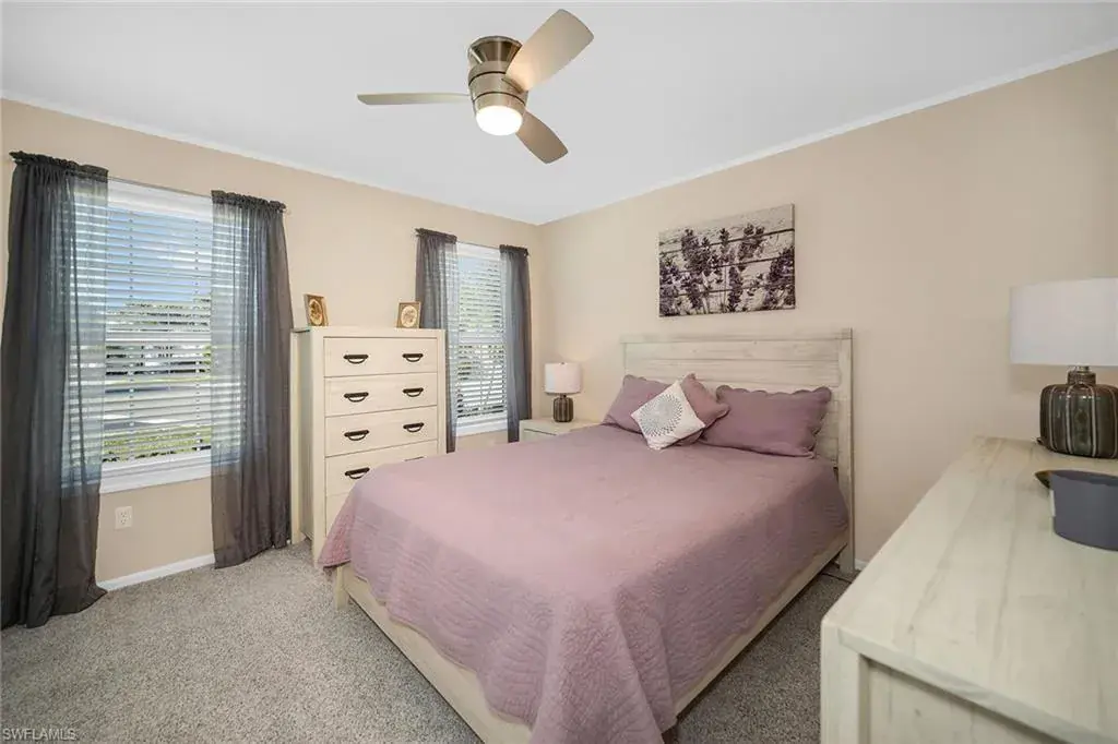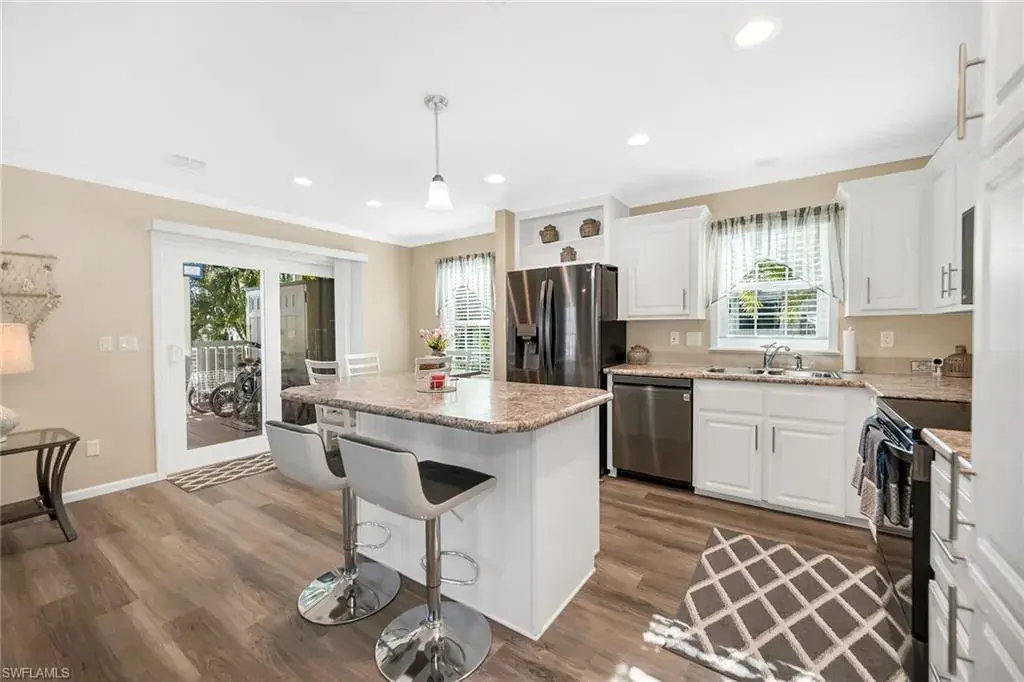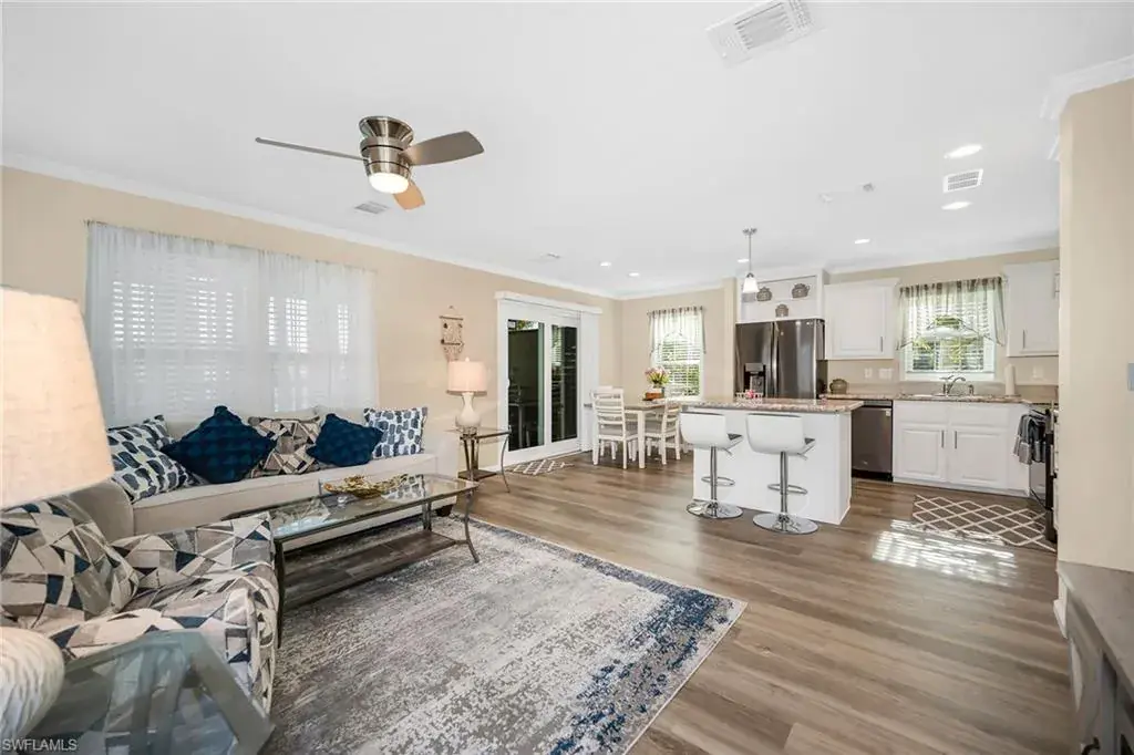 Built in 2022 and offered furnished, this inviting waterfront residence in Silver Lakes blends modern construction with relaxed Florida living in a peaceful setting. Overlooking tranquil water views, the home features a spacious screened porch and an adjoining deck that together provide the backdrop for morning coffee, evening sunsets or easy outdoor entertaining. Impact-resistant windows and a newer Goodman HVAC (2020) with a 2022 condenser ensure comfort and peace of mind, while the home’s fresh, thoughtfully selected finishes make it feel move-in ready. Inside, the floor plan includes two bedrooms and two baths, enhanced by laminate flooring and ceiling fans throughout to maintain a light and breezy ambiance. The kitchen is beautifully designed with crown molding, recessed lighting, white cabinetry and newer LG stainless steel appliances, including a refrigerator, cooktop and dishwasher (all 2022), and a convenient two-seater island. In the living room, glass sliders open to the screened porch, creating a seamless indoor-outdoor flow that maximizes the home’s waterfront setting. The living room continues the cohesive design with crown molding and a comfortable layout ideal for everyday living or hosting guests. The primary bedroom offers a peaceful retreat with a walk-in closet, while the en-suite bath features white cabinetry and a walk-in shower with a glass slider. The guest bedroom is bright and inviting, paired with a nearby guest bath complete with matching white cabinetry and its own walk-in shower with a glass slider. A dedicated laundry room adds valuable convenience with a full-size LG washer and dryer (2022), as well as overhead cabinetry for additional storage. Residents enjoy a wealth of community amenities, including a pristine golf course, two clubhouses, heated swimming pools, hot tubs, an all-weather tennis court, pickleball courts, six shuffleboard courts, bocce ball, six regulation horseshoe pits and a well-equipped exercise facility. With modern features, waterfront tranquility and resort-style amenities, this home offers an exceptional opportunity to enjoy the best of Naples living.