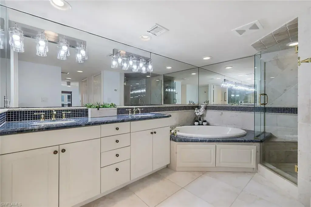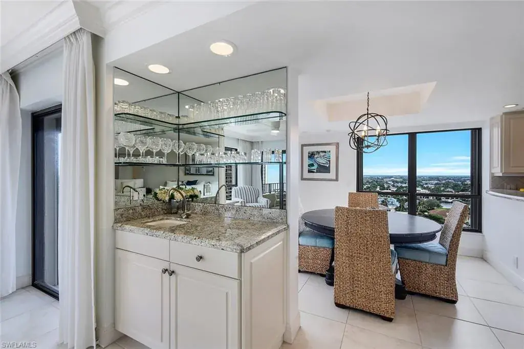 Two private balconies showcase stunning panoramas: on one side, the sparkling Gulf of Mexico and Naples’ legendary sunsets; on the other, the shimmering waters of Venetian Bay and the Park Shore skyline.