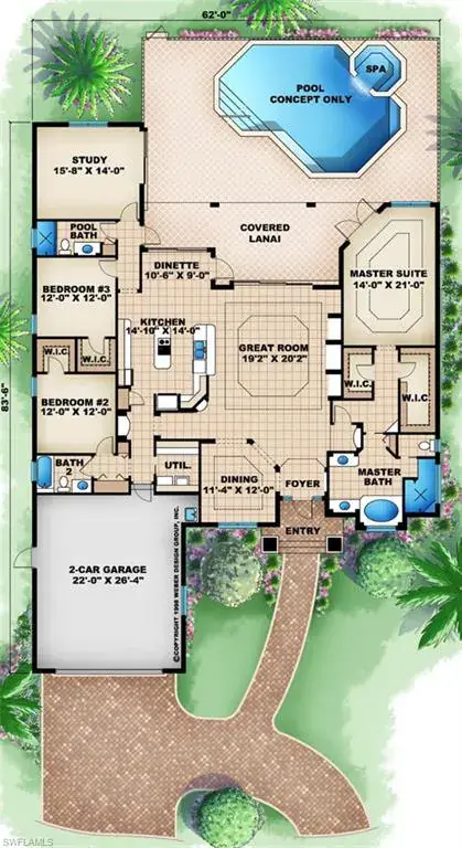 The master suite features French doors to the lanai and pool, dual walk-in closets, and a spa-style bath with soaking tub, walk-in shower, and dual vanities. Two additional bedrooms and a versatile study/playroom complete the layout.