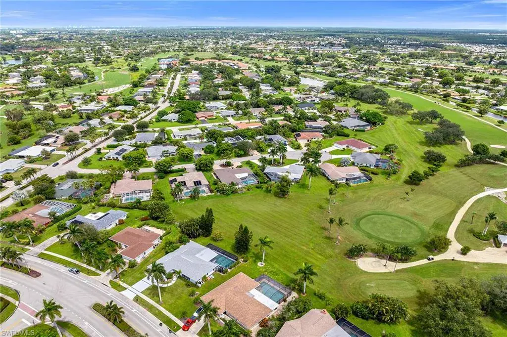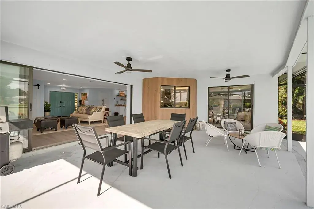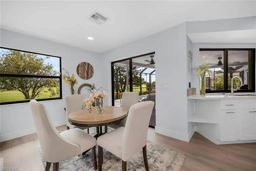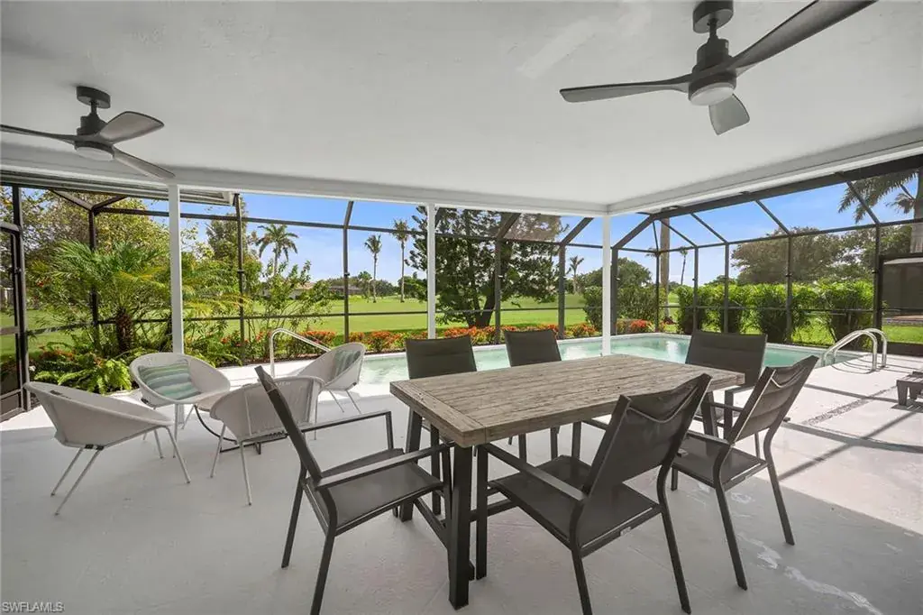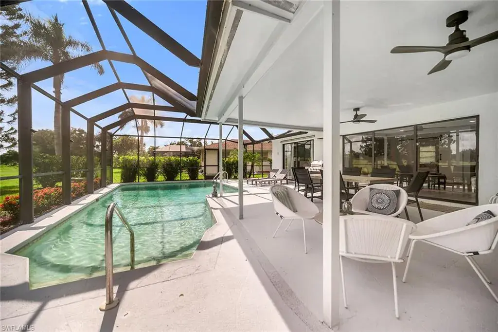 Completely renovated and offered turnkey, this four-bedroom, two-bath home enjoys peaceful views of Hibiscus Golf Course and a lifestyle of comfort and convenience. Recent updates include a brand-new roof and freshly painted lanai deck, making this residence move-in ready or ideal as a rental investment. An open and airy floor plan showcases stylish finishes throughout. The living room flows seamlessly to the screened lanai through pocket doors, where tranquil golf course vistas create a perfect backdrop for relaxation or entertaining. The family room features a modern accent wall, while the updated kitchen is a showpiece with quartz countertops, an island, glass tile backsplash, under-cabinet lighting, stainless steel appliances, including a double oven stove with vent hood, and a window overlooking the pool and fairways. The primary suite is a private retreat with an accent wall, recessed LED lighting, fan, window coverings, and a spa-like bath featuring dual sinks, LED backlit mirrors, cabinet closet, frameless glass walk-in shower with tiled walls, and modern finishes. Guest bedrooms are equally inviting, with recessed lighting, ceiling fans, and custom touches such as barn doors. Both baths feature walk-in showers with sleek tile work. Additional highlights include a Nest thermostat, custom lighting, and turnkey furnishings for immediate enjoyment. Outdoors, the newly painted lanai deck offers ample space for lounging and dining while overlooking the golf course. This home combines stylish modern updates with the tranquility of its golf course setting, just minutes from Naples’ beaches, shopping, dining, and attractions.