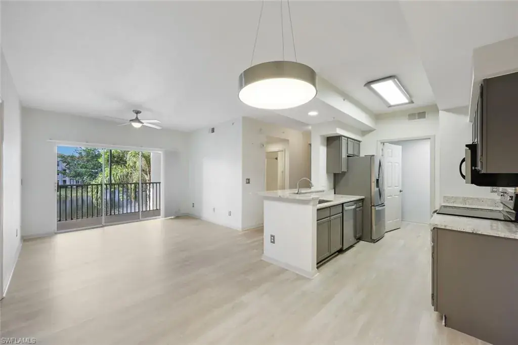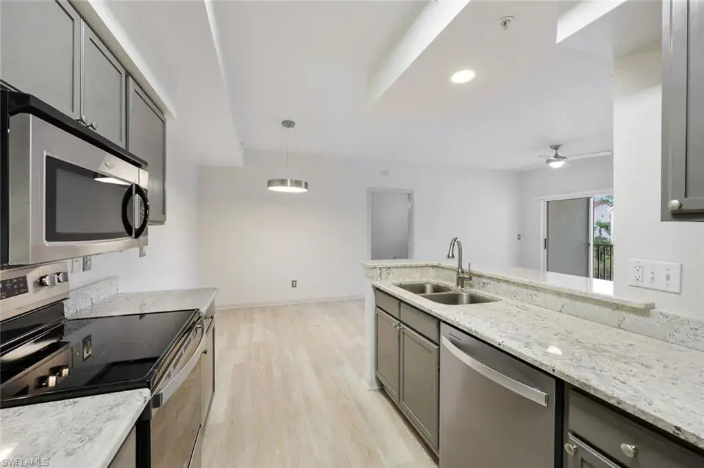 Renovated 2-bed, 2-bath North Naples gem! This unit has been completely updated with new luxury vinyl flooring, stainless steel kitchen appliances, granite countertops, brand new primary bath shower and vanity! This second-floor condo is located in the recently renovated, centrally-located St. Croix at Pelican Marsh complex. The large screened in balcony overlooks an expansive lake and landscaped area. The community amenities include a resort style pool, 24-hour fitness center and clubhouse, and nightly security patrol. The beautiful beaches of the Gulf of Mexico are close by and residents can WALK to Seed to Table! Low fees also make this property a must see for residents and investors! Truly a beauty!