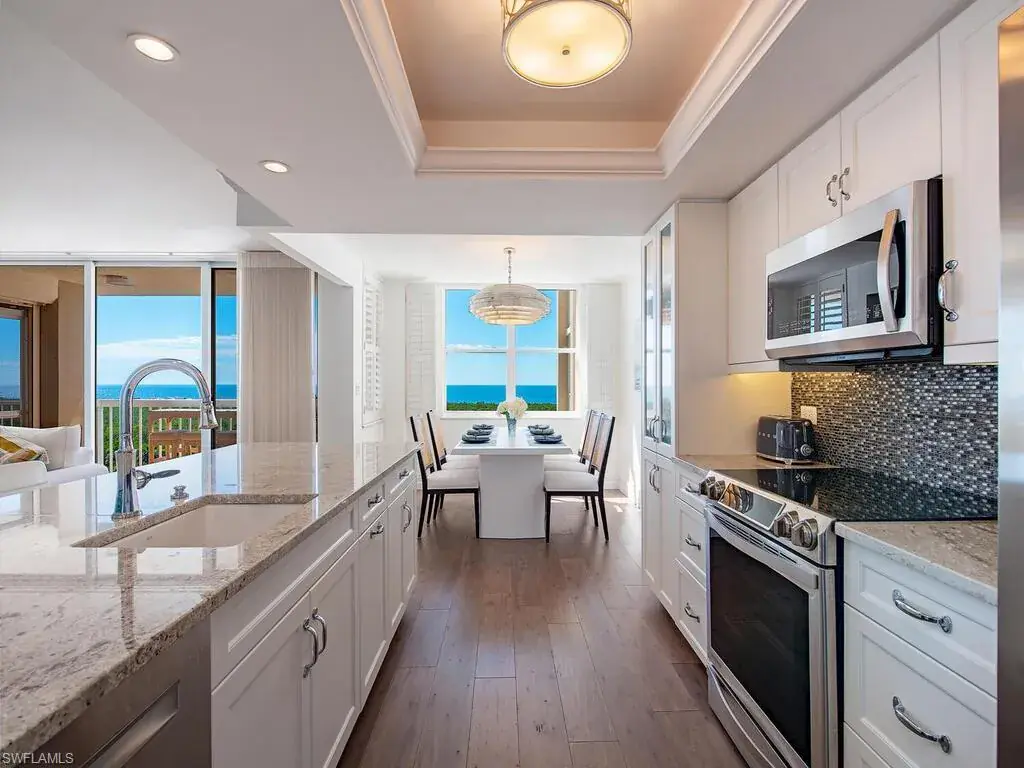 Experience the pinnacle of coastal living in this turnkey furnished sky home at the esteemed St. Kitts at Pelican Bay. This remodeled residence presents a unique opportunity to enjoy the epitome of waterfront living, boasting breathtaking panoramic views of the Gulf and the beautiful preserve from the 11th floor. Inside, a spacious open floor plan connects each room seamlessly. The home features two bedrooms, two bathrooms, and balcony, and has been thoughtfully renovated with an open kitchen featuring granite countertops, a breakfast bar, tiled backsplash, and updated cabinetry. Additional highlights include luxury vinyl plank flooring, custom built-ins, and a luxurious primary suite with dual sinks, a walk-in closet, and a walk-in shower. One covered carport space is included. St. Kitts resides in the heart of Pelican Bay, with easy access to the Marker 36 and Commons tram stations. Residents enjoy two private beach clubs with dining, 18 tennis courts, fitness and community centers, tram service through the preserve, and a world-class pickleball center coming soon. Building amenities include multiple social areas, fitness center, Olympic-size pool and jacuzzi, and BBQ area.