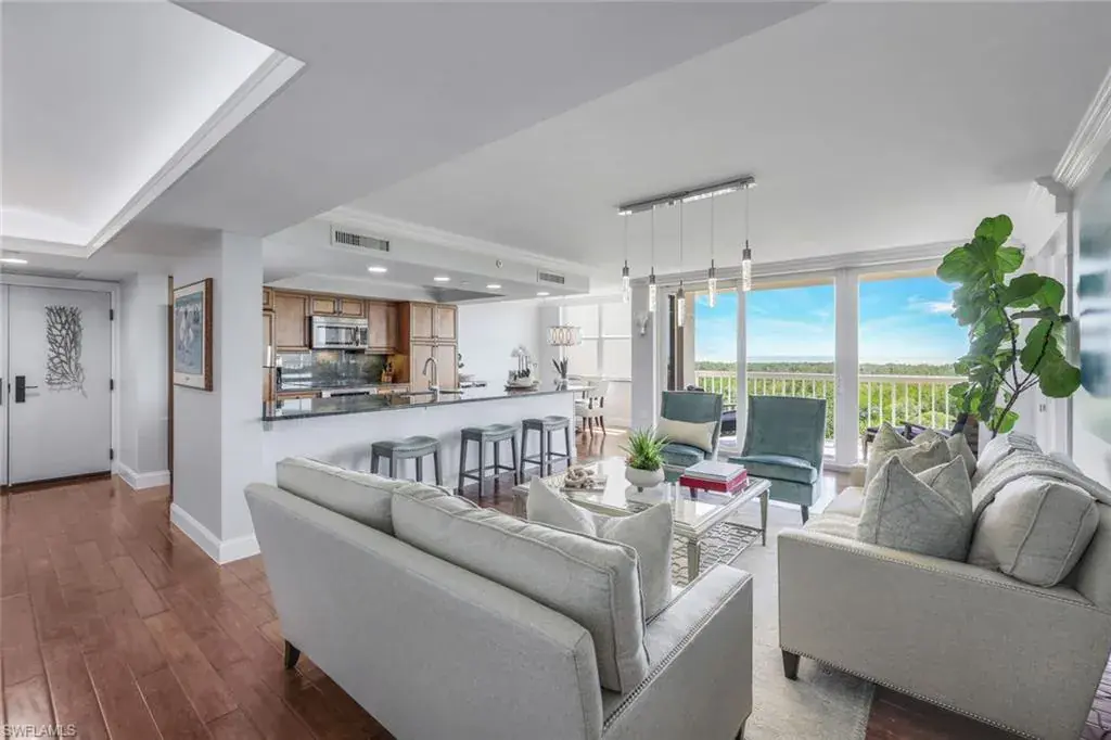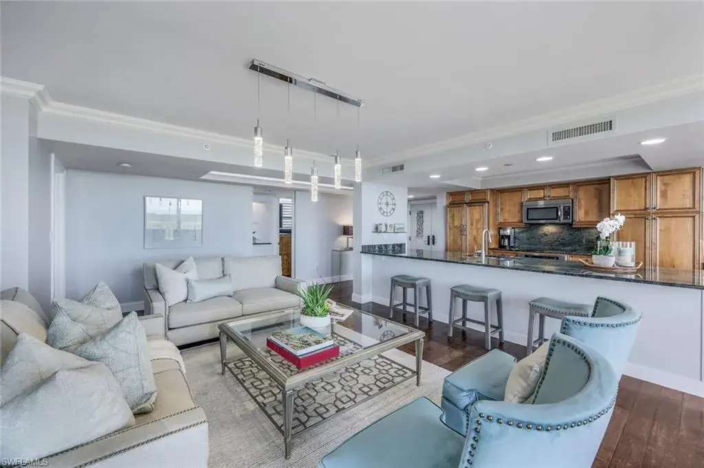 Indulge in the epitome of coastal luxury at 6585 Nicholas Blvd #603, a magnificent residence nestled within the prestigious St.Kitts community at Pelican Bay offering a rare opportunity to experience the ultimate in waterfront living, boasting spectacular sweeping views of the Gulf Of Mexico & the lush preserve from its coveted perch on the 6th floor. From the moment you step inside, your are greeted by an atmosphere of elegance & sophistication with a spacious open floor plan seamlessly flowing from one room to the another. This residence features 2BD, 2BA with an extensive remodel done just a few years ago including impact doors/ windows, enclosed sitting area off master, granite countertops, wood flooring, custom window shades, in-unit washer & dryer & a fabulous master suite with dual sinks, walk-in closet & walk-in shower. The unit also has been recently painted & modern fixtures installed. Enjoy nightly sunsets on your open western facing terrace. Furnishings are Negotiable. Storage Room located right outside of unit. 1 covered carport space included. St Kitts is located in the heart of Pelican Bay conveniently located to both the Marker 36 & Commons tram stations, owners enjoy access to two beach clubs along 3 miles of pristine white sand beach with chair & umbrella service, restaurants, 18 tennis courts, community center and tram service through the preserve. Tucked in the gated enclave of Crown Colony, the St. Kitts building offers a gorgeous redesigned lobby and elevators, updated fitness room, two guest suites, billiard room, social room and pool, as well as, a full-time onsite manager. St. Kitts pet policy allows for two pets at 25 pounds or less, a rare find! Claim your slice in paradise today!