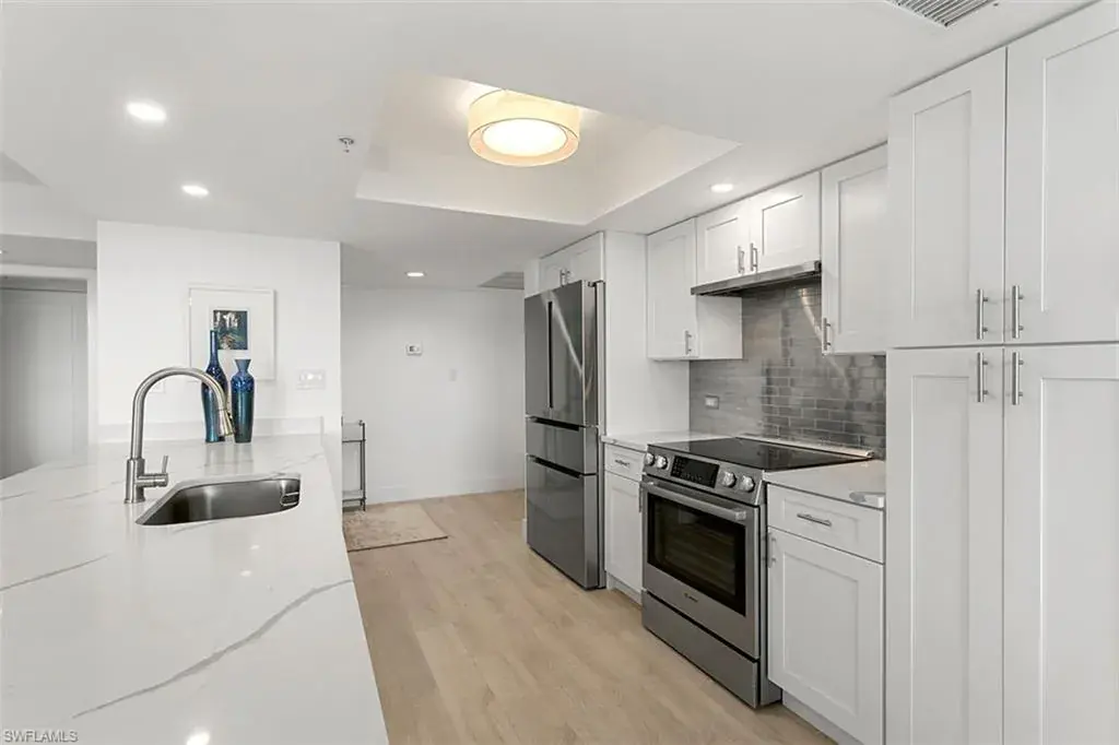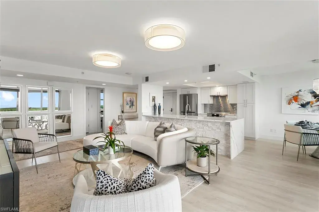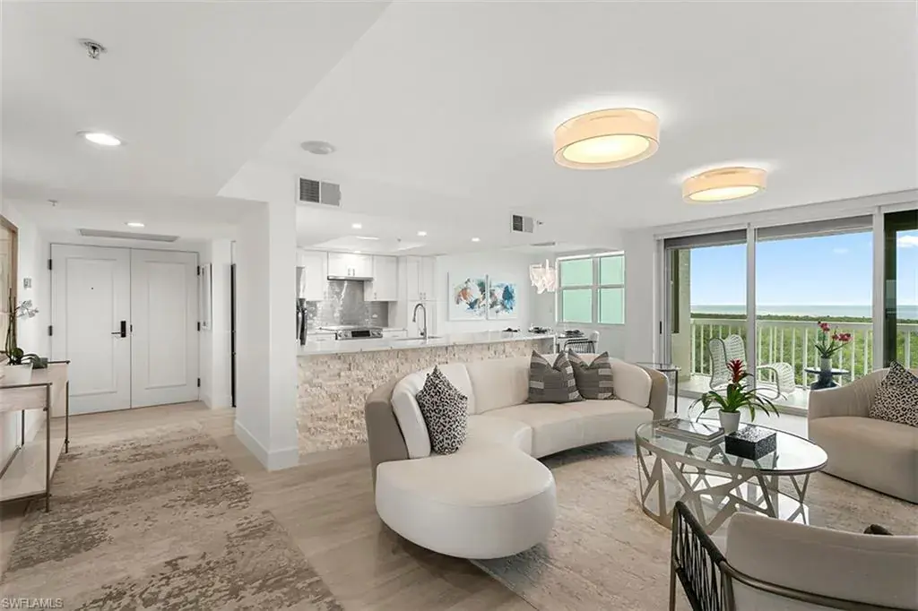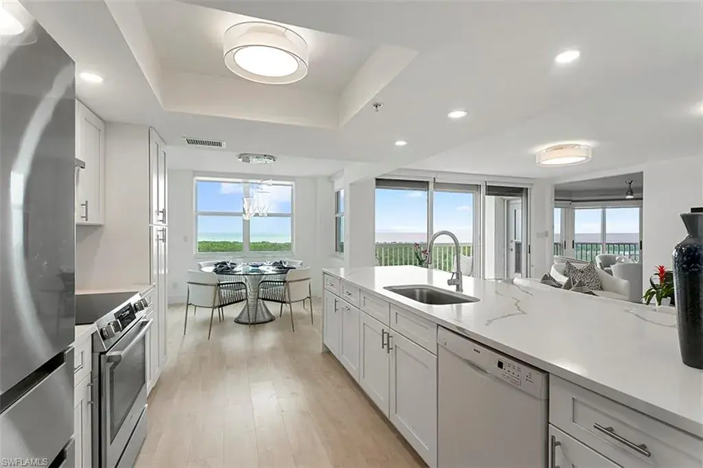 Meticulously remodeled 9th-floor high-rise Condo in St Marissa offers an exceptional, turnkey-furnished living experience with stunning 180-degree Gulf views. Featuring a luxury furniture and decor package from Clive Daniel, this residence exudes elegance and refinement, catering to the most discerning buyers. The open and luminous floor plan is perfect for entertaining, showcasing whitewash oak laminate & tile flooring, an expanded living area, modernized kitchen and bathrooms with custom cabinetry, new plumbing, new lighting, quartz countertops and Bosch appliances. Cutting-edge features such as fiber optics ensure seamless connectivity, while comprehensive hurricane protection guarantees safety. This condo harmoniously blends aesthetics, functionality, and security, presenting an exclusive opportunity for a luxurious lifestyle in the highly coveted Pelican Bay. St. Marissa offers 24/7 security, guard gate, on-site management, fitness room, pool, spa, grilling area, lounge and 2 guest suites. Pelican Bay residents enjoy access to walking paths, beachfront restaurants. fitness center, wellness studio, tennis club, community center and much more. Visit the virtual video attached.