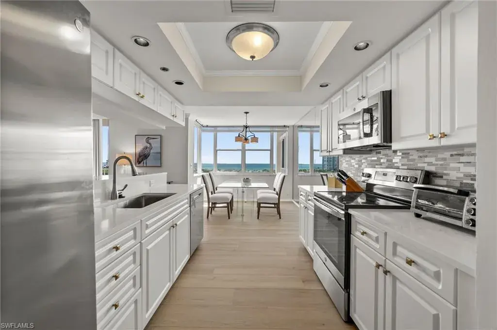 This light-filled 3-bedroom, 2-bath condominium offers an open floor plan designed to maximize natural light and water views from every main living area. The newly updated kitchen boasts recently refaced cabinets, new quartz countertops, appliances, and contemporary hardware. Both bathrooms have been thoughtfully upgraded to match, featuring refaced cabinetry, quartz counters, and stylish finishes. New luxury vinyl plank flooring runs seamlessly throughout the home. The generously sized master bedroom features his and hers walk-in closets and a meticulously updated en suite master bath with a dual vanity and walk-in shower.