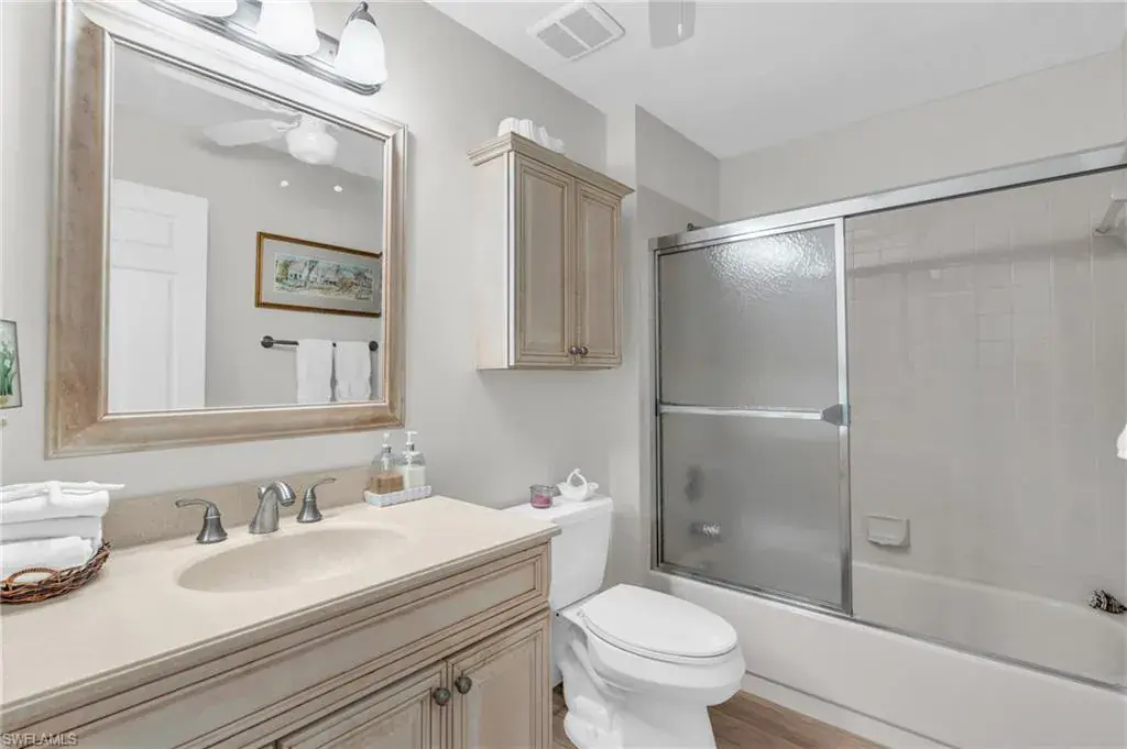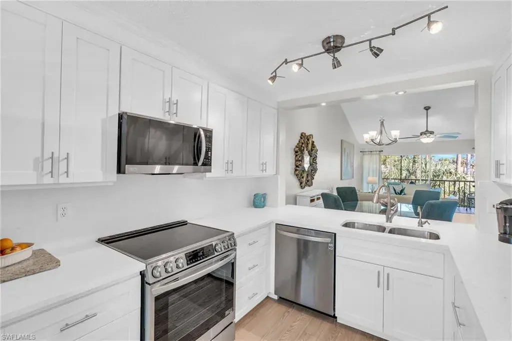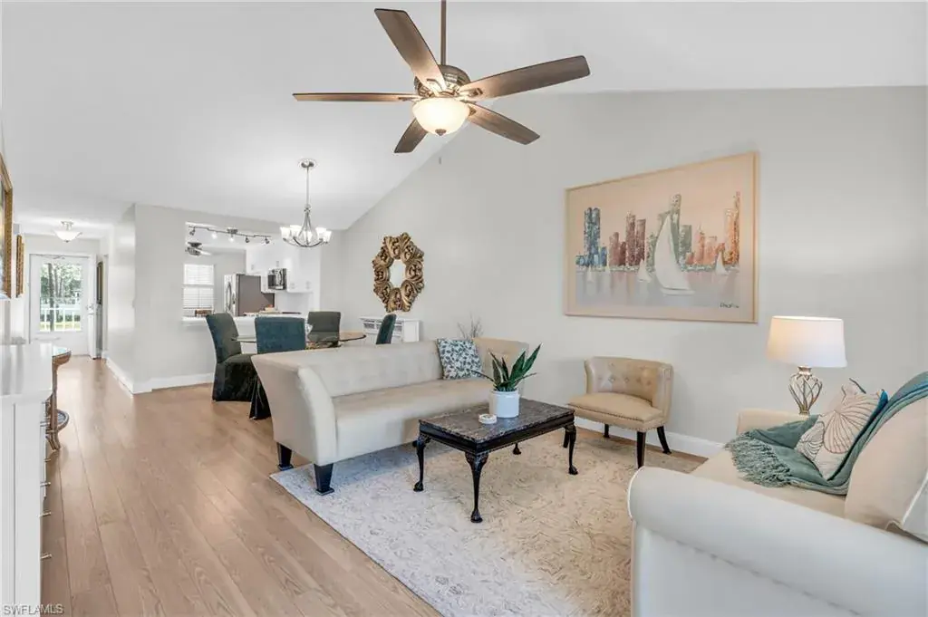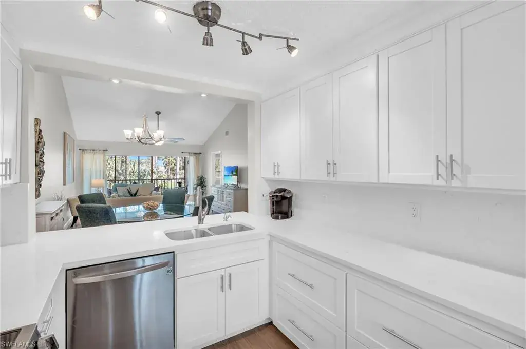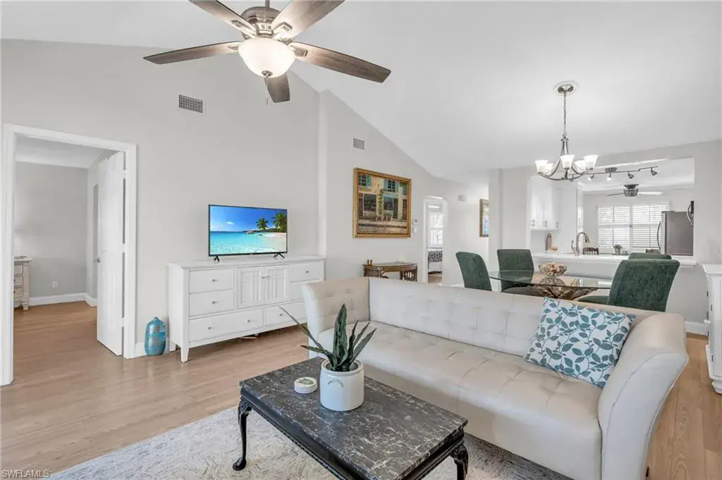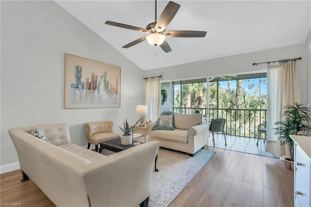 Welcome to this beautifully appointed 2-bedroom, 2-bath, 2nd floor condo. On the top level of a 2-story complex. Located in the desirable Lely Golf Estates Community. The spacious layout features cathedral ceilings, creating an open and airy ambiance filled with natural light. The kitchen has been beautifully updated with modern touches such as quartz and shaker style cabinetry providing both style and functionality. Flooring has been renovated w/warm grey neutral tones in low maintenance type material. The laundry area is spacious enough for extra storage and in-unit full size washer and dryer allowing for everyday convenience. Step out into the screened porch which overlooks a pond, lush landscaping and golf course. Condo is situated in a prime Naples location, offering easy access to everything the area has to offer. You’re just minutes from I-75, the US Open Pickleball Center, downtown 5th Avenue, and Naples magnificent beaches. Enjoy the vibrant downtown