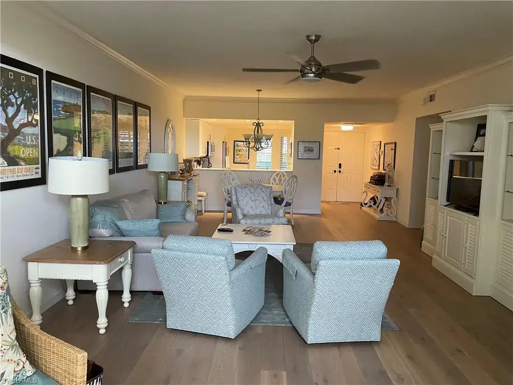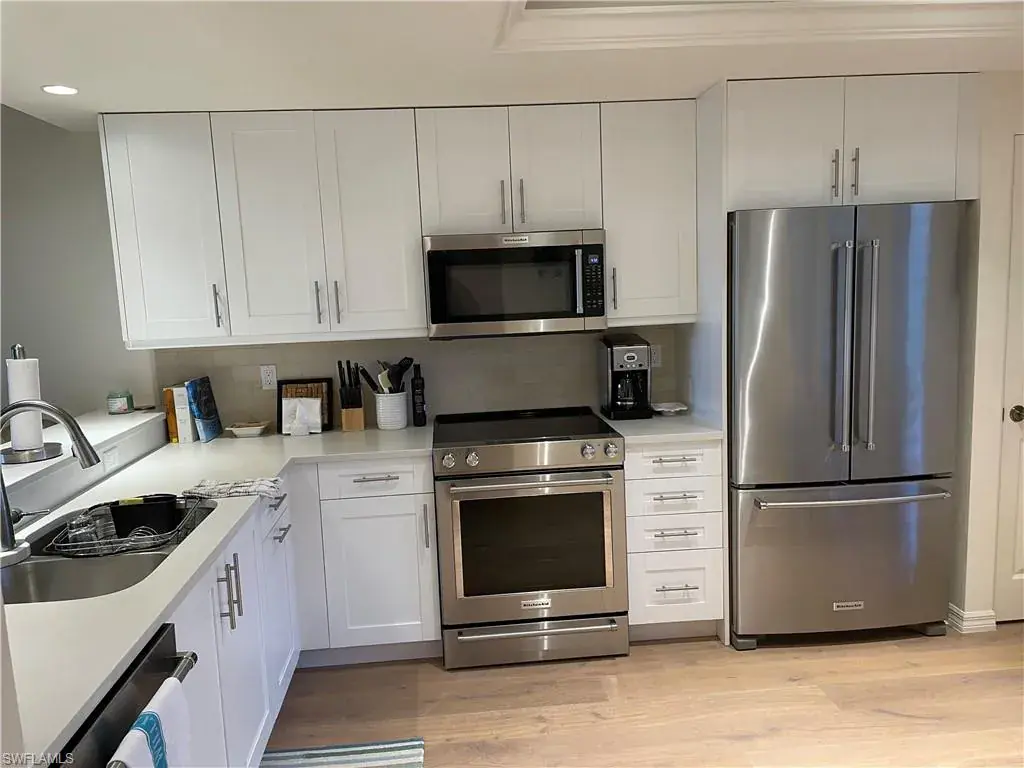 BACK ON THE MARKET!! Enjoy tropical sunsets behind a sparkling fountain will be your view from this first-floor, tastefully improved home. The remodeled kitchen delivers all the current desired trends, from upgraded stainless steel appliances and quartz countertops to white shaker cabinets. Plantation shutters, remodeled baths, many new furnishings and the smoked hardwood floors imported from France are instantly noticed when entering this gated, pet-friendly home. From the cute front sitting porch, you enter the front door, which has new retractable screens. The outside storage room is plenty large to house your bicycles and beach toys. This condominium is conveniently located close to the barbecue grill, covered parking, swimming pool and the Pelican Bay tram station, which will take you to either of the two beach clubs.