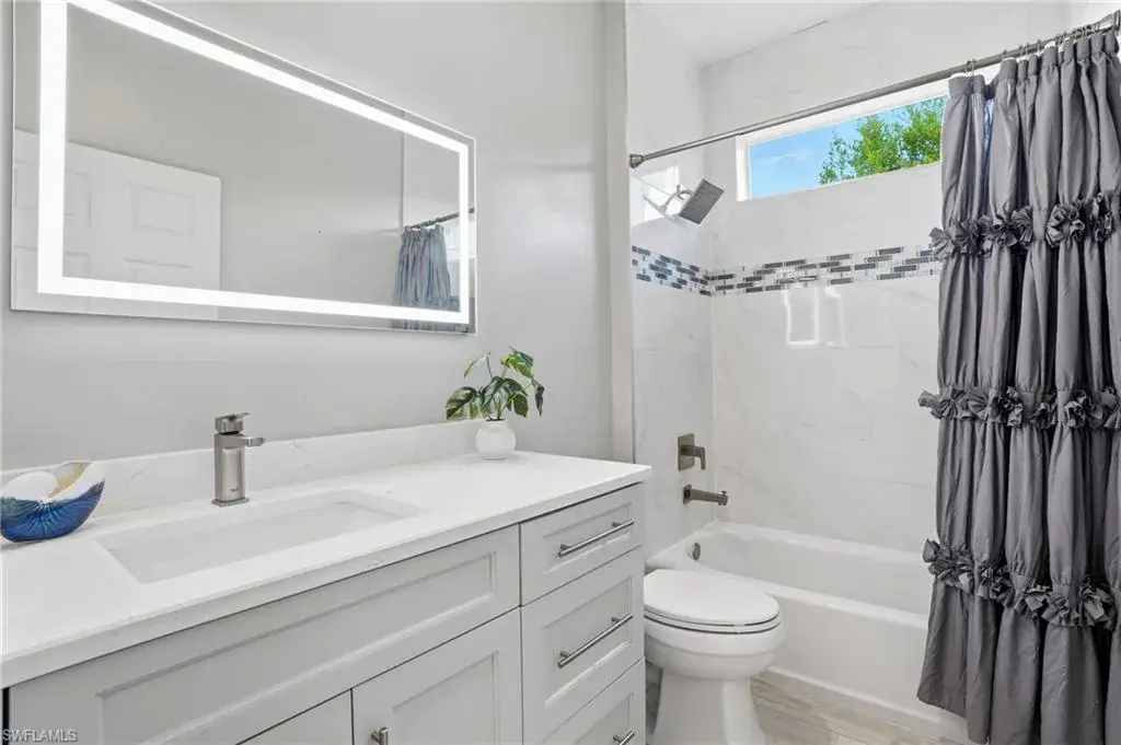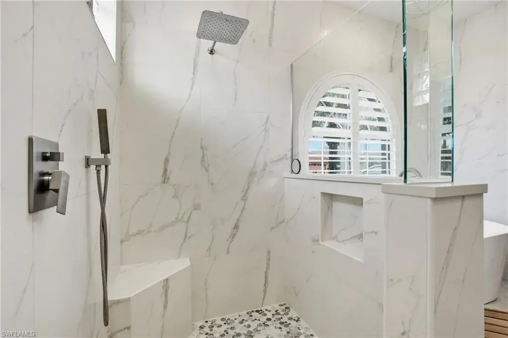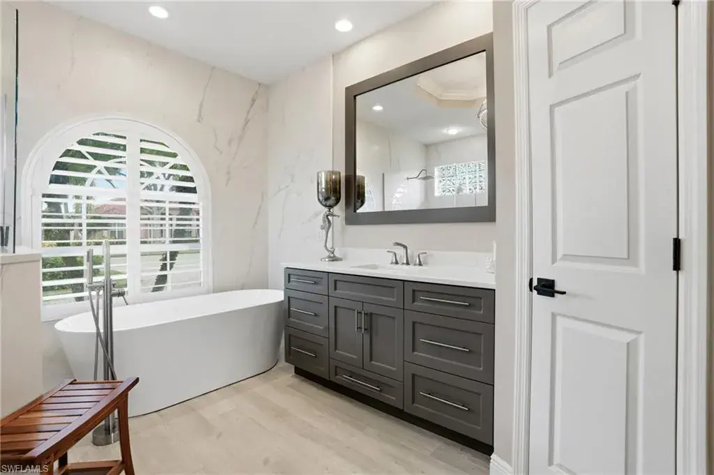 The primary suite offers serene lake views and includes a private office overlooking the water (not pictured), motorized shades, dual vanities, a soaking tub, and a beautifully remodeled walk-in shower. Two additional bedrooms, each adjacent to an updated bath, provide comfort and privacy for family or guests. A versatile office or flex room with built-in cabinetry enhances the home’s livability.