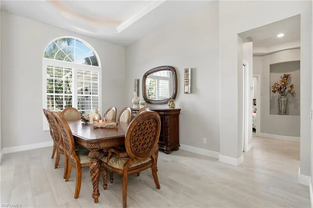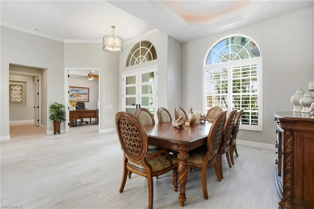 An inviting foyer opens to a sun-drenched great room finished with Italian porcelain tile, crown molding, and custom plantation shutters. The open-concept design flows naturally to the screened lanai, where a fully resurfaced pool and spa (2024) overlook the tranquil lake. The home’s thoughtful layout connects a formal living room and dining area with the kitchen—complete with a spacious breakfast bar and casual dining nook—leading into a second sitting room. Nearly every space frames views of the lanai, pool, and lake, creating a seamless connection between indoor and outdoor living—perfect for both relaxation and entertaining.