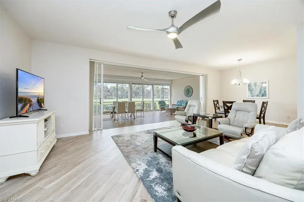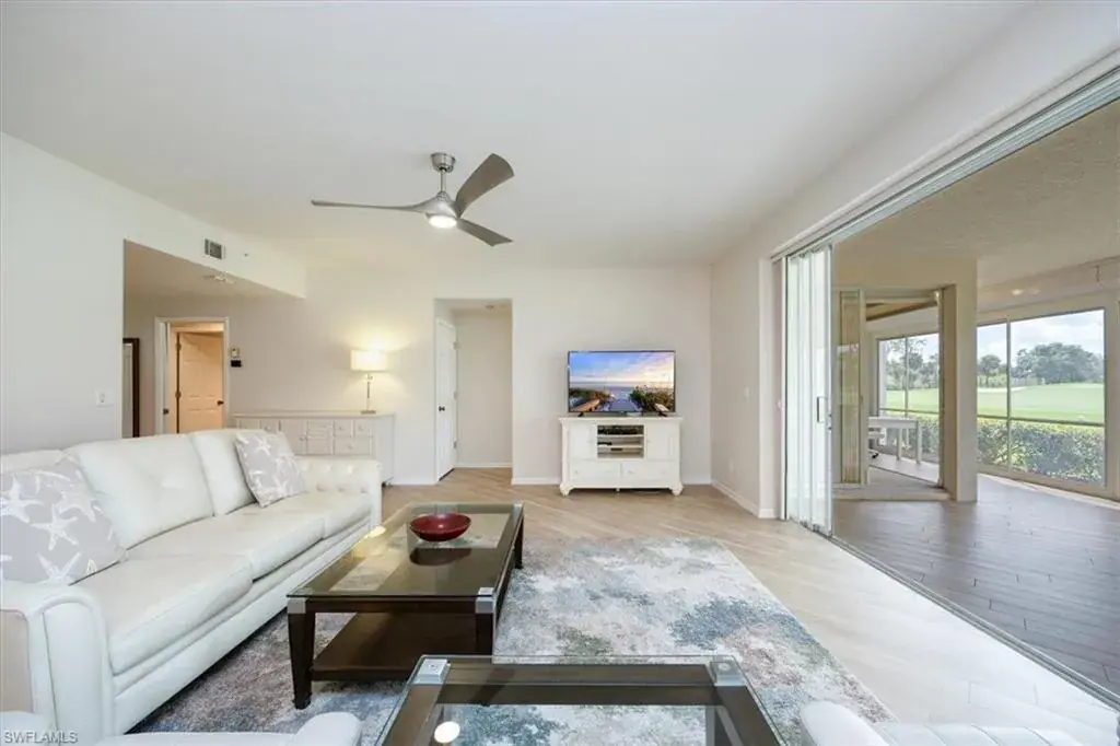 IMMEDIATE GOLF MEMBERSHIP AVAILABLE (Buyer may choose a social membership if desired) when purchasing this immaculate 1st floor 2 BR /2 BA condo with an amazing view of the 4th green and fountain!! The 16’ X 42’ Florida Room becomes an extension of your living area, high ceilings and 30’ of pocketing sliders bring lots of light into your home. No” box car” floor plan, you get the feel of a single family home. Furnished and ready to use for season. Just bring your golf clubs, tennis racket, & bathing suit and you’ll be ready to enjoy Eagle Creek’s country club lifestyle! Exceptional value in a gated golf & tennis community. 5 minute walk to neighborhood pool & spa. Eagle Creek is Naples best kept secret! Only 458 residences set in over 300 acres of mature landscaping. Country Club living at it’s BEST! Buyer has the option of